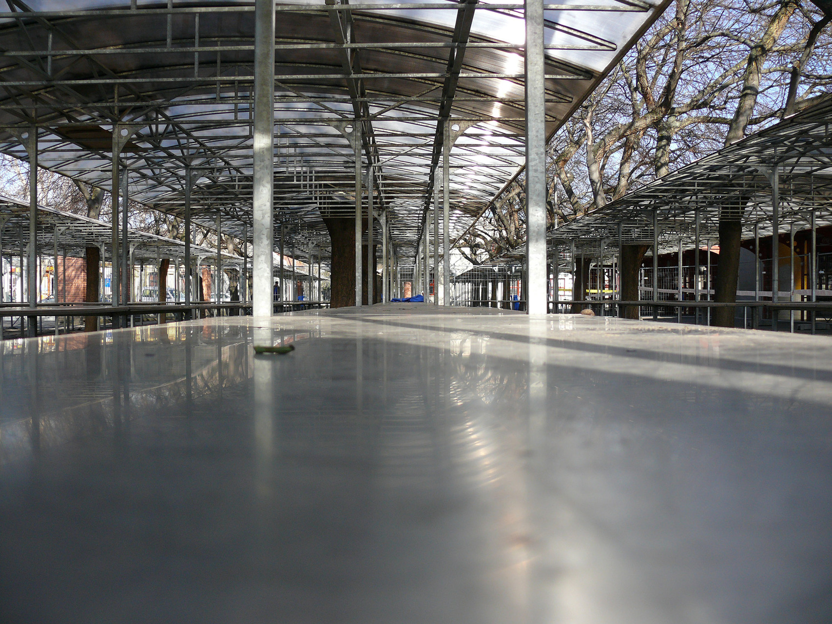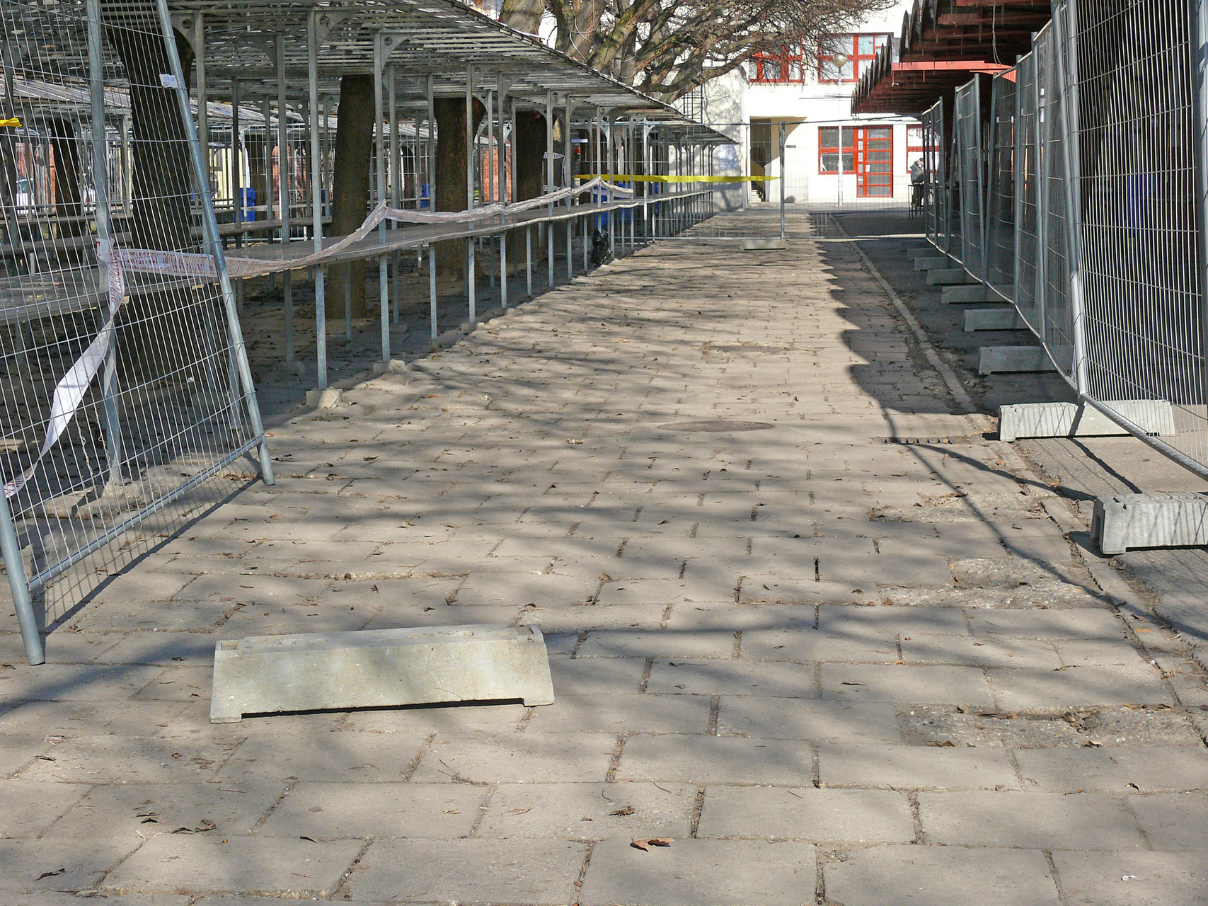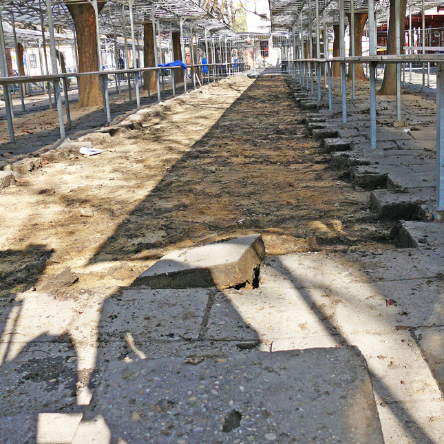 Az elárusító standok közötti közlekedősávok – a meglévő járdalapok elbontásával – új, 6 centiméter vastagságú, sárga, piros és szürke színezetű térburkolatot kapnak. A csere 750 négyzetméteres területet érint. A beruházás során 914 méter szegélyt, valamint föld alatti védőcsöveket helyeznek el a későbbi energetikai és informatikai kábelek kiépítéséhez. A kivitelezést a Duna Aszfalt Kft. végzi el.