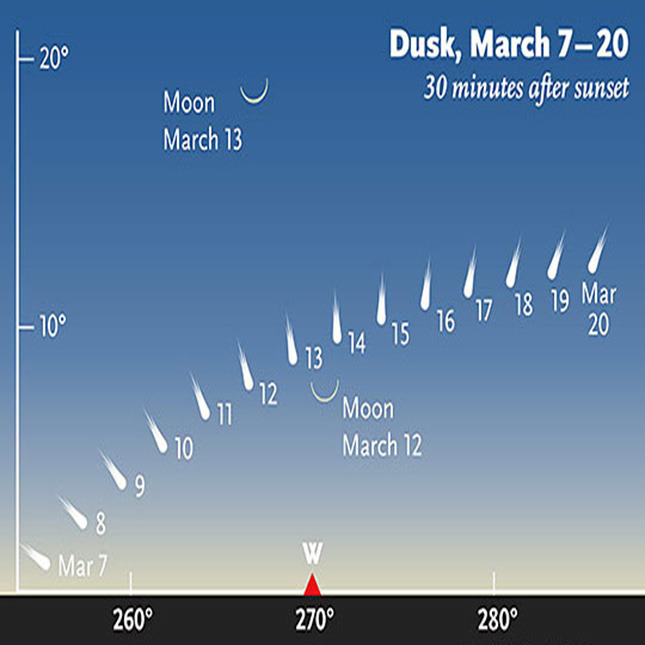 A NASA legfrissebb közleménye szerint a PANSTARRS-üstökös szabad szemmel való megfigyeléshez fűzött reményeik valóra válhatnak. Igaz kissé elmarad a korábban várt fényességétől, mert úgy tűnik, hogy a gáz- és porkibocsátási aktivitása valamelyest lecsökkent, de még így is jól lehet majd látni március első napjaitól alkonyatkor a nyugati égbolton. Az égitest jelenleg a déli féltekéről látható, és nagyjából március 8-tól már hazánkból is érdemes keresni a napnyugta utáni órákban. A kométa március 10-én ér napközelbe, ekkor már viszonylag közel lesz központi csillagunkhoz, a Merkúr távolságán belülre kerül. Magyarországról - reményeink szerint - az erős napsugárzás hatására igencsak aktív üstököst figyelhetünk majd meg, április közepéig szabad szemmel is, utána pedig még hónapokig távcsővel.