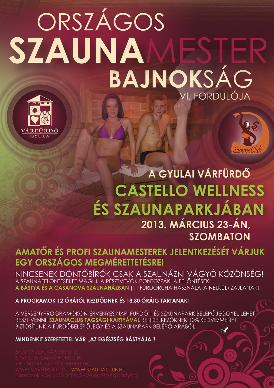 Az országos Szaunamester Bajnokság VI. fordulójának a Gyulai Várfürdő Castello Wellness és Szaunaparkja ad otthont március 23-án. A programok 12 órától kezdődnek és az éjszakai fürdőzés alatt is tartanak. Az ország különböző pontjairól érkező szaunamesterek amatőr és profi kategóriákban mérik össze tudásukat.