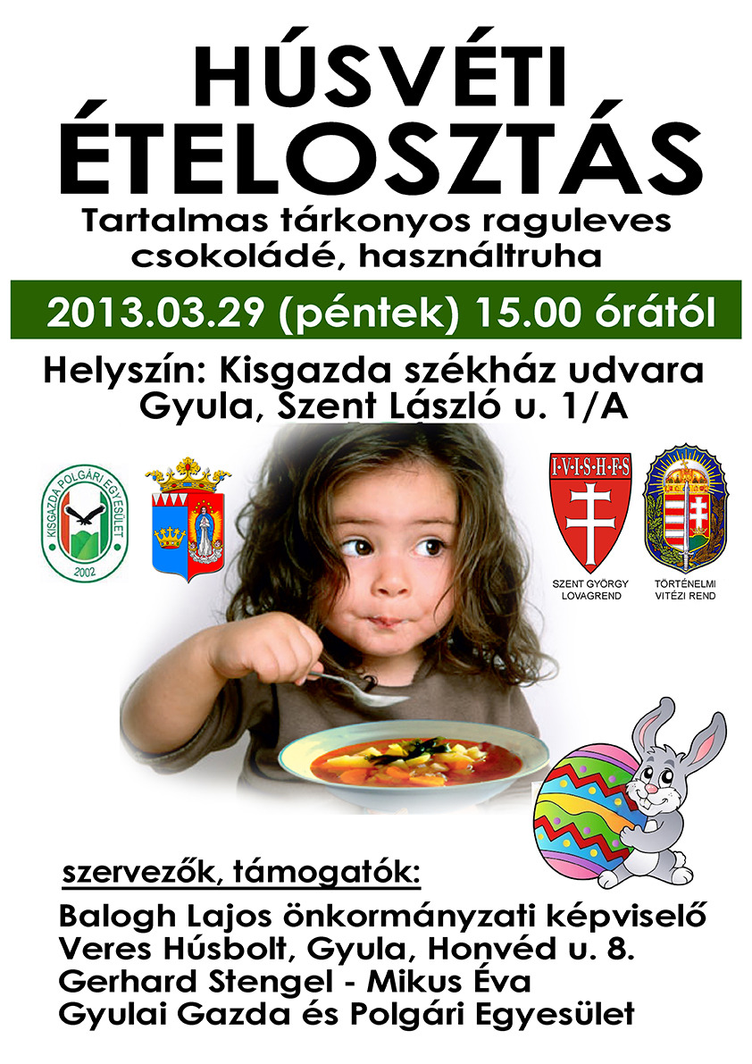 Húsvéti ételosztást szervez Balogh Lajos önkormányzati képviselő, a Kisgazda Polgári Egyesület gyulai elnöke és segítő csapata március 29-én, pénteken 15 órától a Kisgazda Székház udvarán (Gyula, Szent László u. 1/a.).