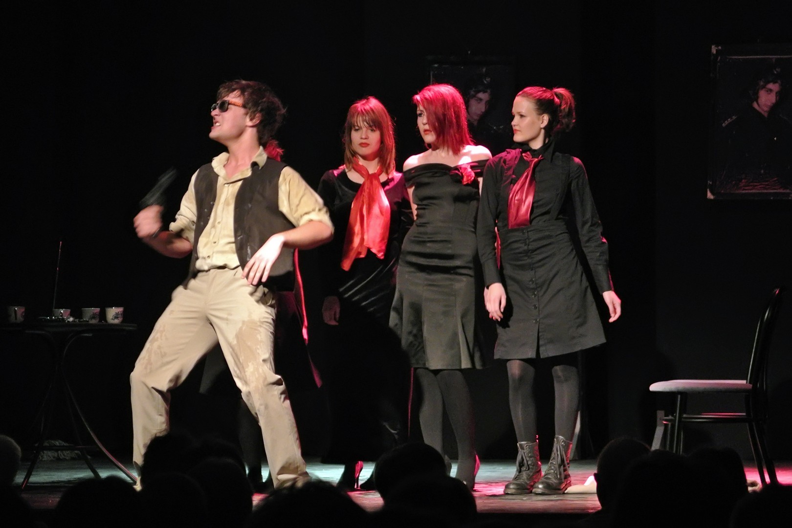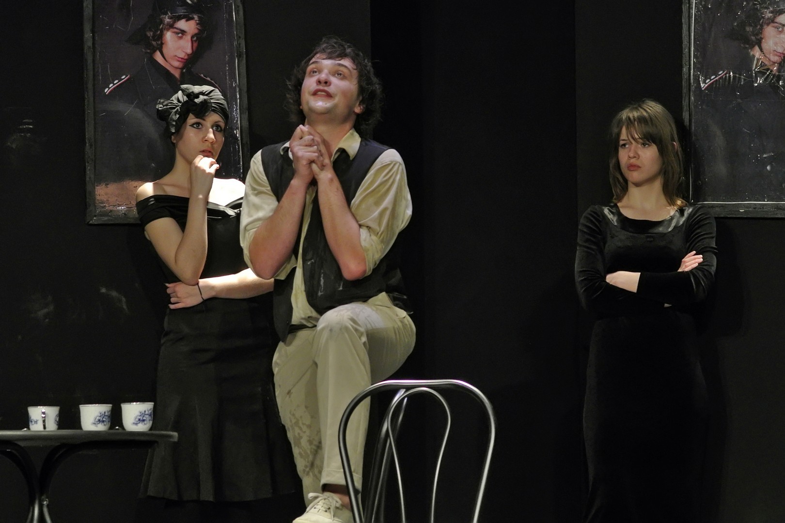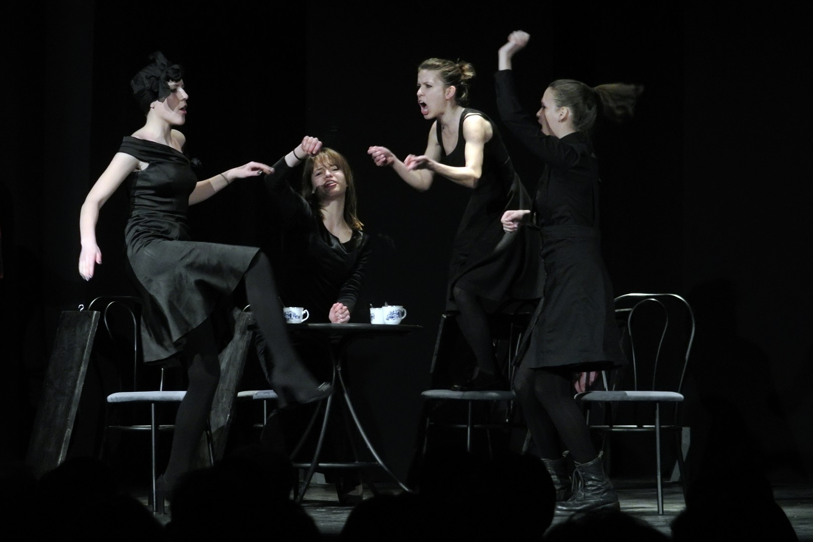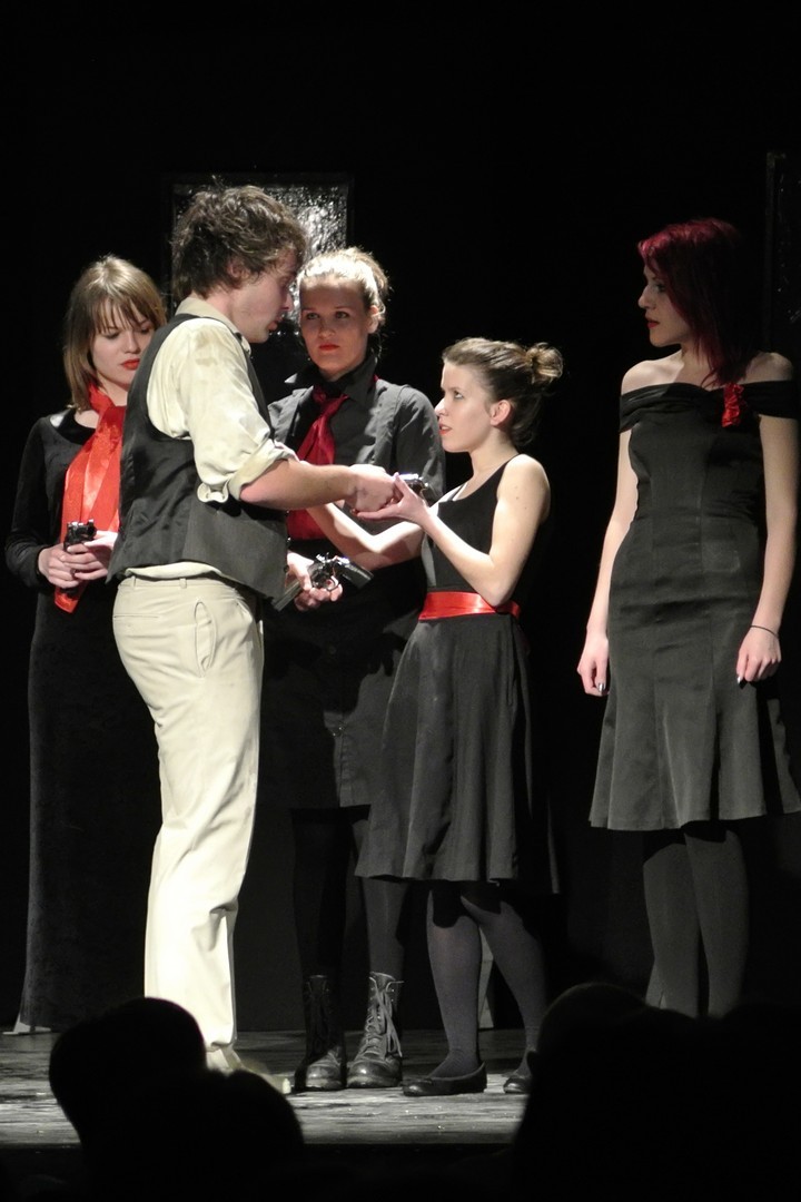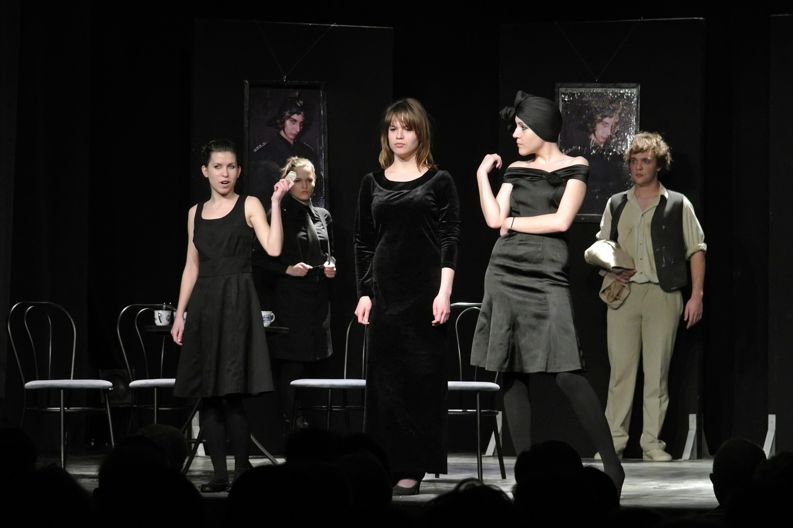 A telt ház előtt bemutatott előadást ötletes rendezői megoldások jellemezték, s a társulat tagjai – fiatal koruk ellenére – derekasan helyt álltak a színpadon. A színjátszó csoport az eredetileg háromszereplős Csehov-drámát tizenegy szereplővel adta elő. Popova Jeléna Ivanovnát és Lúkát, az öreg lakájt is négy fő alakította egyszerre az előadáson. A különböző karakterű, gyászruhába öltözött, „klónozott” özvegyek – akik egyként vettek rész a párbeszédekben – egy-egy női archetípust testesítettek meg. A színpadon, fehérre maszkírozva, megjelent a halott Nyikolaj Mihájlovics is, aki szellemként csak némán tudott perlekedni feleségével, s hol szotyolázva, hol sörözve sétált fel-alá a szereplők között.