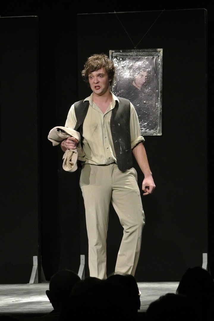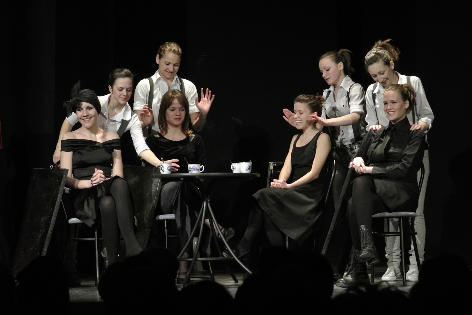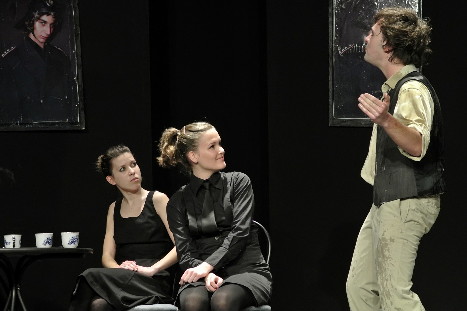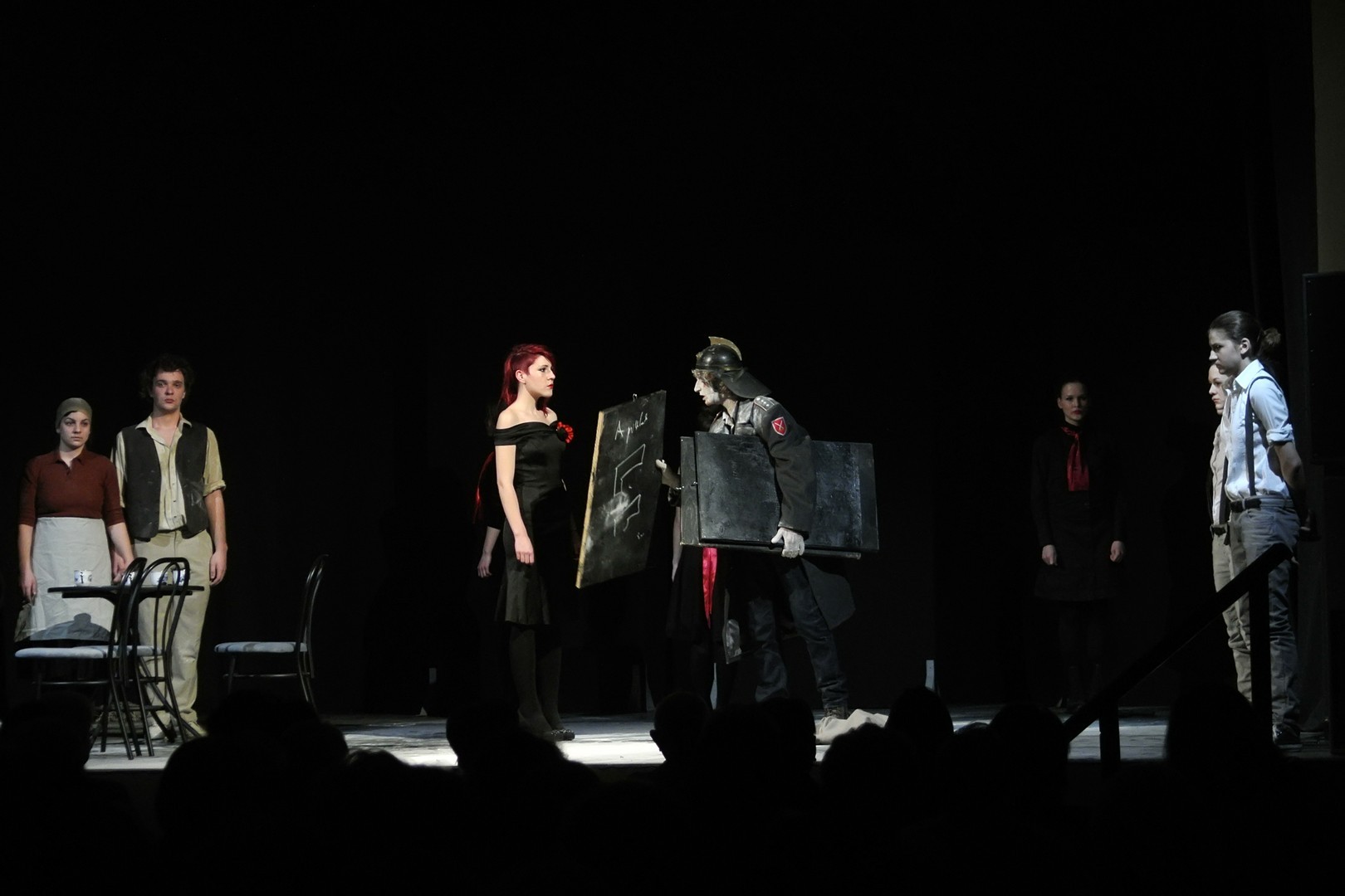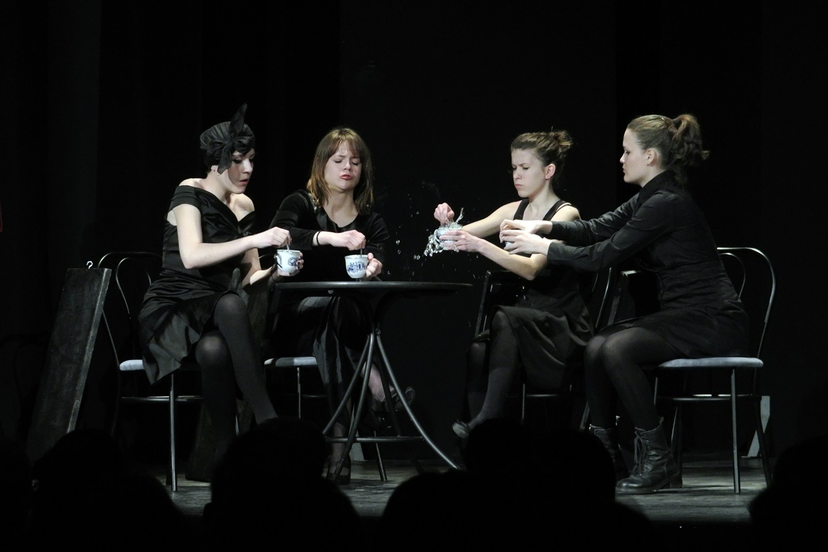A telt ház előtt bemutatott előadást ötletes rendezői megoldások jellemezték, s a társulat tagjai – fiatal koruk ellenére – derekasan helyt álltak a színpadon. A színjátszó csoport az eredetileg háromszereplős Csehov-drámát tizenegy szereplővel adta elő. Popova Jeléna Ivanovnát és Lúkát, az öreg lakájt is négy fő alakította egyszerre az előadáson. A különböző karakterű, gyászruhába öltözött, „klónozott” özvegyek – akik egyként vettek rész a párbeszédekben – egy-egy női archetípust testesítettek meg. A színpadon, fehérre maszkírozva, megjelent a halott Nyikolaj Mihájlovics is, aki szellemként csak némán tudott perlekedni feleségével, s hol szotyolázva, hol sörözve sétált fel-alá a szereplők között.
