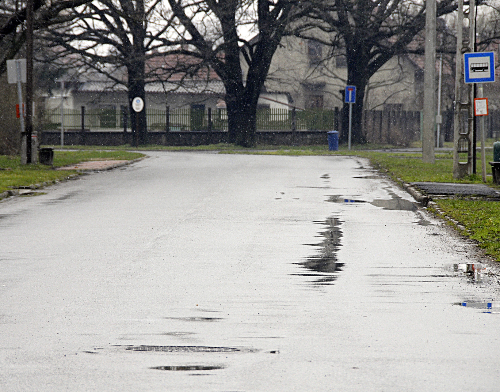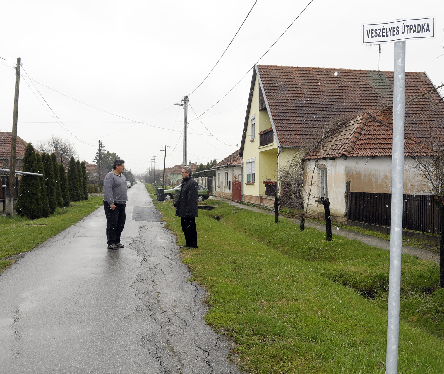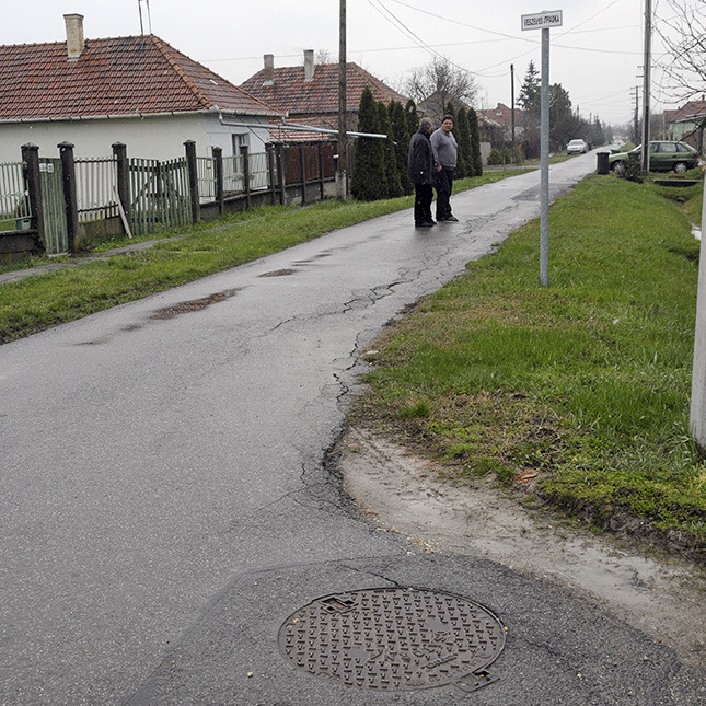 A Darvas József utcában is hatalmas repedések éktelenkednek az aszfalton és úgy, ahogy más helyeken is a padka, illetve a csatornafedő magasságáig aszfaltoztak, így nem tud lefolyni a víz.
