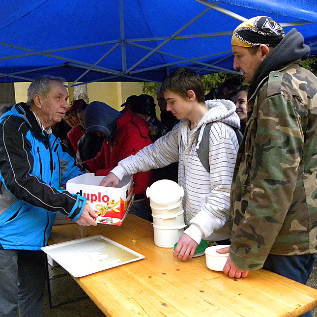 Hétszáz adag tárkonyos ragulevest osztottak ki a rászorulóknak a Gyulai Gazda és Polgári Egyesület által szervezett húsvéti ételosztáson. A szakadó eső ellenére ezúttal is rengetegen gyűltek össze a kisgazda székház udvarán, ahol fél óra alatt minden üst kiürült. A helyszínen Gerhard Stengel csokoládét, Mikus Éva és segítői pedig Ausztriából származó, valamint a kisgazda székház raktárában összegyűjtött használt ruhát osztottak szét.