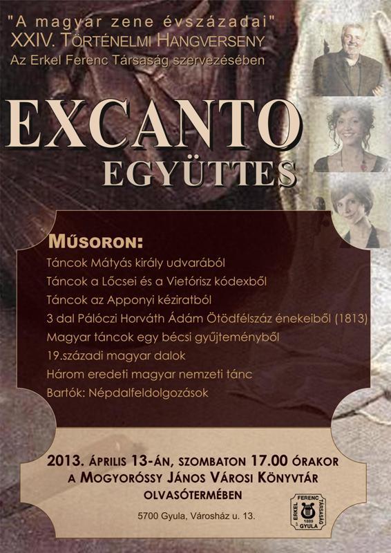 Az Excanto Együttes március 15-én elmaradt koncertjét ezen a héten szombaton, április 13-án, 17 órakor hallhatják-láthatják Gyulán, a Mogyoróssy János Városi Könyvtárban. Az Erkel Ferenc Társaság XXIV. Történelmi Hangverseny zenei programjának műsorában elsősorban középkori, reneszánsz és barokk zene szerepel, de a Kóta-díjjal kitüntetett együttes szívesen játszik későbbi korok szerzőitől is olyan műveket, amelyek megszólaltathatók az adott hangszer-összeállításban.