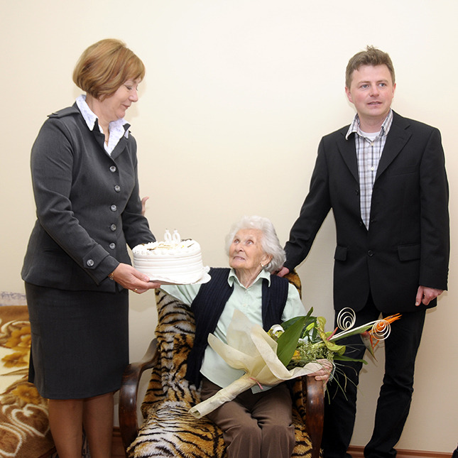 99. születésnapja alkalmából Kovács Béláné Anna nénit köszöntötte ma délelőtt a városvezetés Gyulaváriban, a Kastélykert Idősek Apartmanházában. Dr. Varga Erzsébet aljegyző és Alt Norbert alpolgármester virágcsokorral és tortával ajándékozta meg a csaknem évszázadot élt szépkorú nénit.