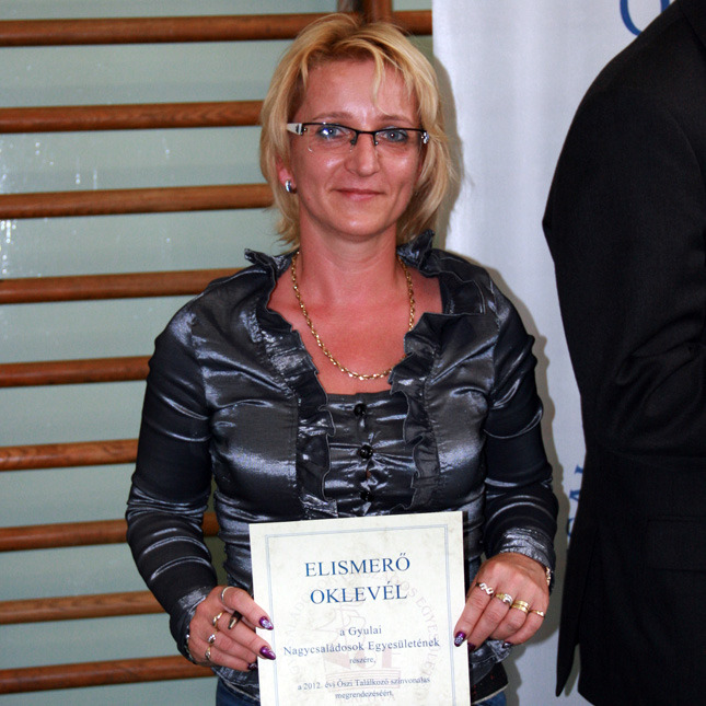 - A Nagycsaládosok Országos Egyesülete minden évben egyszer elismeri, megköszöni a támogatók segítségét, a hosszú időn át egyesületekért önkéntesen tevékenyekedő tagok, tagegyesületek kiemelkedő munkáját. A múlt évben a város támogatásával egyesületünk rendezhette meg a Nagycsaládosok Őszi Találkozóját. A rendezvényre az ország minden pontjából érkeztek mintegy 300 településről. A visszajelzések és ajánlások által elismerő oklevélben részesültünk, amelyet nagy örömmel vettünk át Budapesten - tájékoztatta a Gyulai Hírlapot Szendreiné Dudás Ildikó elnök.