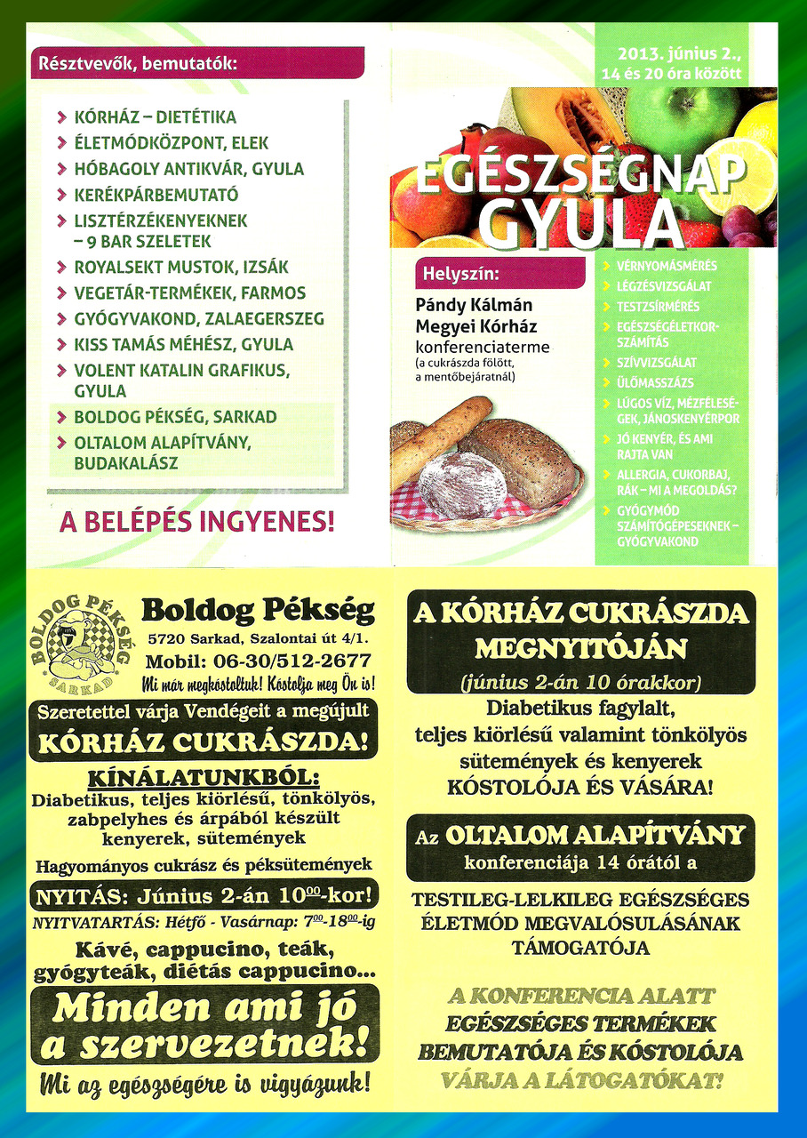 Az egészségnap keretében bemutatkozik több termelő és egyéb szervezet, és különböző ingyenes szűréseken is részt vehetnek az érdeklődők. Az Oltalom Alapítvány a testileg-lelkileg egészséges életmódról 14 órától tartja konferenciáját.