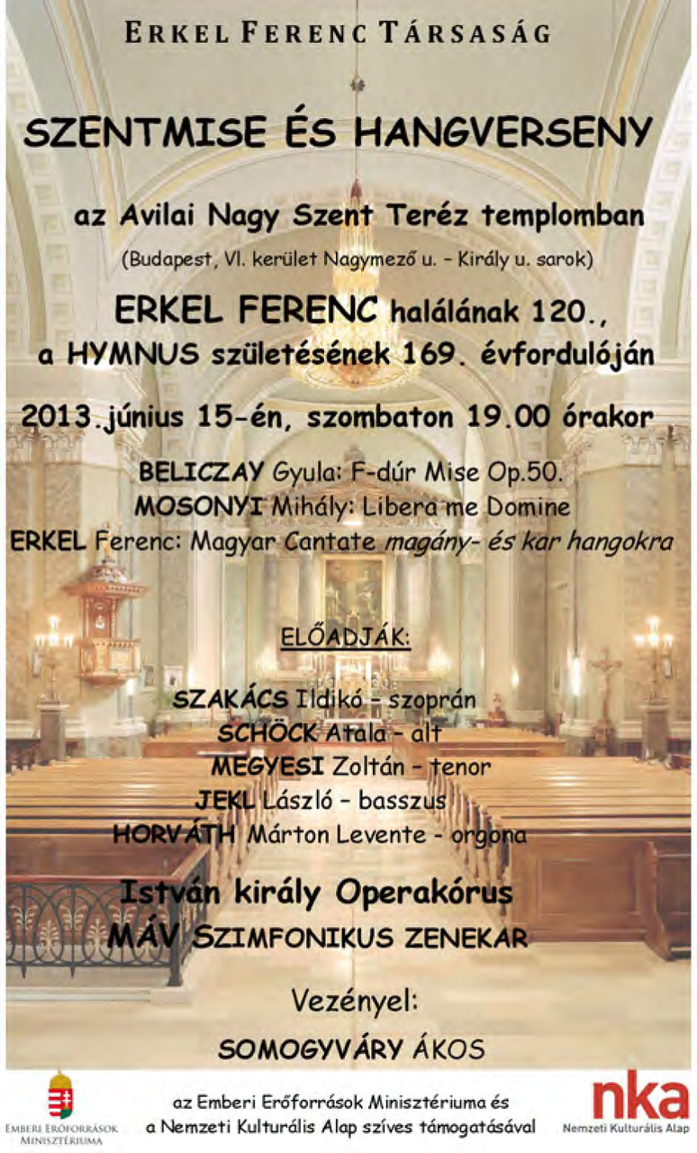 A nap folyamán, 19 órától a társaság a magyar nemzeti opera megteremtője előtt szentmisével és hangversennyel is tiszteleg az Avilai Szent Teréz templomban (Budapest, VI. kerület Nagymező utca – Király utca sarok). A műsorban elhangoznak Beliczay Gyula, Mosonyi Mihály és természetesen Erkel Ferenc művei. A hangversenyt vezényli Somogyváry Ákos, az Erkel Ferenc Társaság elnöke.