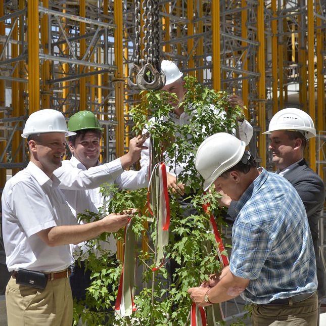 A szokásrendet követve a bokrétára, illetve fácskára szalagokat fűztek a jelenlévők, melyet az épület legmagasabb pontján daru segítségével helyeztek el a szakemberek.