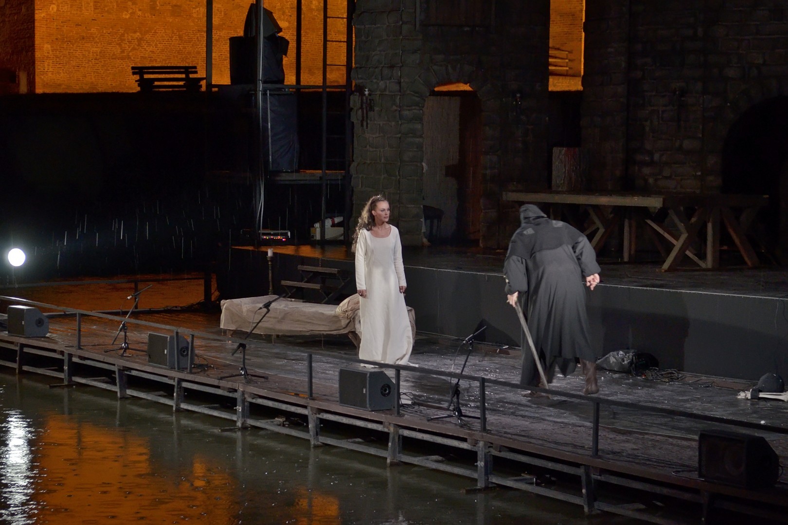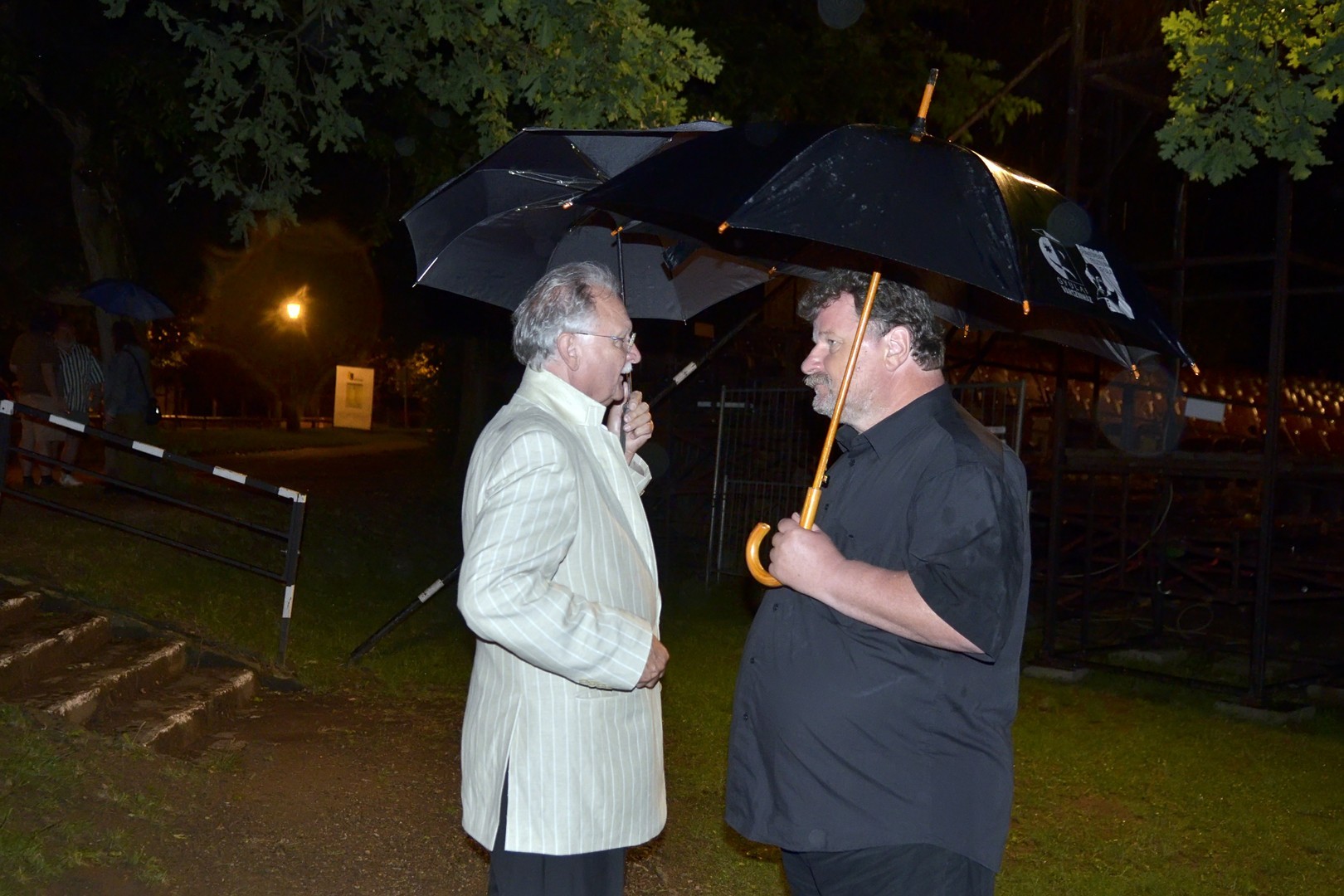 Ennél a résznél érezhető volt, nem hiába morajlott az ég órák óta, s ekkor már a színpad melletti platán és ostorfa leveleinek zúgása is szinte túlharsogta a darabot. A háromfelvonásos mű színészeinek hangja már korábban is sokat küzdött a széllel, ugyanakkor a kitartó közönségen is látszott, csak vonakodva hagyja ott a színes szabadtéri színházi képeket. Amikor a nagyobbacska cseppek már határozott ütemben hullottak a sötét égből, és már csak a szolidáris szívósabbja ült a nézőtéren, Balázs Péter, a szolnoki színház Kossuth-díjas direktora megkegyelmezett a becsületesen játszó színészeknek, és elegánsan türelemre intette a közönséget. A zuháré csak nem akart elállni, a publikum pedig éjfél után inkább hazafelé vette az irányt, így sajnos hamarosan már csak a díszlet bontói játszottak szerepeket a színpadon.
