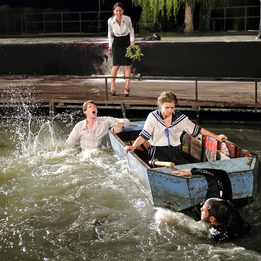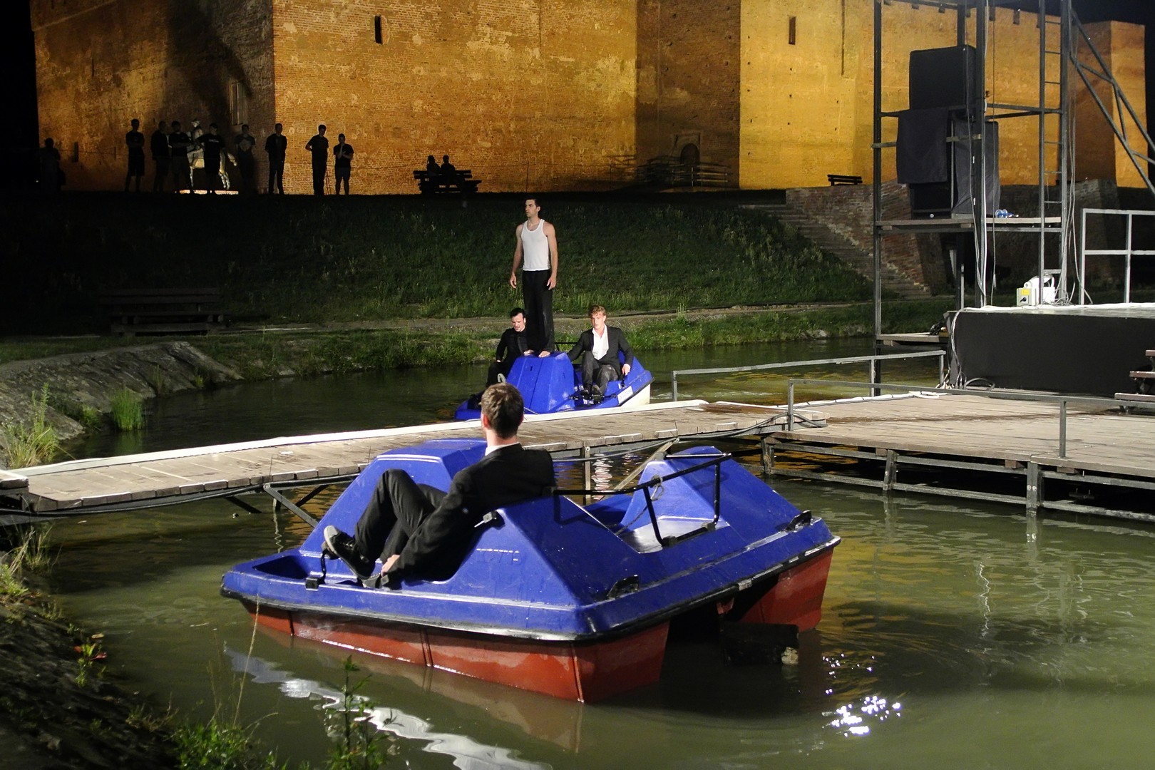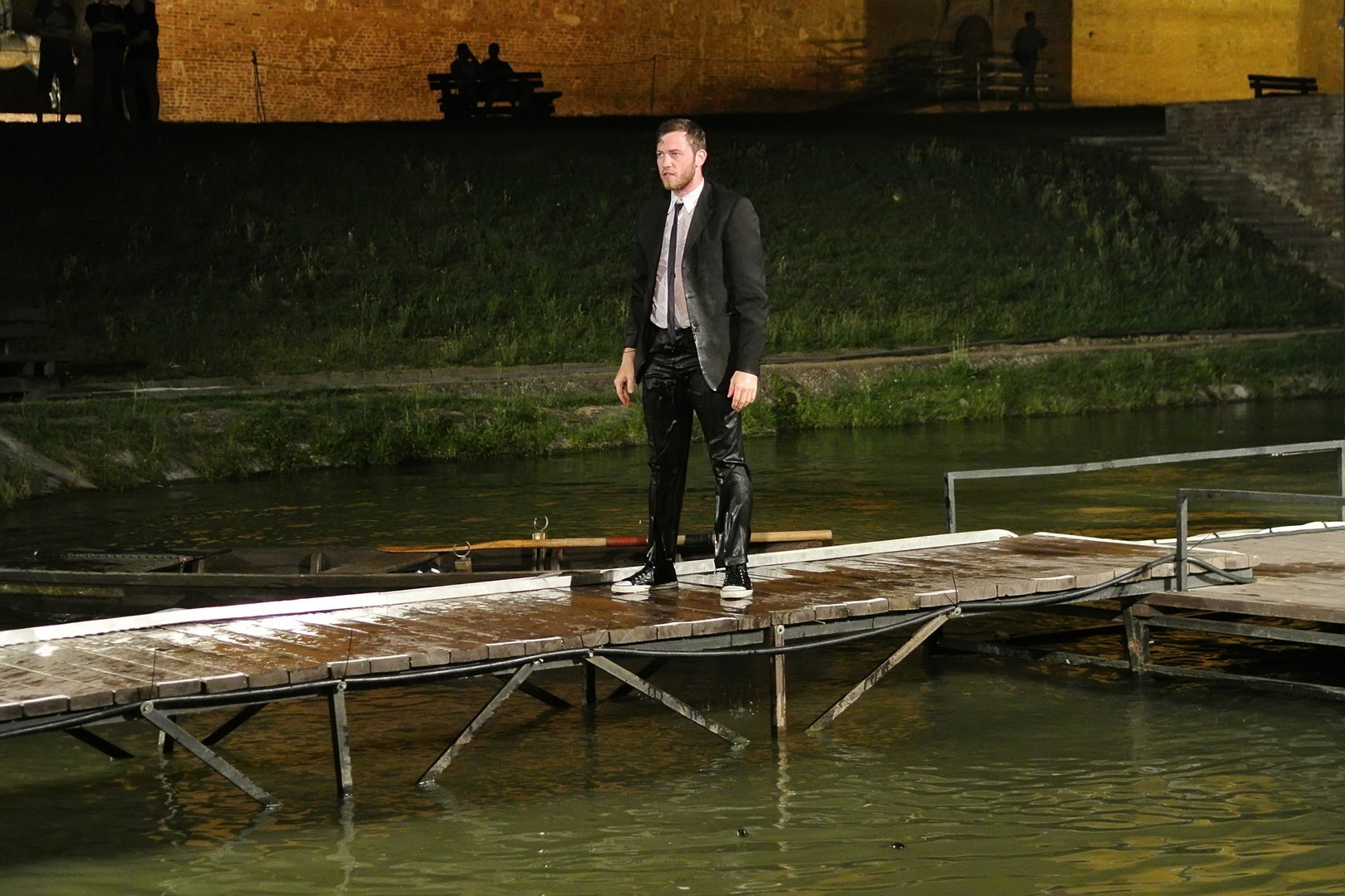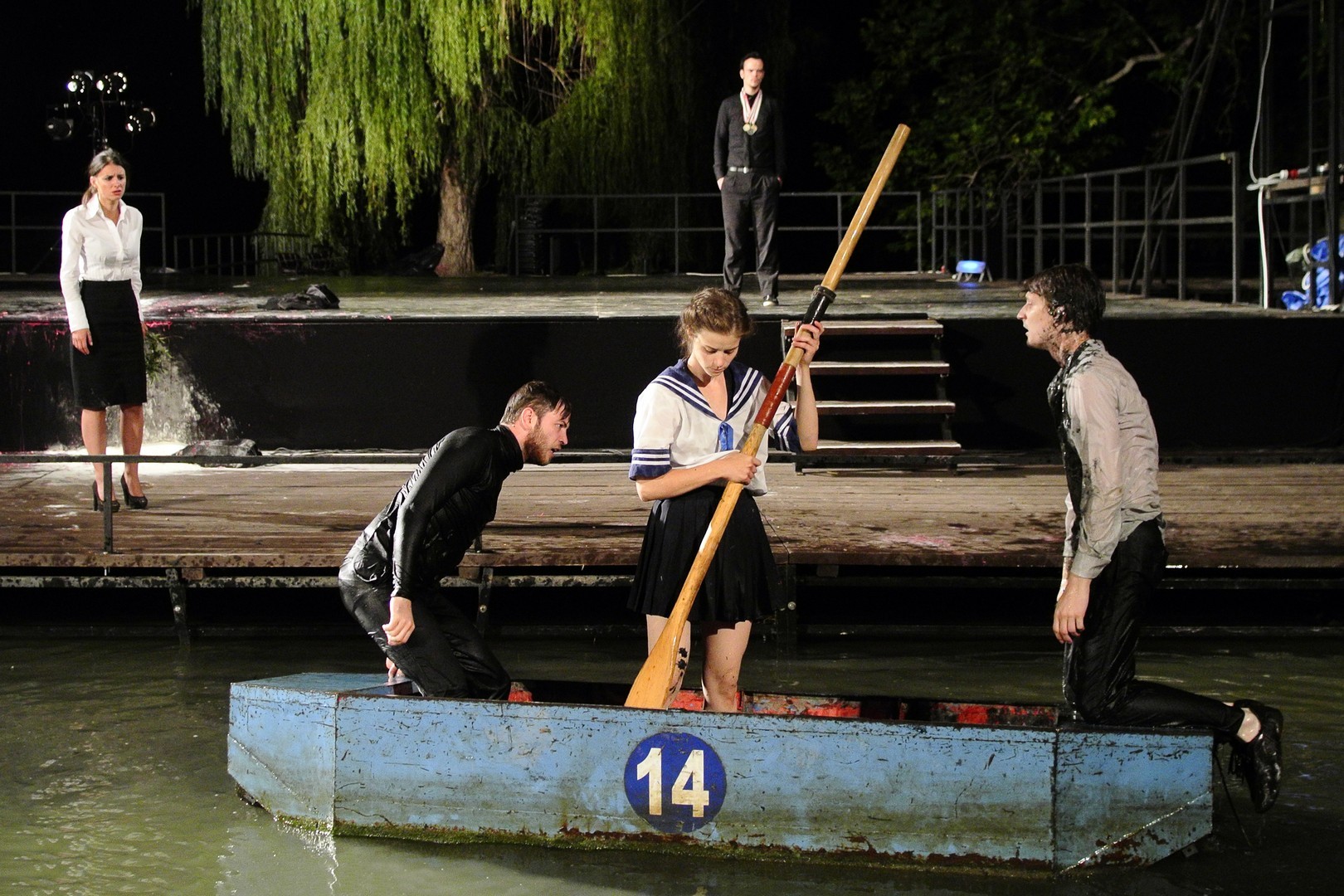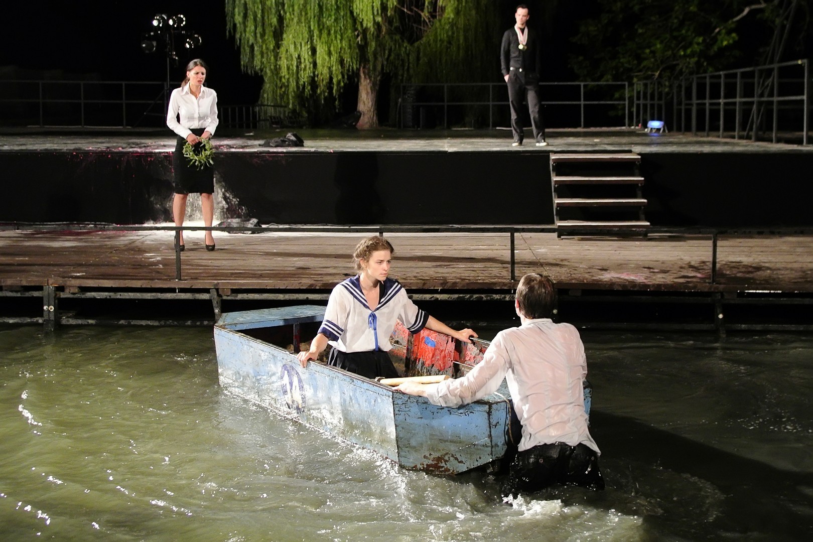 A másfél órás felvonást Hamlet monológja törte meg, amelyet már a vár előtt lévő lovas szobor előtt láthatott a nagyérdemű. Az előadás következő részében újra helyváltoztatásra kényszerült a színházlátogató, és már a megszokott nézőtérről nézte tovább a színpadon, csónakban, vízibiciklin és a vízben történő cselekményeket. A díszletet és jelmezt senki sem hiányolta, a különleges előadás anélkül is feledhetetlen élményt nyújtott a közönségnek.