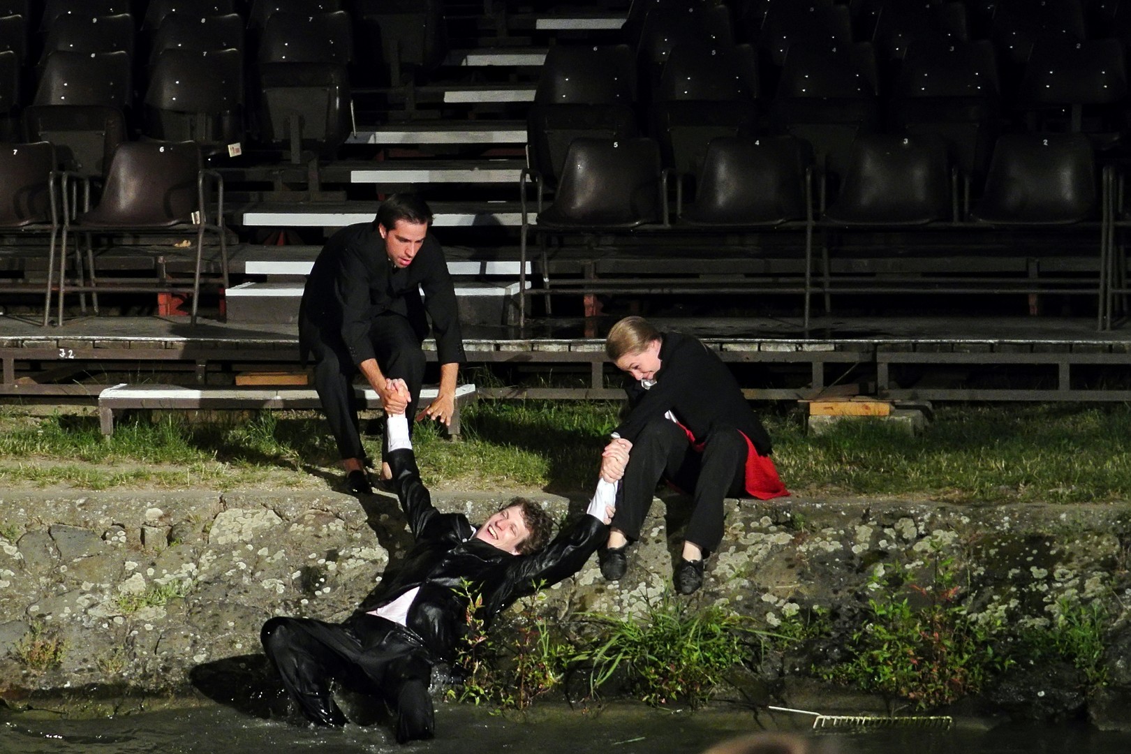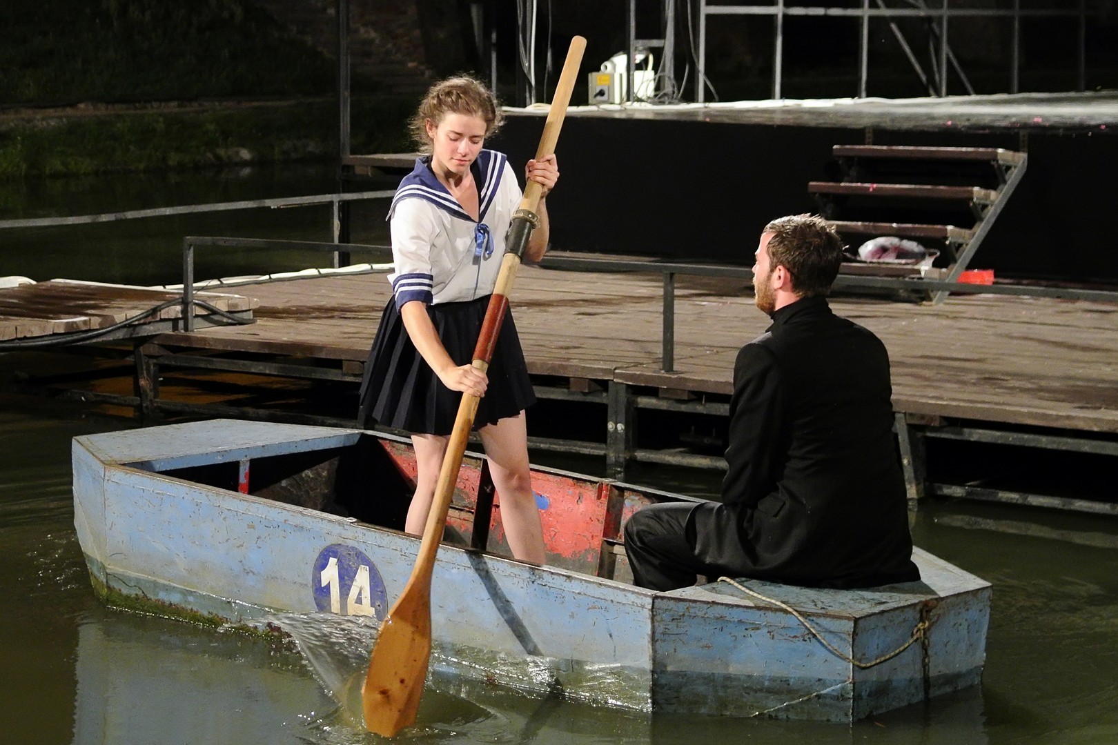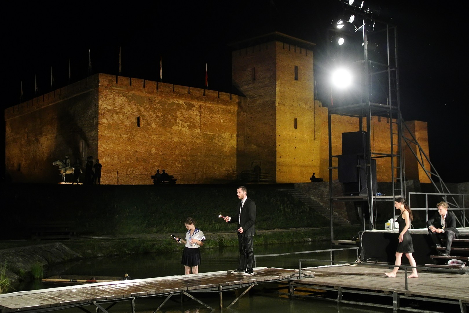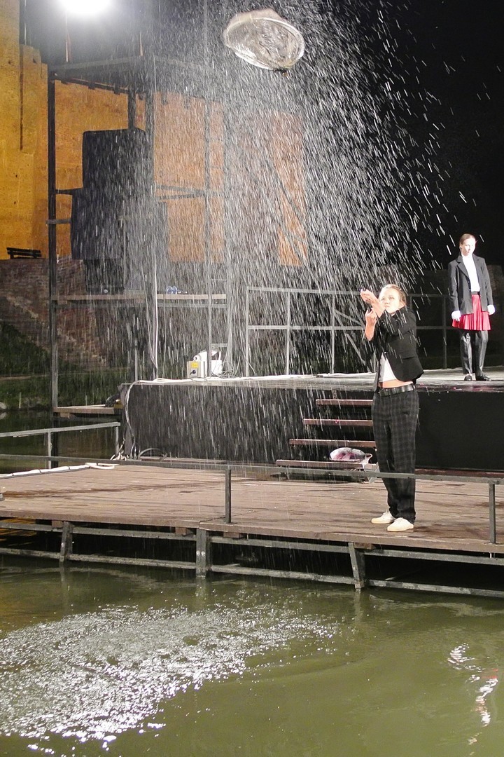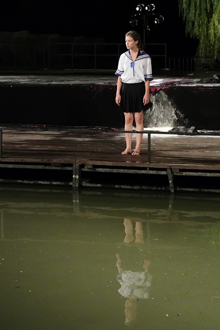 A másfél órás felvonást Hamlet monológja törte meg, amelyet már a vár előtt lévő lovas szobor előtt láthatott a nagyérdemű. Az előadás következő részében újra helyváltoztatásra kényszerült a színházlátogató, és már a megszokott nézőtérről nézte tovább a színpadon, csónakban, vízibiciklin és a vízben történő cselekményeket. A díszletet és jelmezt senki sem hiányolta, a különleges előadás anélkül is feledhetetlen élményt nyújtott a közönségnek.