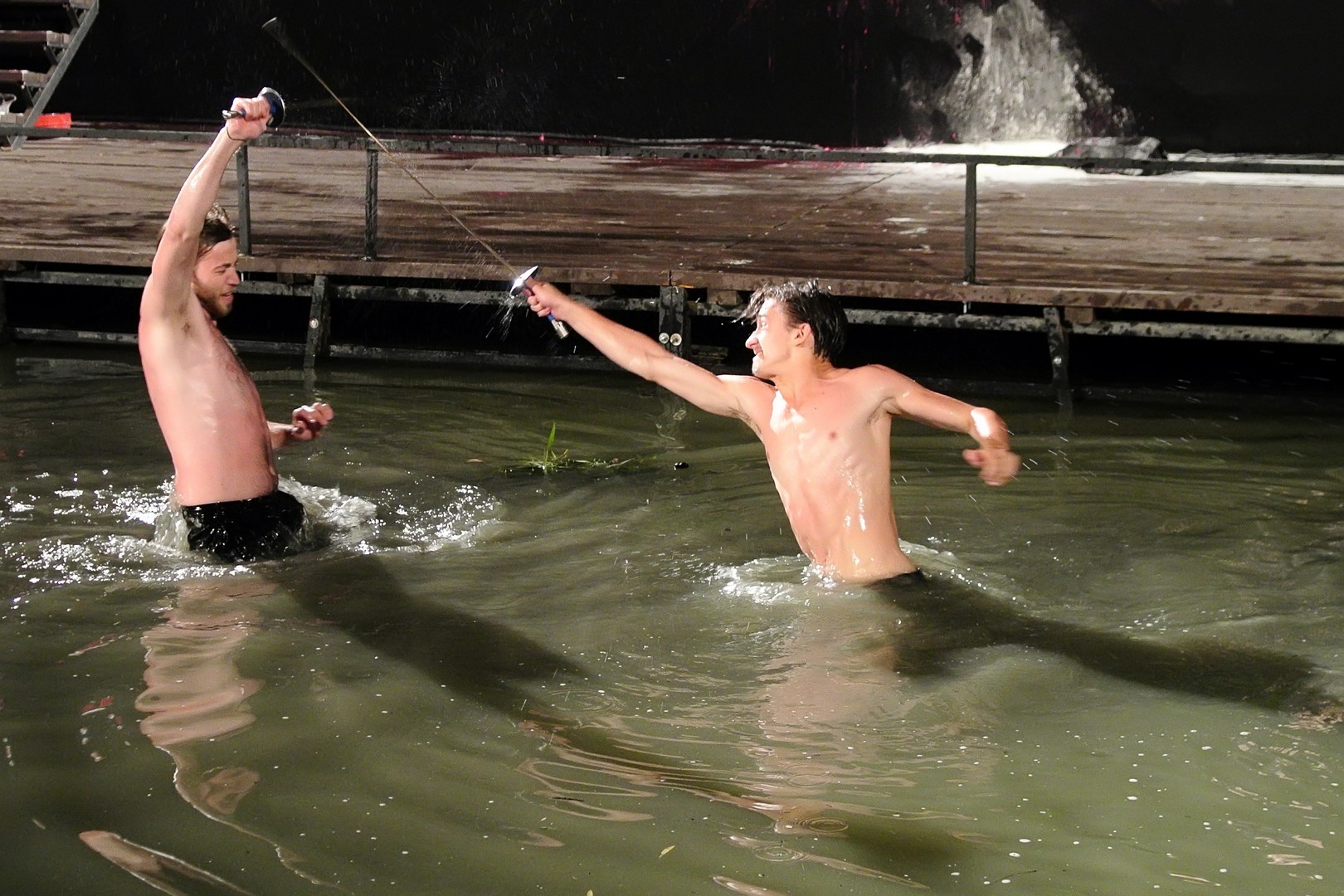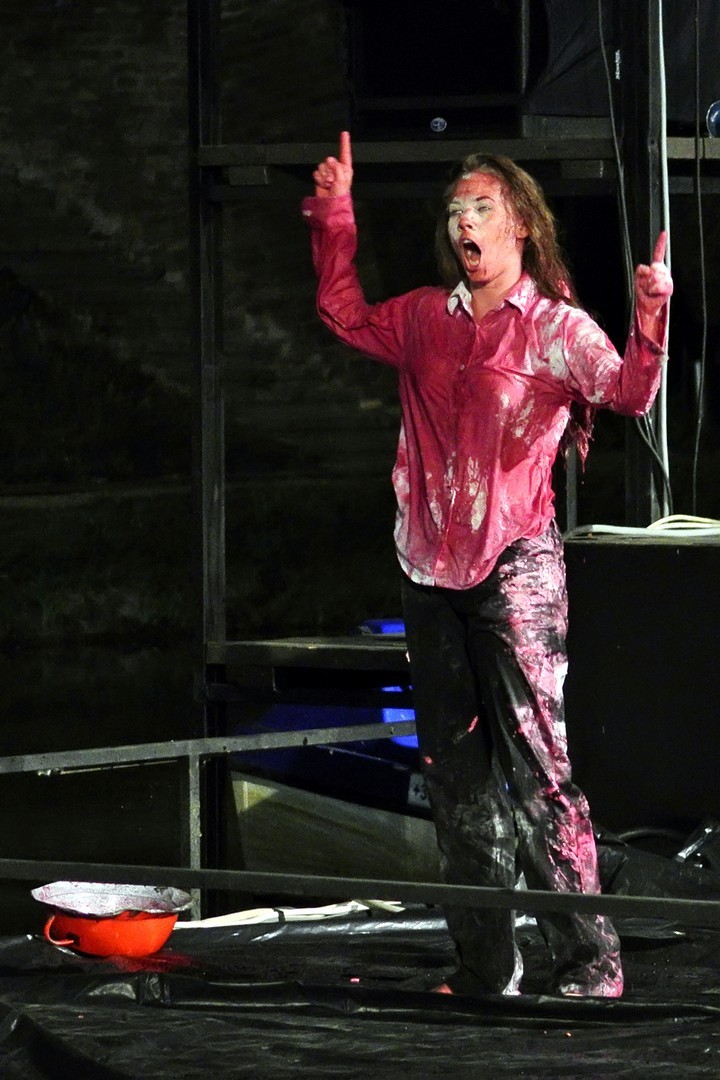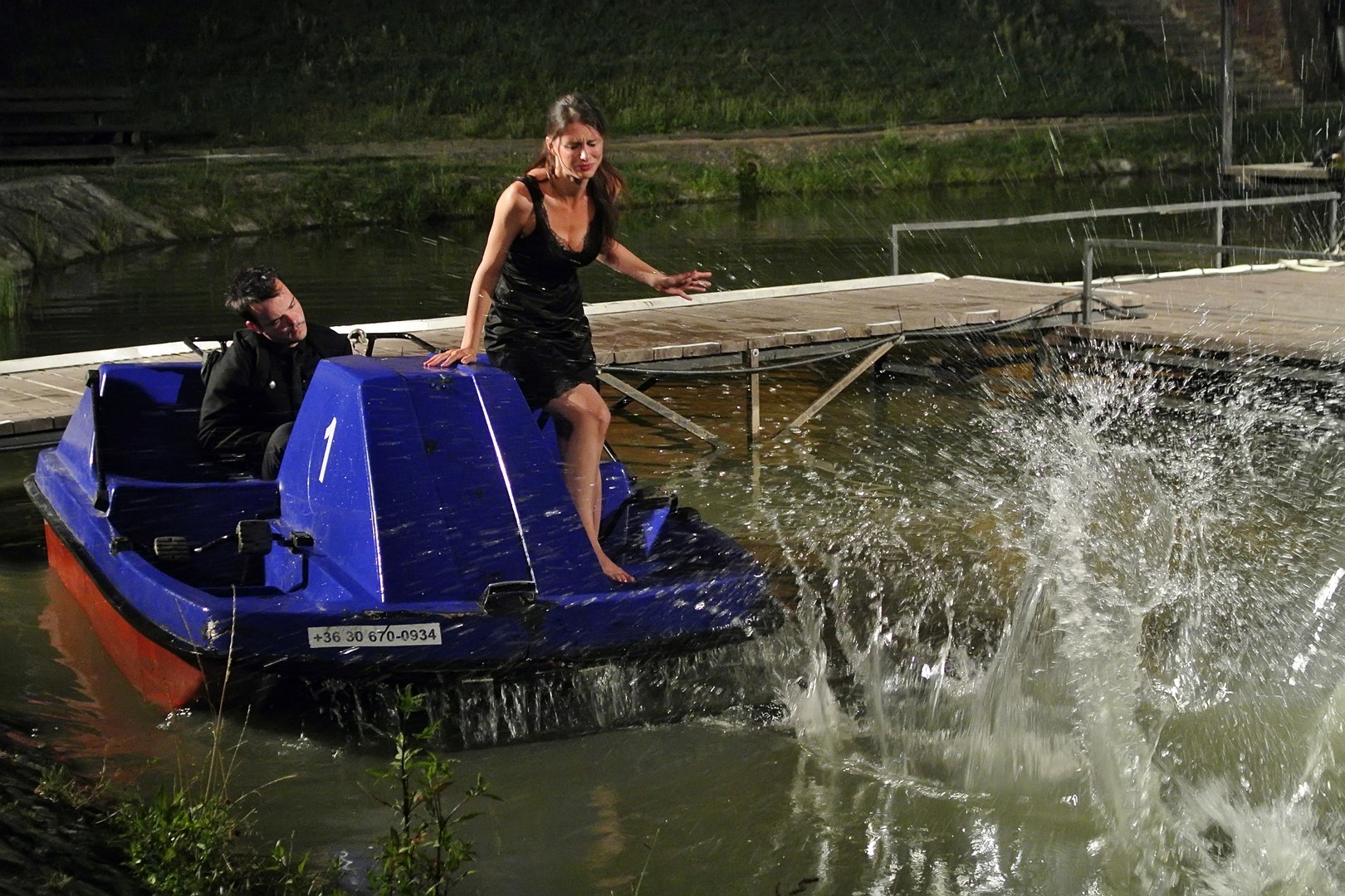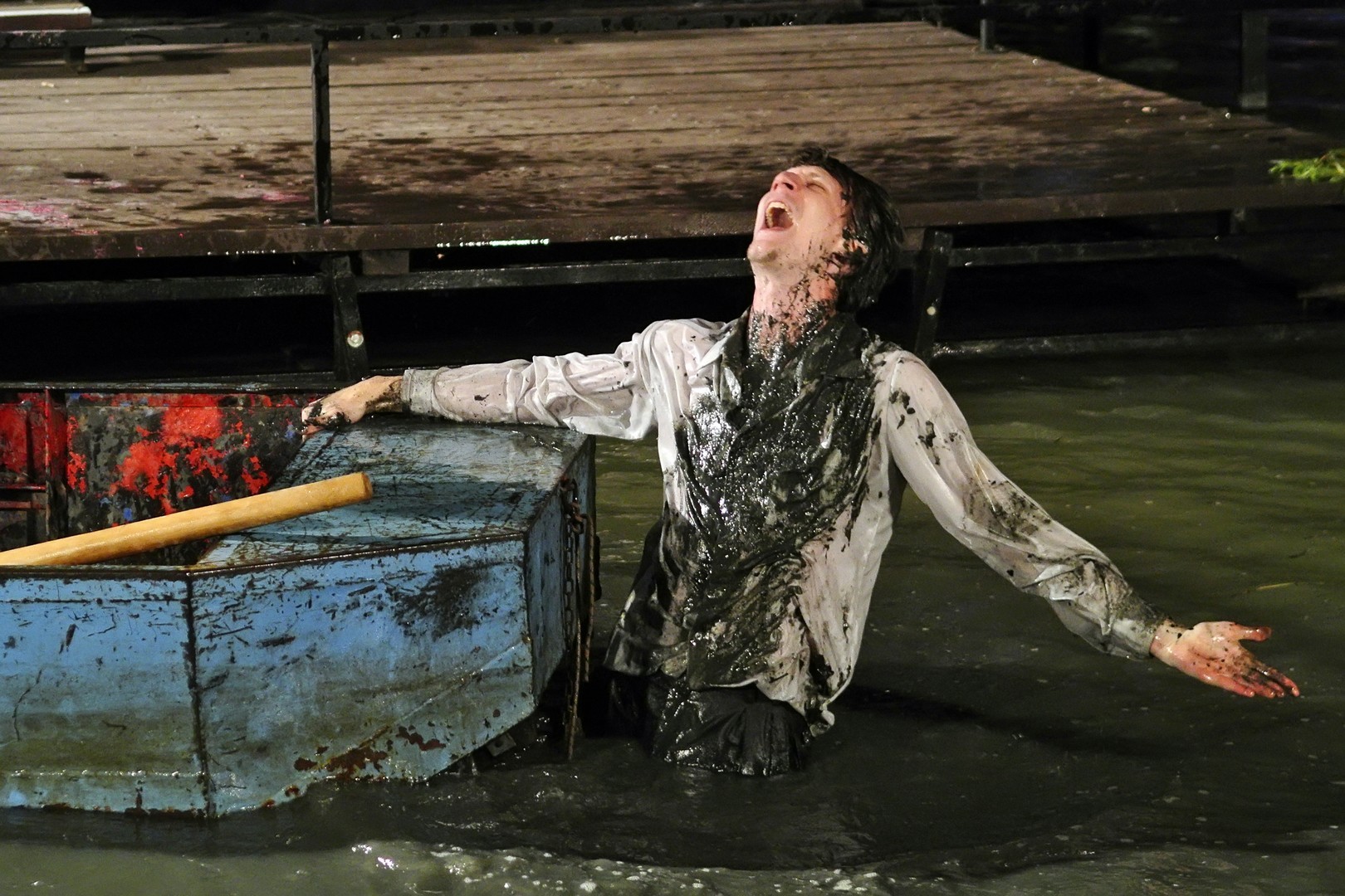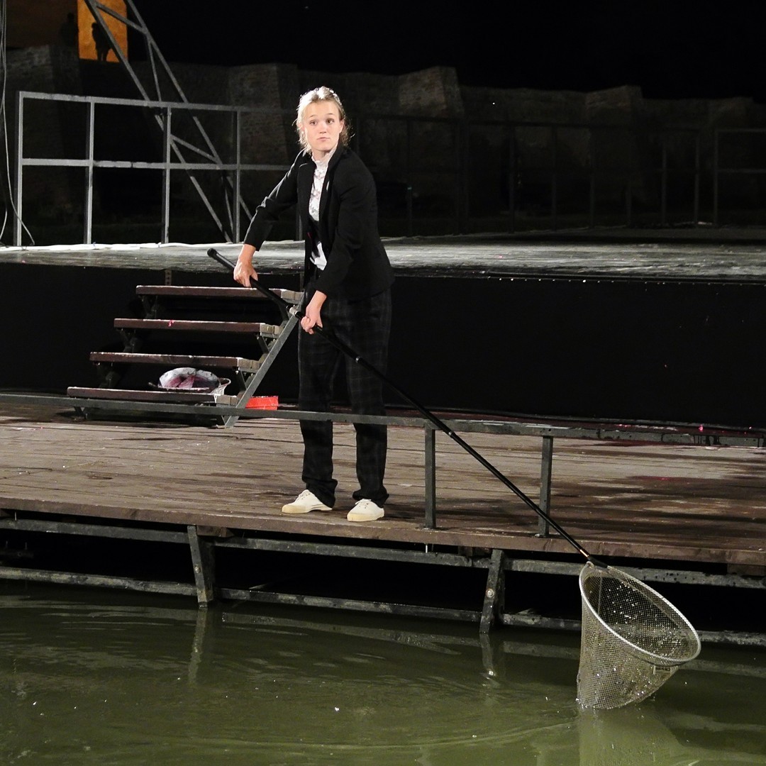 A másfél órás felvonást Hamlet monológja törte meg, amelyet már a vár előtt lévő lovas szobor előtt láthatott a nagyérdemű. Az előadás következő részében újra helyváltoztatásra kényszerült a színházlátogató, és már a megszokott nézőtérről nézte tovább a színpadon, csónakban, vízibiciklin és a vízben történő cselekményeket. A díszletet és jelmezt senki sem hiányolta, a különleges előadás anélkül is feledhetetlen élményt nyújtott a közönségnek.