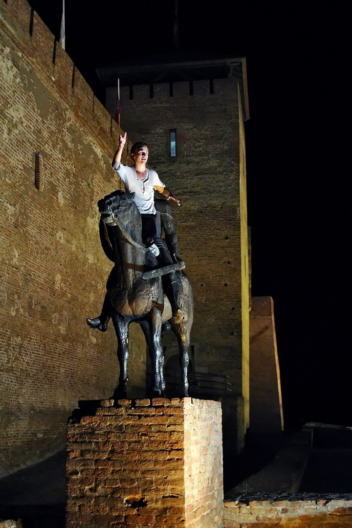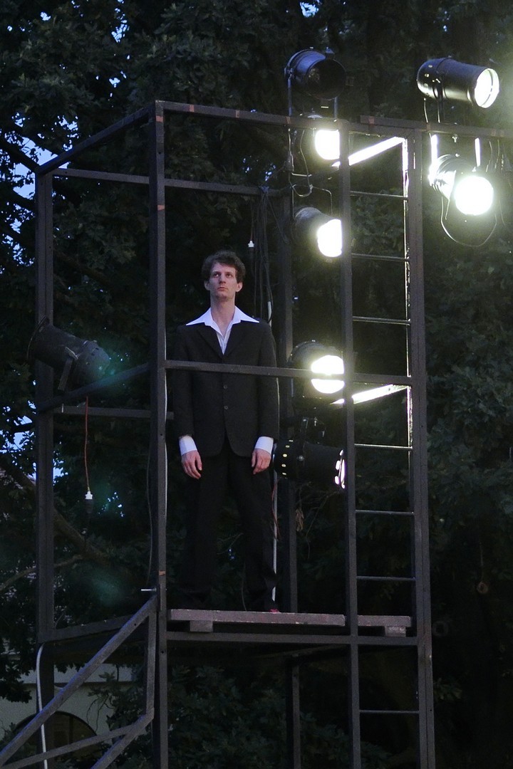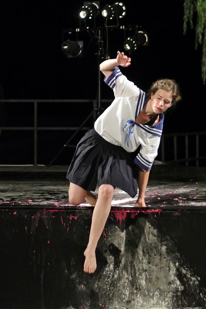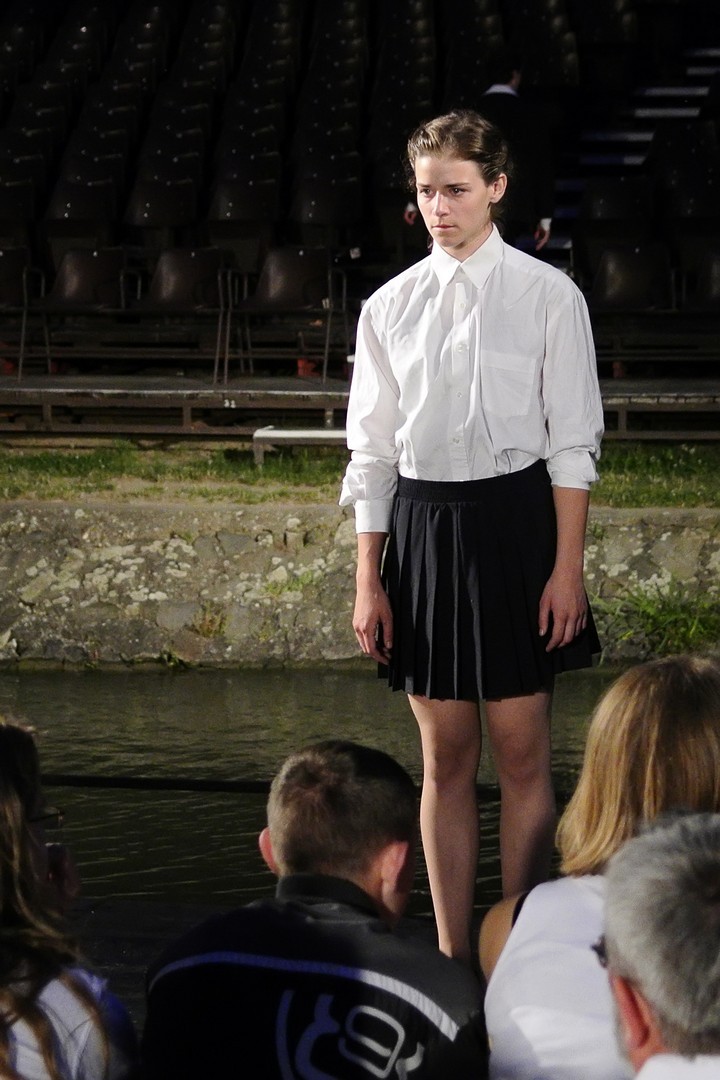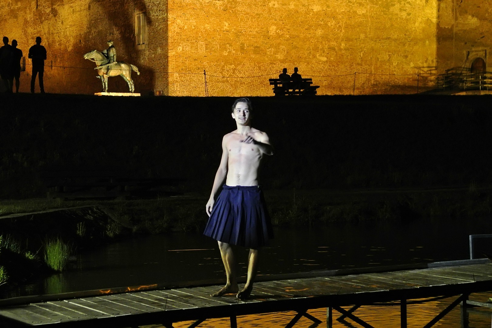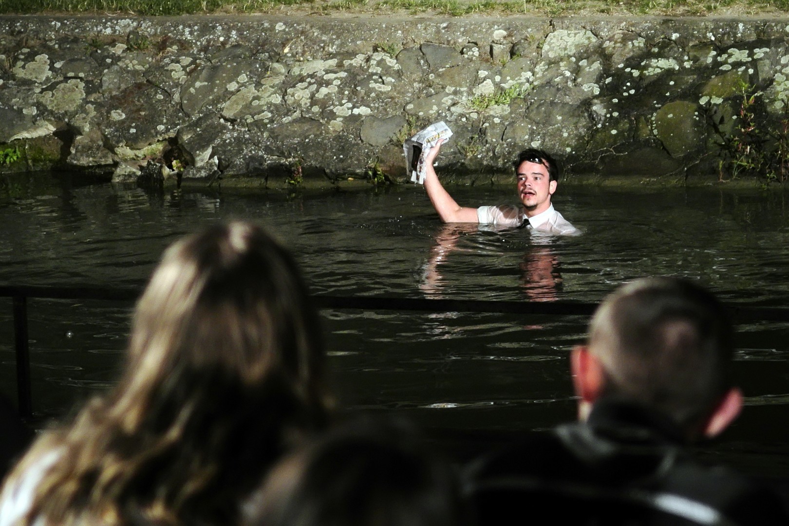 A másfél órás felvonást Hamlet monológja törte meg, amelyet már a vár előtt lévő lovas szobor előtt láthatott a nagyérdemű. Az előadás következő részében újra helyváltoztatásra kényszerült a színházlátogató, és már a megszokott nézőtérről nézte tovább a színpadon, csónakban, vízibiciklin és a vízben történő cselekményeket. A díszletet és jelmezt senki sem hiányolta, a különleges előadás anélkül is feledhetetlen élményt nyújtott a közönségnek.