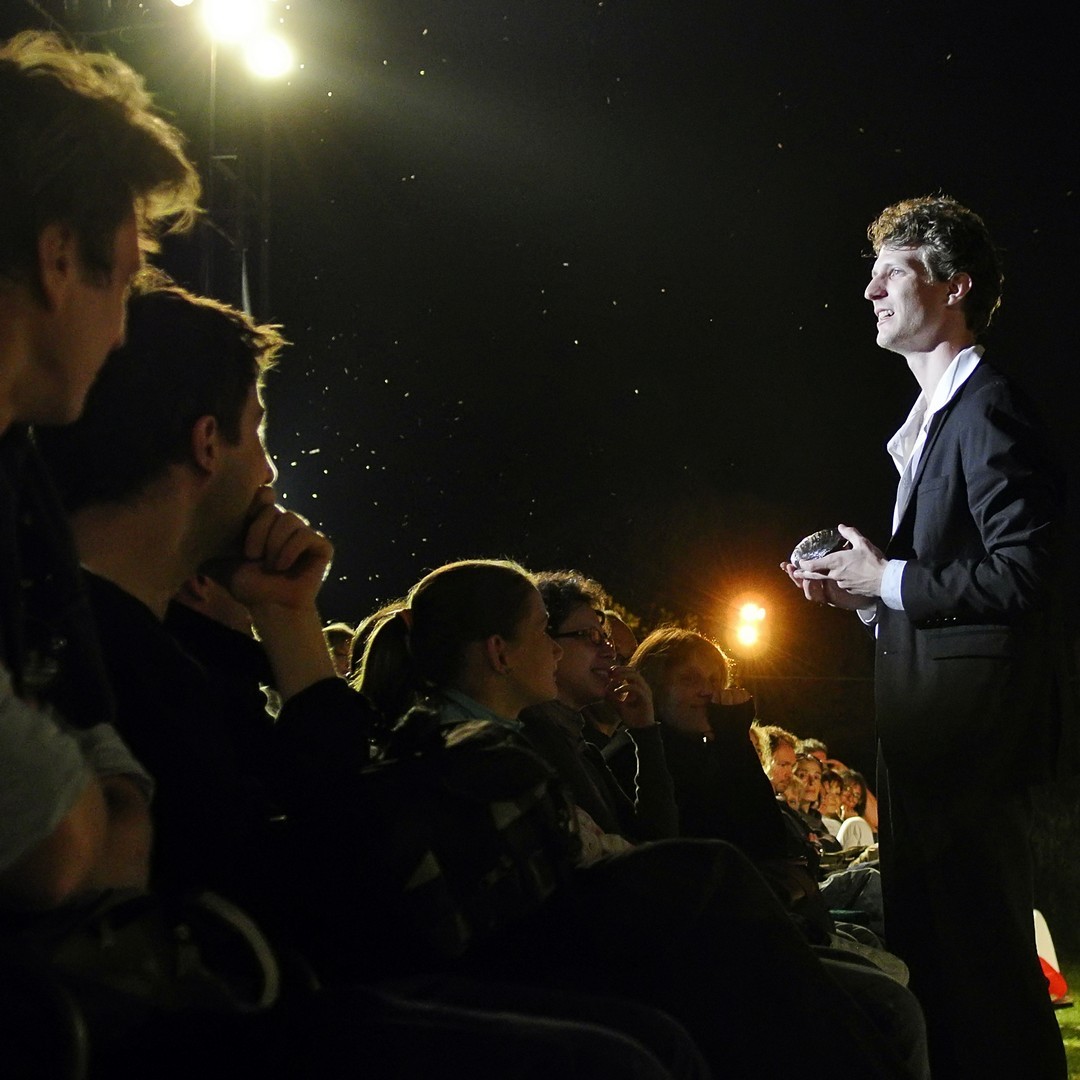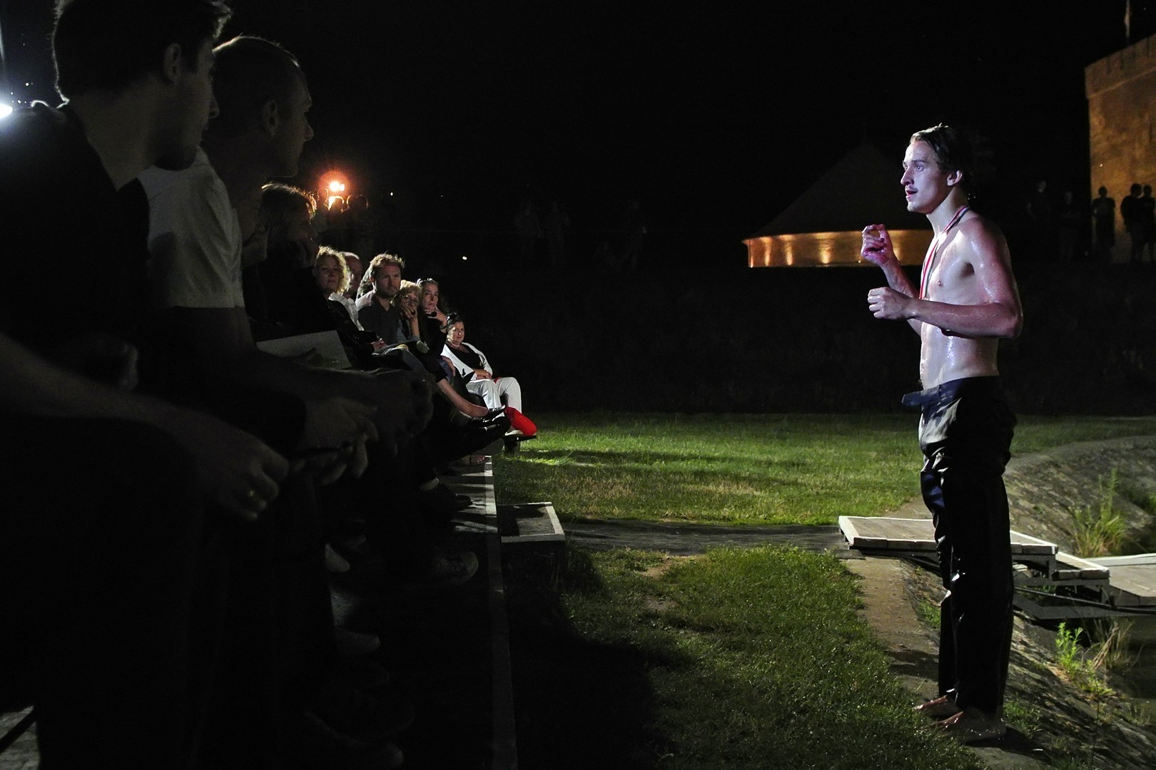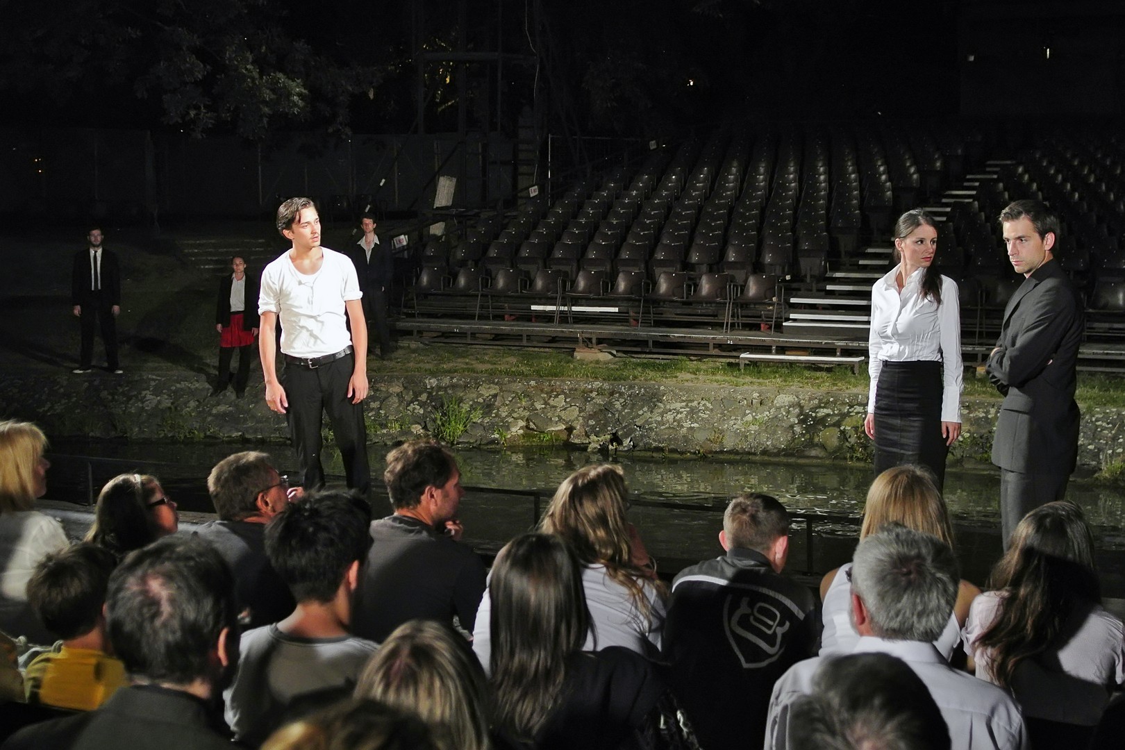 Kétségkívül impozáns előadásnak lehetett tanúja a közönség, amikor a Gyulai Várszínház műsorában, W. Shakespeare Hamletjét a Színház- és Filmművészeti Egyetem 2010-2015-ös évfolyam hallgatói adták elő a tószínpad környékén. Nem véletlen a helyszín meghatározása, ugyanis a harmadikos színművészhallgatók nem „ragaszkodtak” egy színpadhoz, sőt, a darab során a szereplők a közönséget is más és más helyszínekre invitálták.