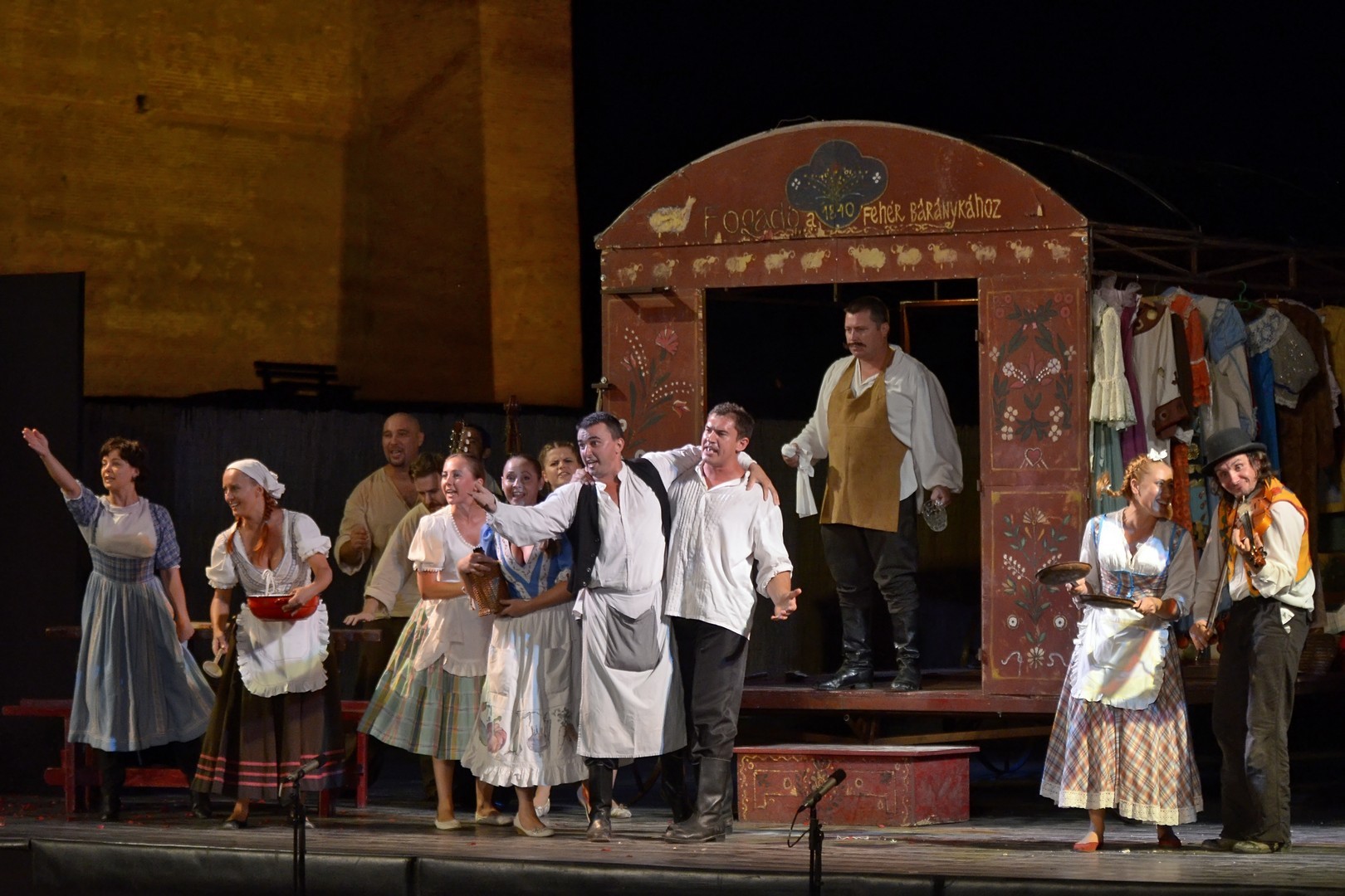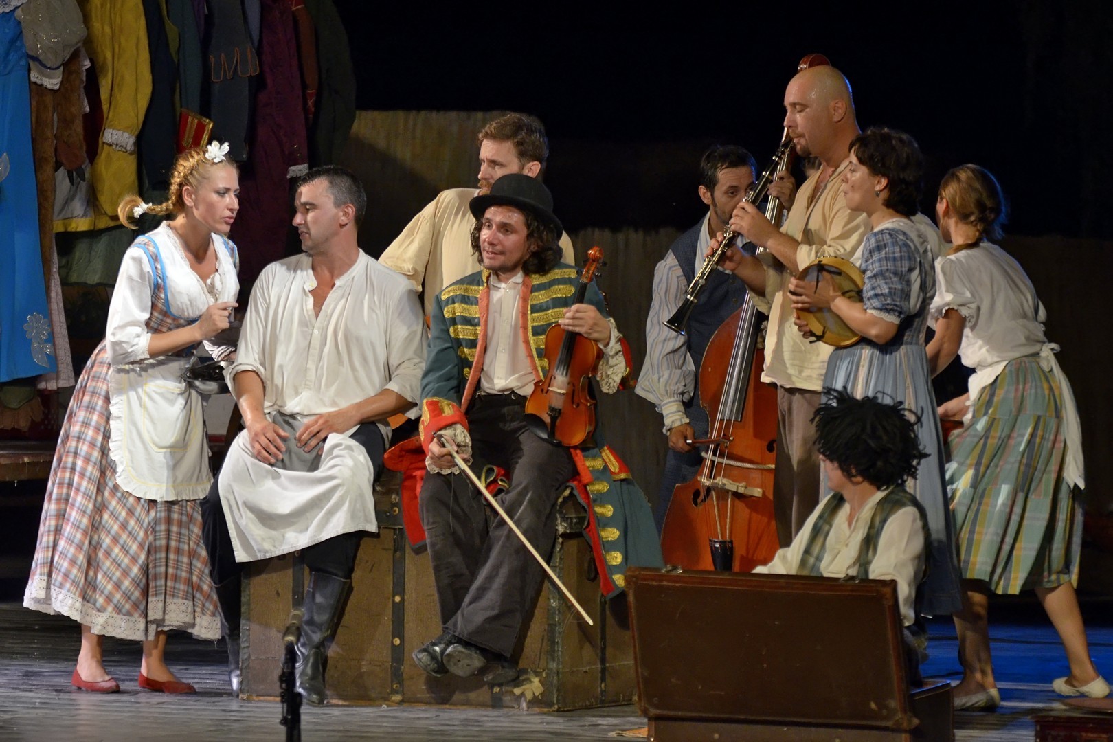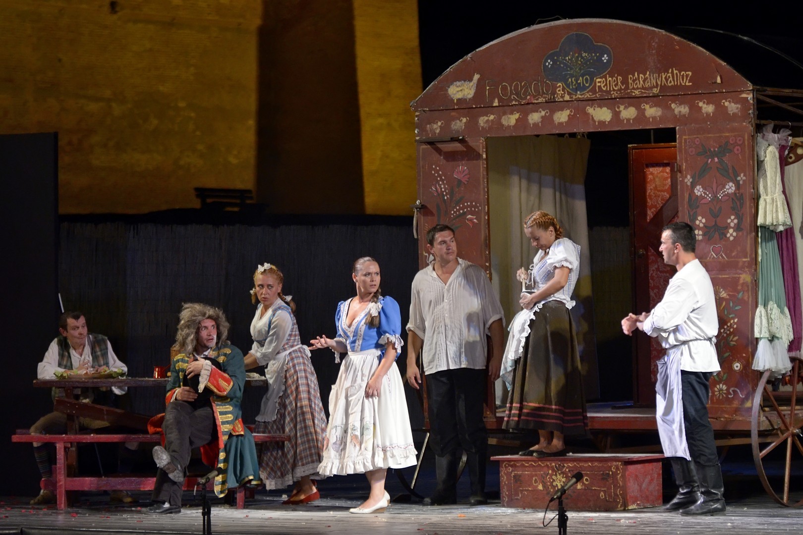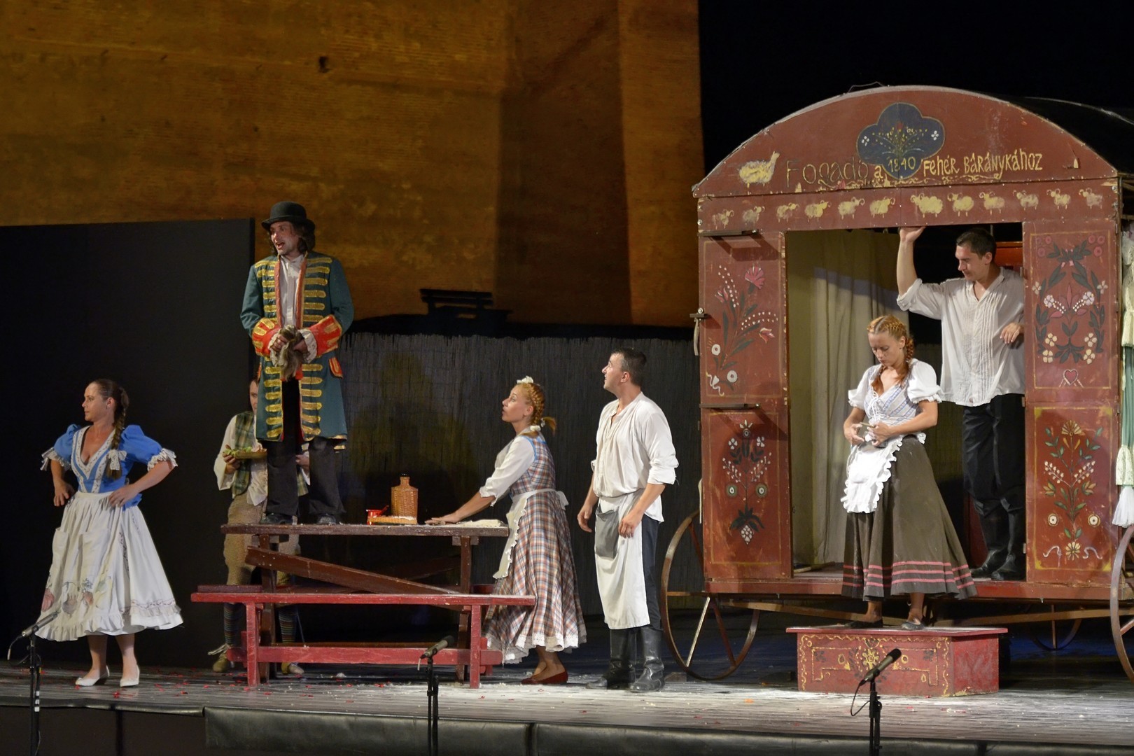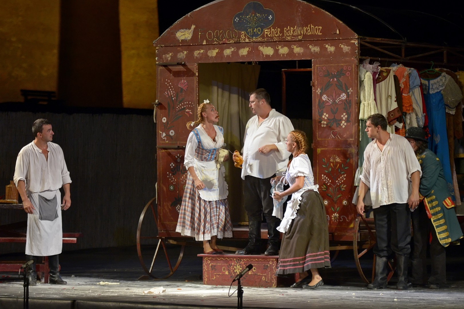A zene az adott esemény hangulatától függően hol 20. századi musical elemeket, hol balkáni népzenét, hol áriaszerű dalokat, nótákat szólaltat meg. Hozzá kell tennünk, hogy a beregszászi színészek kiválóan énekelnek, zenélnek. A jelmezek (V. Csolti Klára) Szigligeti korát idézik. Alekszander Belozub díszlete egy ekhós szekér, amely pillanatok alatt alakul át színházzá, vagy vendégfogadóvá. Szerepe nyújtotta lehetőséget maximálisan kihasználva formálta meg Kacsur Andrea Kamilla kisasszonyt, Erzsit Orosz Melinda, Gyuri pincért Ferenci Attila, vagy Kányai fogadóst Szabó Imre. Az egy-egy hatásos magánszámot közben is megtapsoló közönség kellemes estét tölthetett el a tószínpadon. A darab a Kárpátaljai Megyei Magyar Drámai Színház és a Gyulai Várszínház közös produkciójaként került színre.