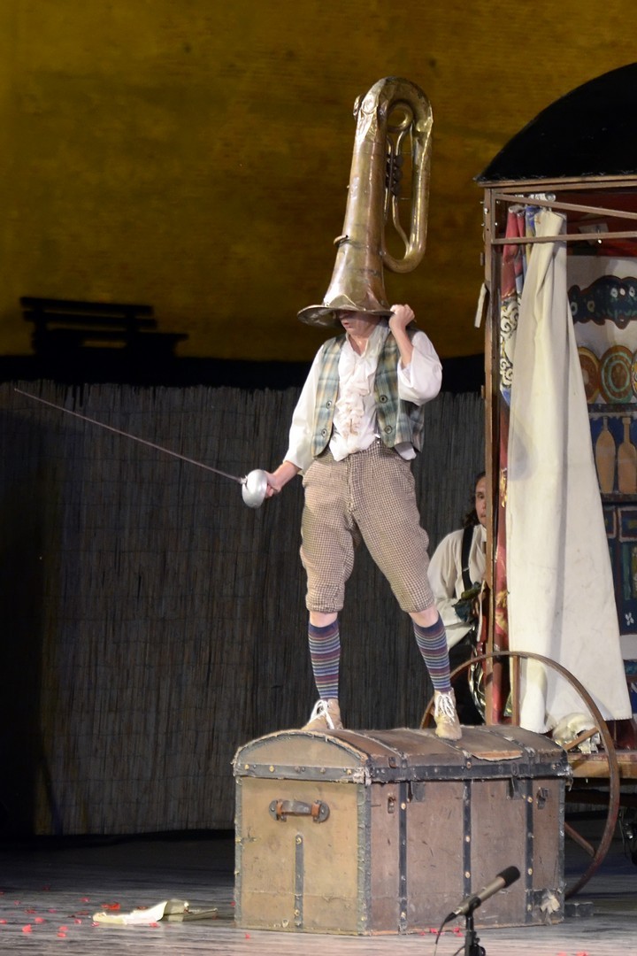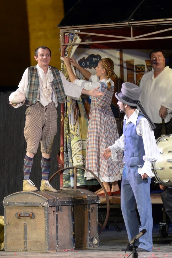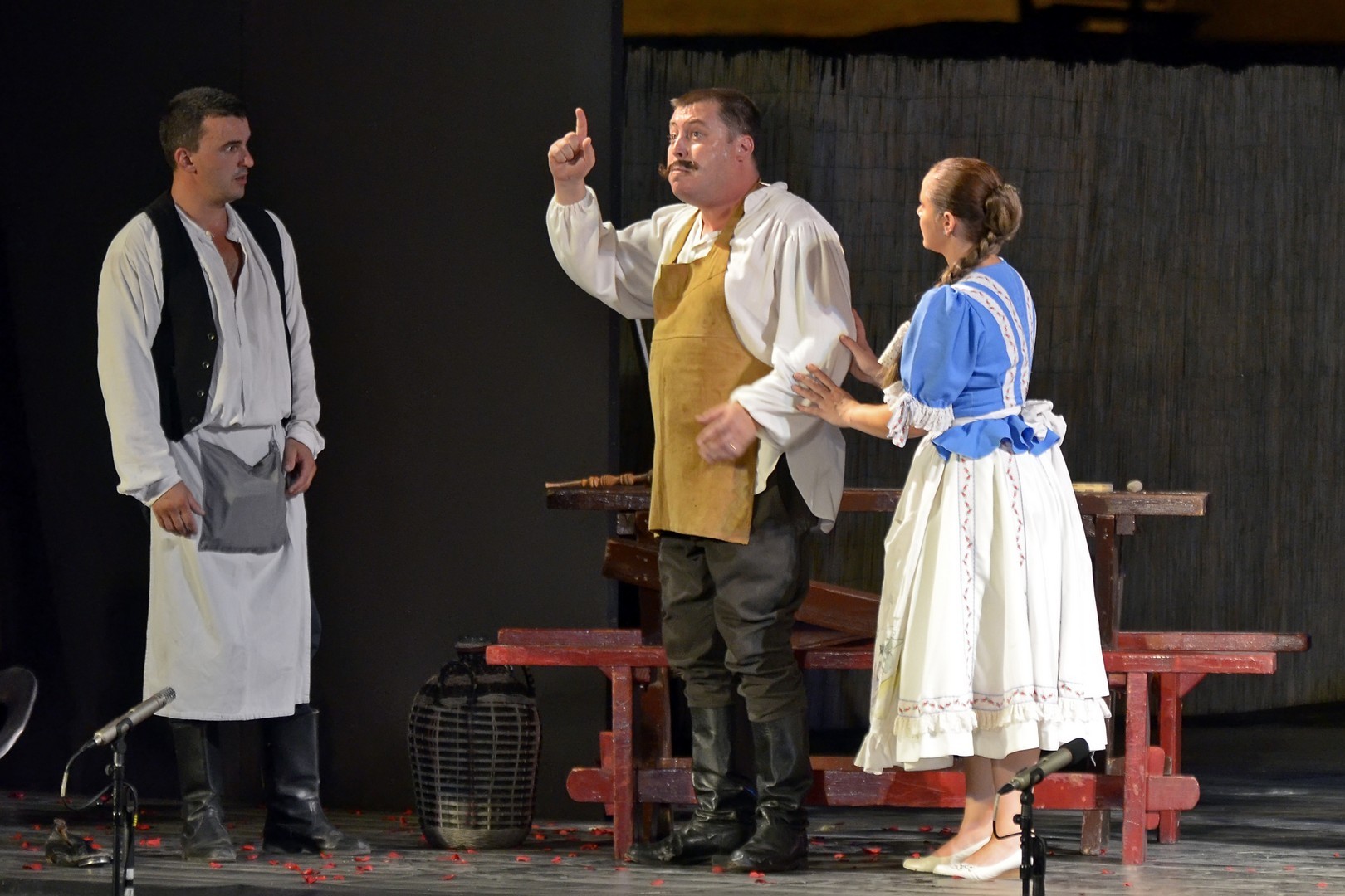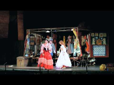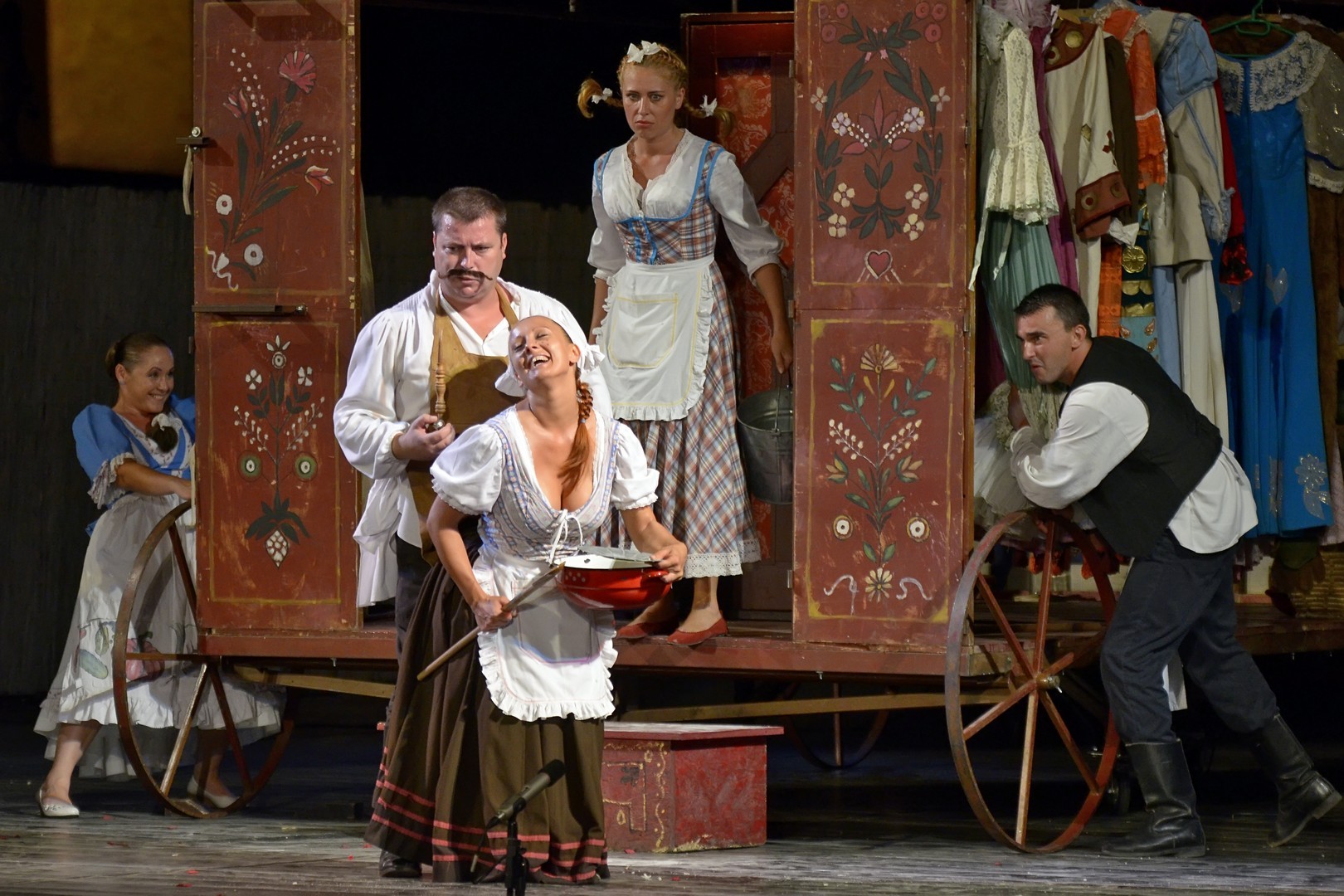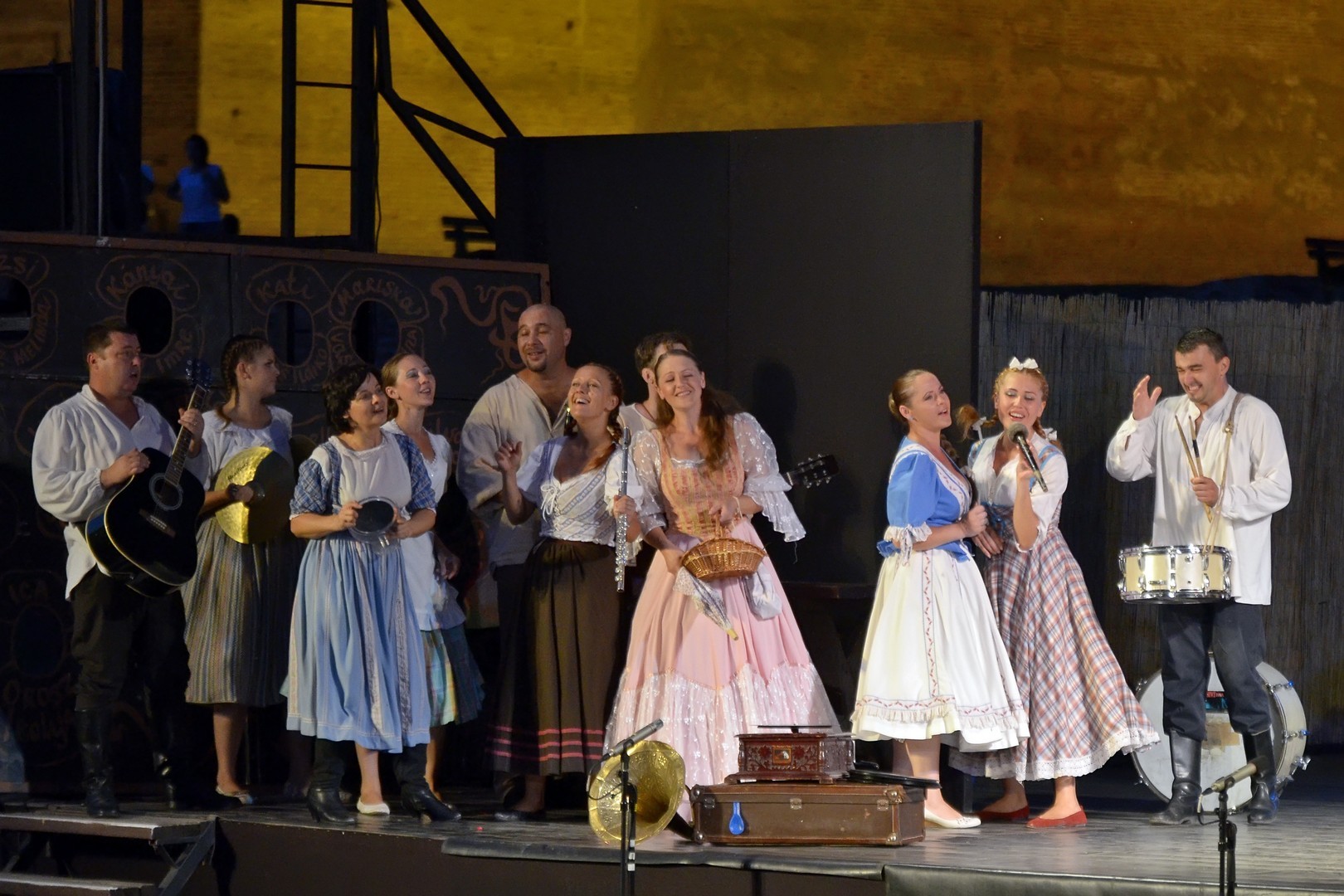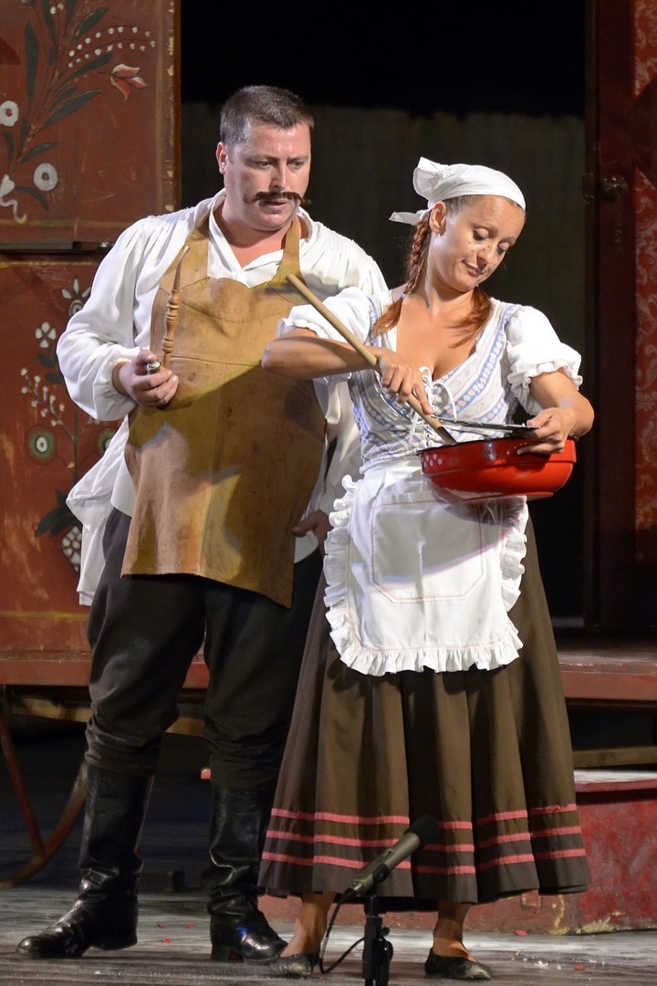A zene az adott esemény hangulatától függően hol 20. századi musical elemeket, hol balkáni népzenét, hol áriaszerű dalokat, nótákat szólaltat meg. Hozzá kell tennünk, hogy a beregszászi színészek kiválóan énekelnek, zenélnek. A jelmezek (V. Csolti Klára) Szigligeti korát idézik. Alekszander Belozub díszlete egy ekhós szekér, amely pillanatok alatt alakul át színházzá, vagy vendégfogadóvá. Szerepe nyújtotta lehetőséget maximálisan kihasználva formálta meg Kacsur Andrea Kamilla kisasszonyt, Erzsit Orosz Melinda, Gyuri pincért Ferenci Attila, vagy Kányai fogadóst Szabó Imre. Az egy-egy hatásos magánszámot közben is megtapsoló közönség kellemes estét tölthetett el a tószínpadon. A darab a Kárpátaljai Megyei Magyar Drámai Színház és a Gyulai Várszínház közös produkciójaként került színre.