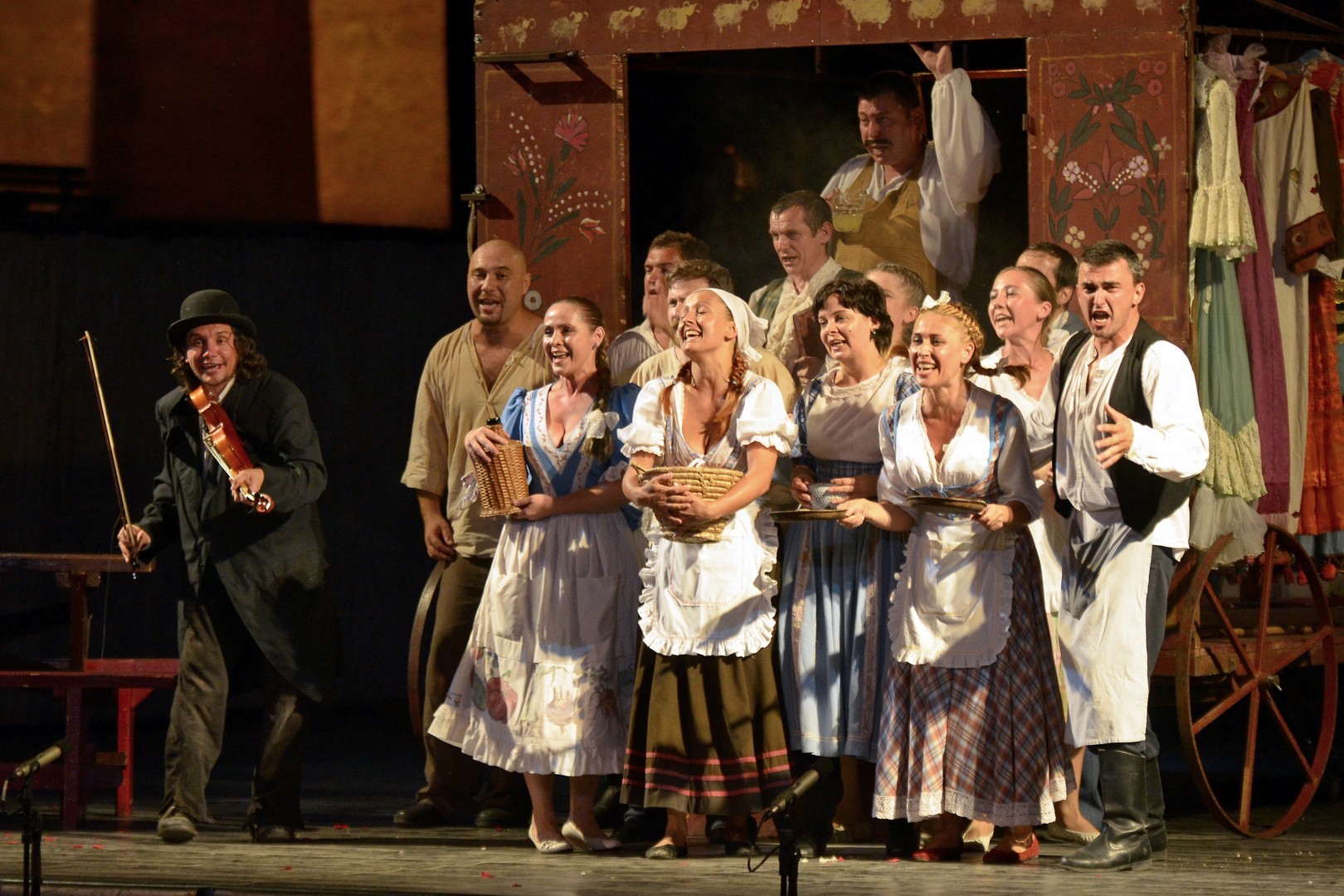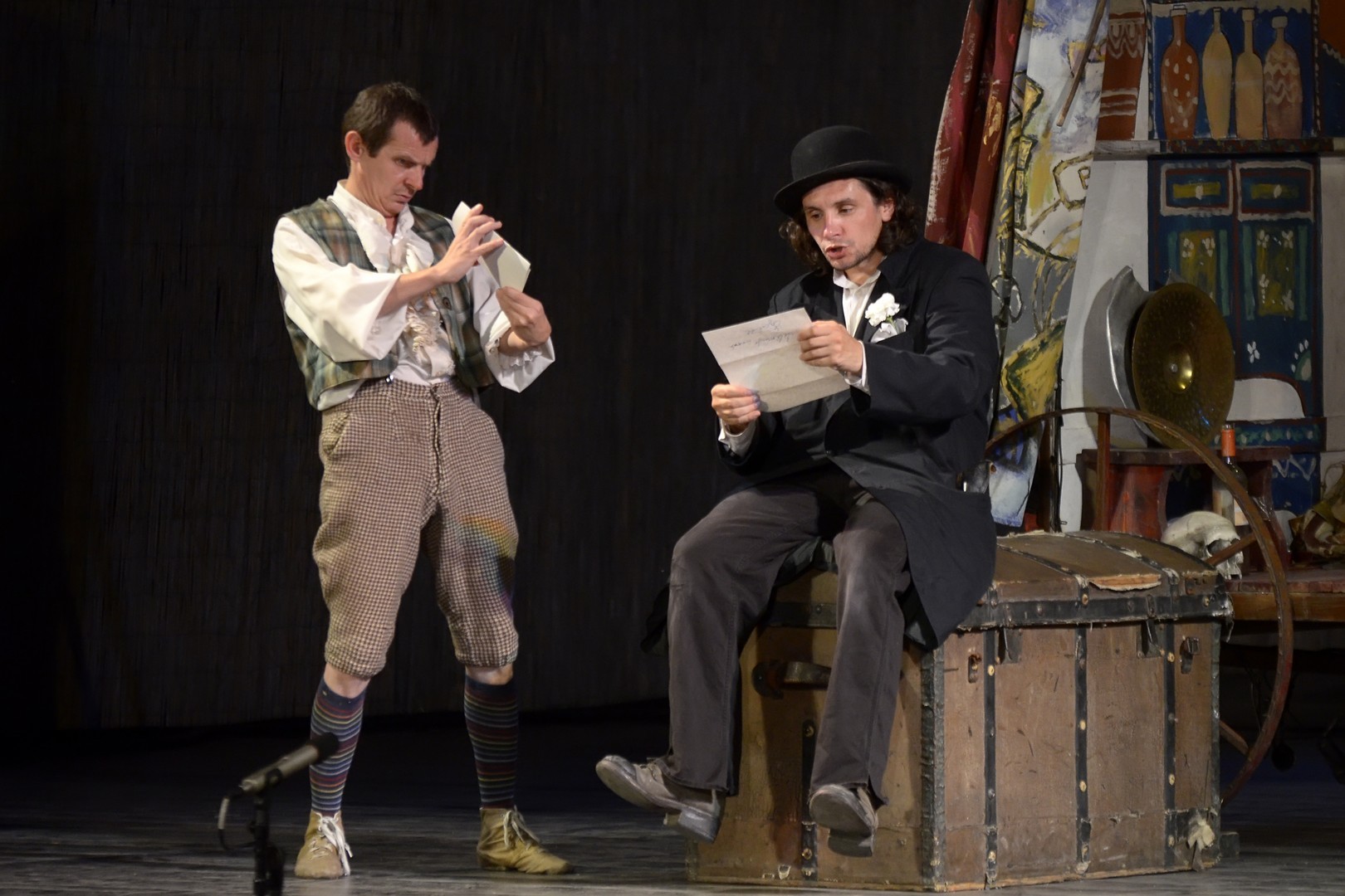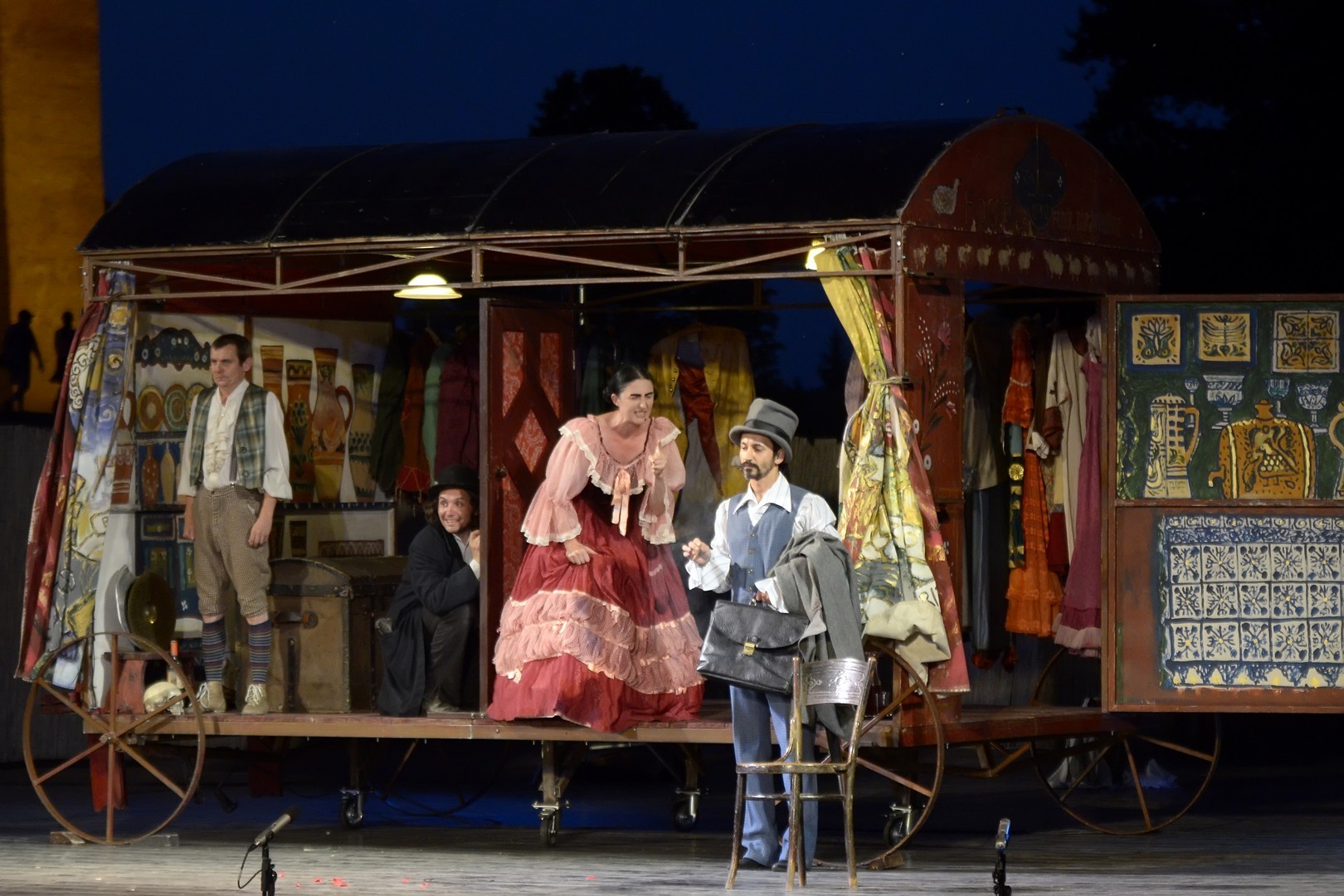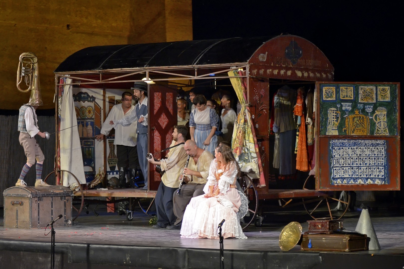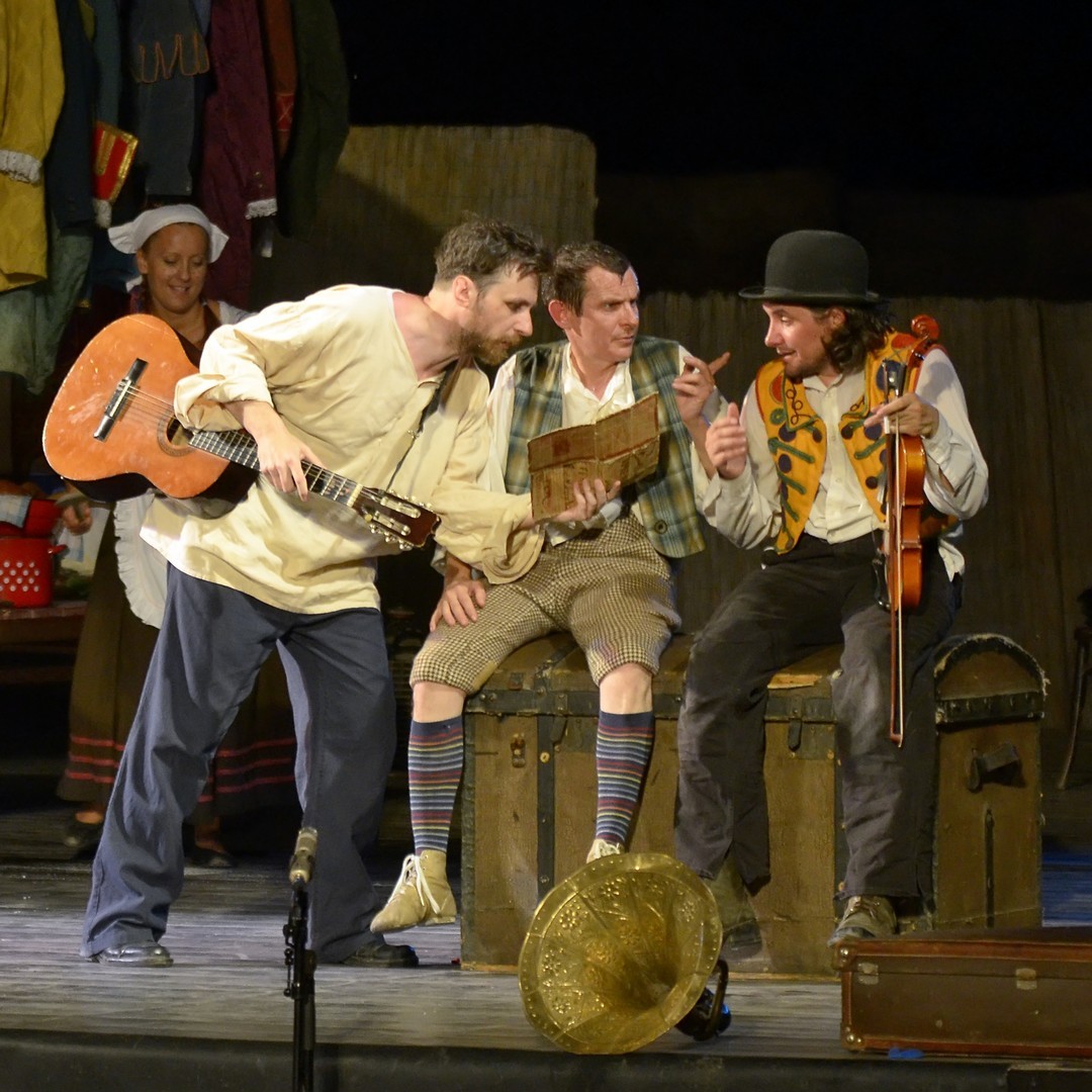 A zene az adott esemény hangulatától függően hol 20. századi musical elemeket, hol balkáni népzenét, hol áriaszerű dalokat, nótákat szólaltat meg. Hozzá kell tennünk, hogy a beregszászi színészek kiválóan énekelnek, zenélnek. A jelmezek (V. Csolti Klára) Szigligeti korát idézik. Alekszander Belozub díszlete egy ekhós szekér, amely pillanatok alatt alakul át színházzá, vagy vendégfogadóvá. Szerepe nyújtotta lehetőséget maximálisan kihasználva formálta meg Kacsur Andrea Kamilla kisasszonyt, Erzsit Orosz Melinda, Gyuri pincért Ferenci Attila, vagy Kányai fogadóst Szabó Imre. Az egy-egy hatásos magánszámot közben is megtapsoló közönség kellemes estét tölthetett el a tószínpadon. A darab a Kárpátaljai Megyei Magyar Drámai Színház és a Gyulai Várszínház közös produkciójaként került színre.