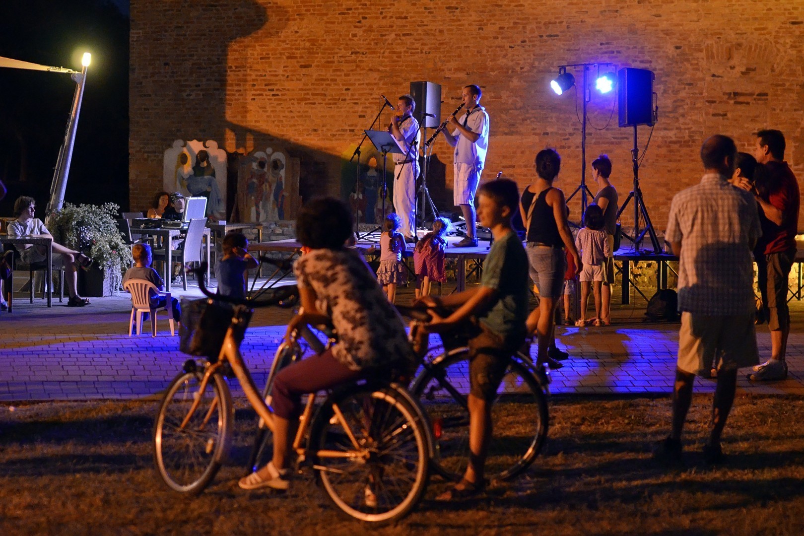 A gyulai vár mellett lévő Rondella terasz színpadán ezúttal a gyulai Harruckern téri vidám fiúk nevezetű formáció mulattatta a szabadtéri szórakozóhely vendégeit. A zenészduó városunk két, fúvósokra épülő zenekarának vezetőiből áll: Kepenyes Pál a Gyulai Big Band dirigense, Bogdán Gábor pedig a Gyulai Erkel Ferenc Ifjúsági Fúvószenekar karmestere.