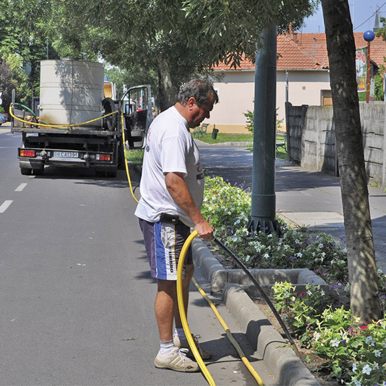 – Több mint egy hónapja napi húsz órában folyik az öntözés Gyula város utcáin. Társaságunk műszakonként négy fordulóval, 30 ezer liter vizet locsol ki Gyulán. Az újonnan telepített fák hetente egyszer – egyenként – 30-40 liter vizet kapnak, a virágok kétnaponta, árasztásos módszerrel jutnak vízhez. Gondot okoz, hogy a hőségben nagy a párolgási veszteség. A virágok gyarapodására esély sincs, csupán az életben maradásukról tudnak gondoskodni a szakembereink. Az elmúlt években szintén hasonló időjárási körülmények uralkodtak térségünkben, ezért – a tapasztalt károsítóhatások miatt – az öntözővízbe műtrágya is kerül a növények védelmének érdekében – mondta el a Gyulai Hírlapnak Bányai György üzemvezető-helyettes.