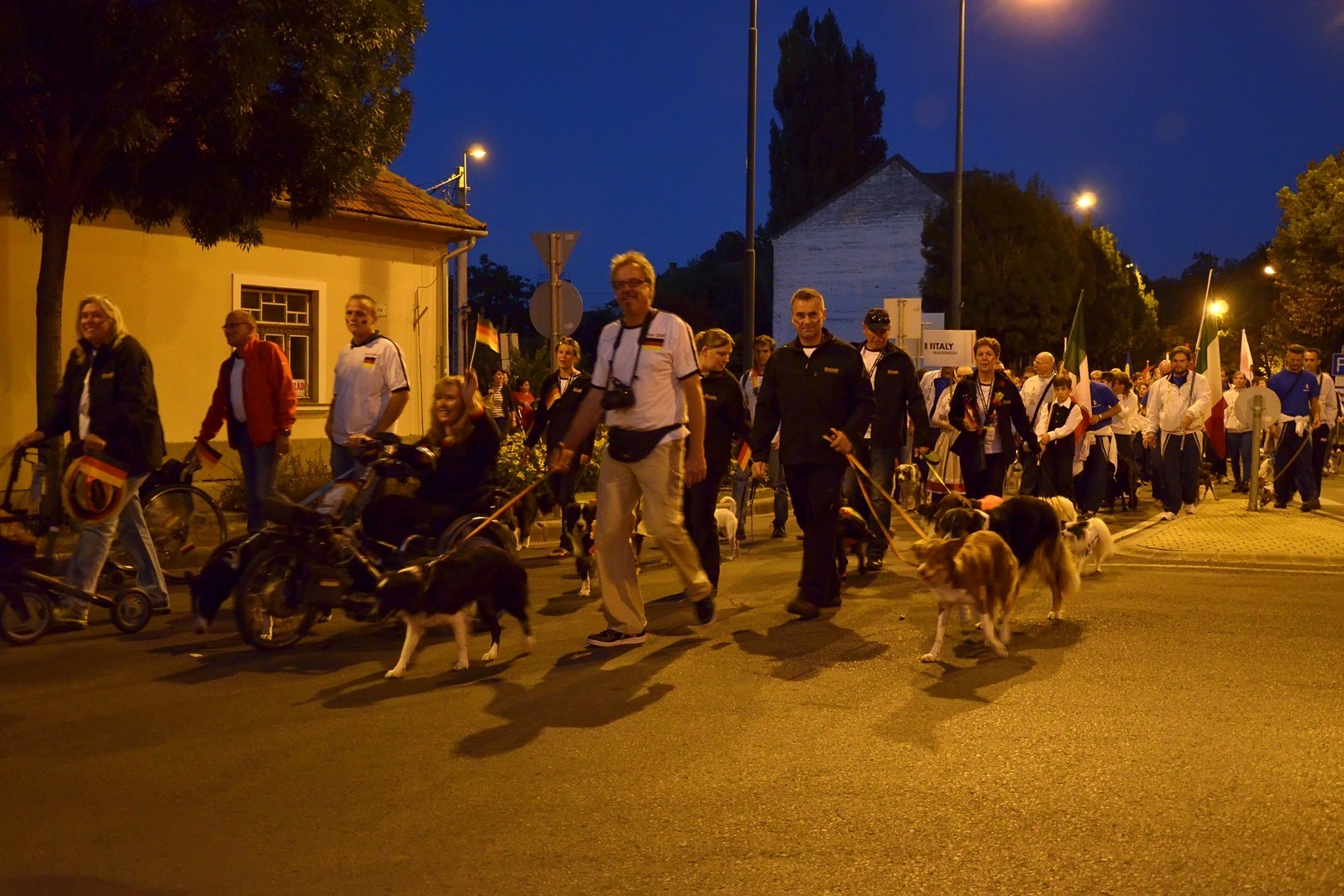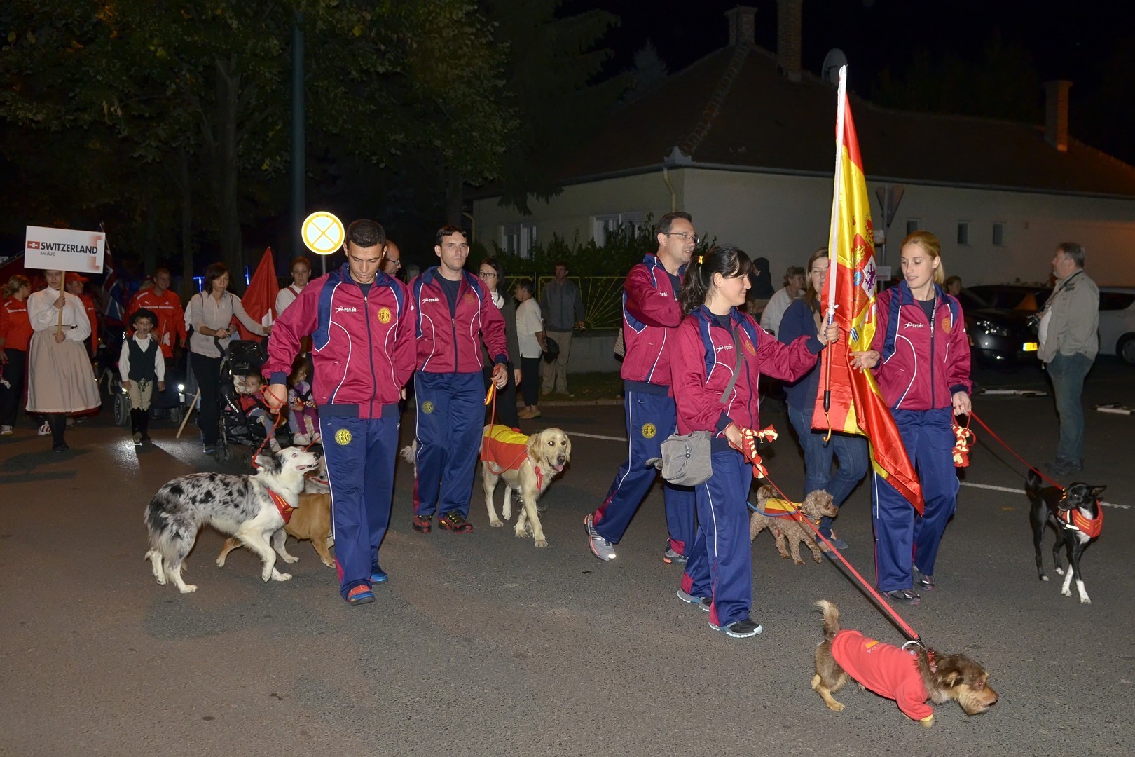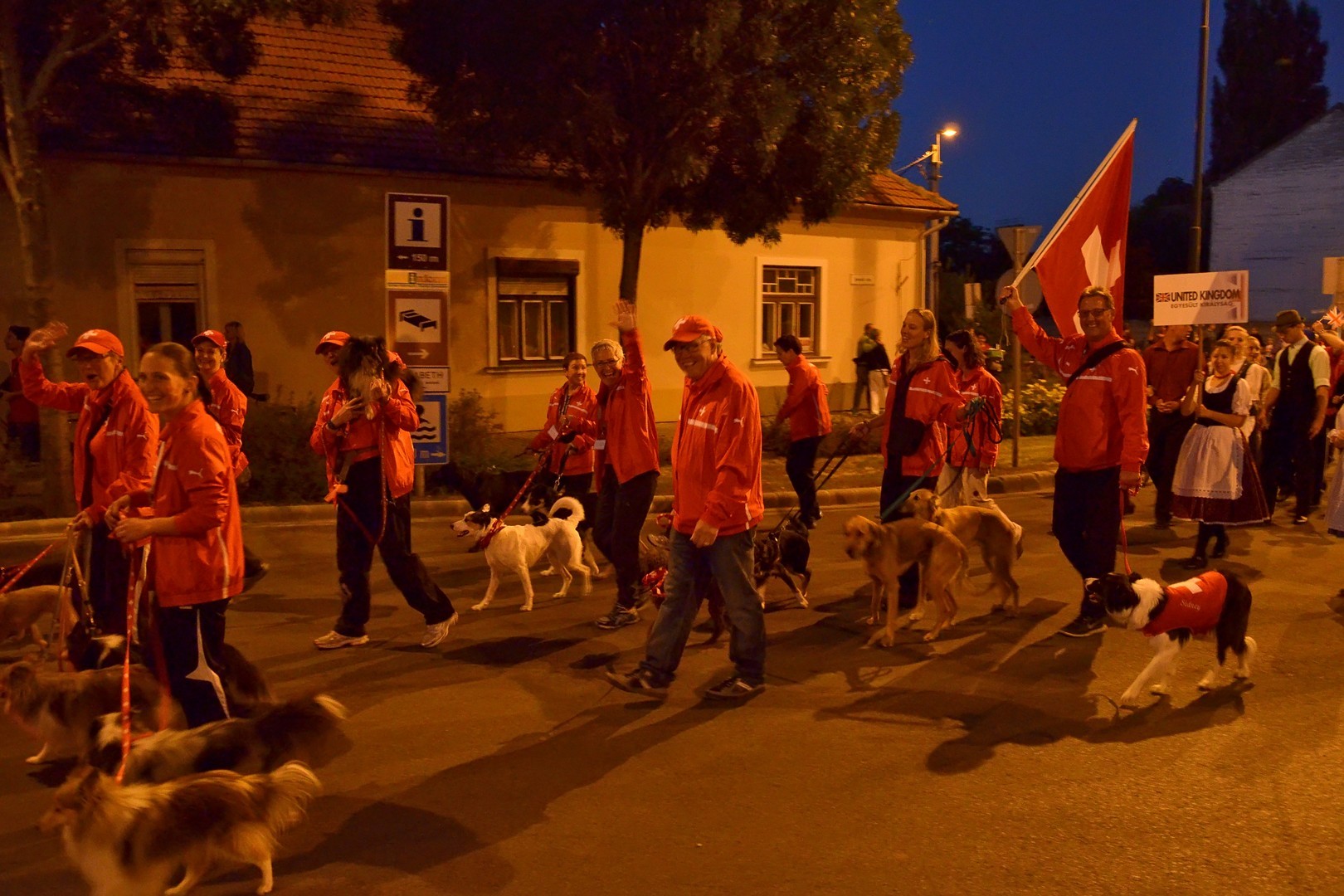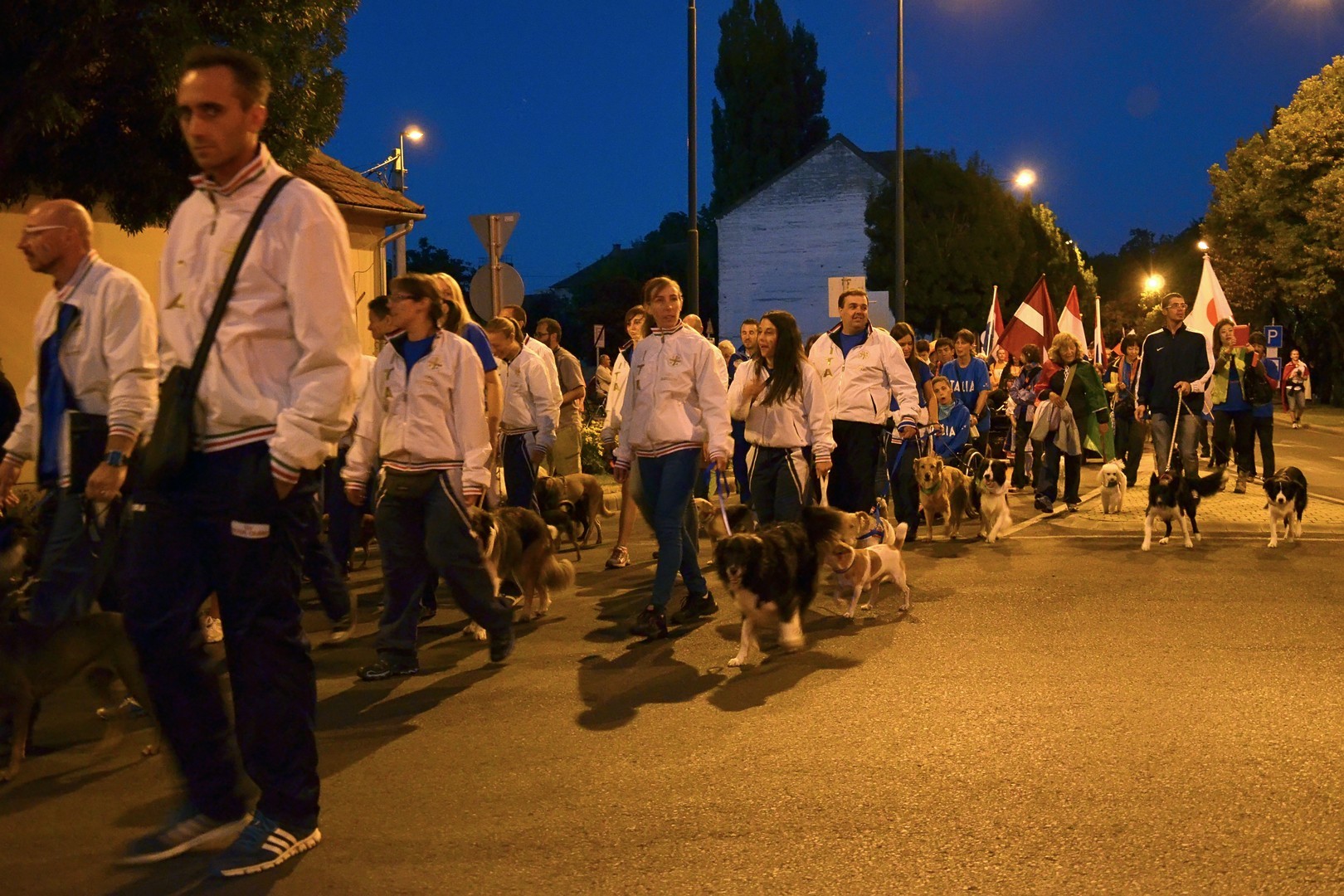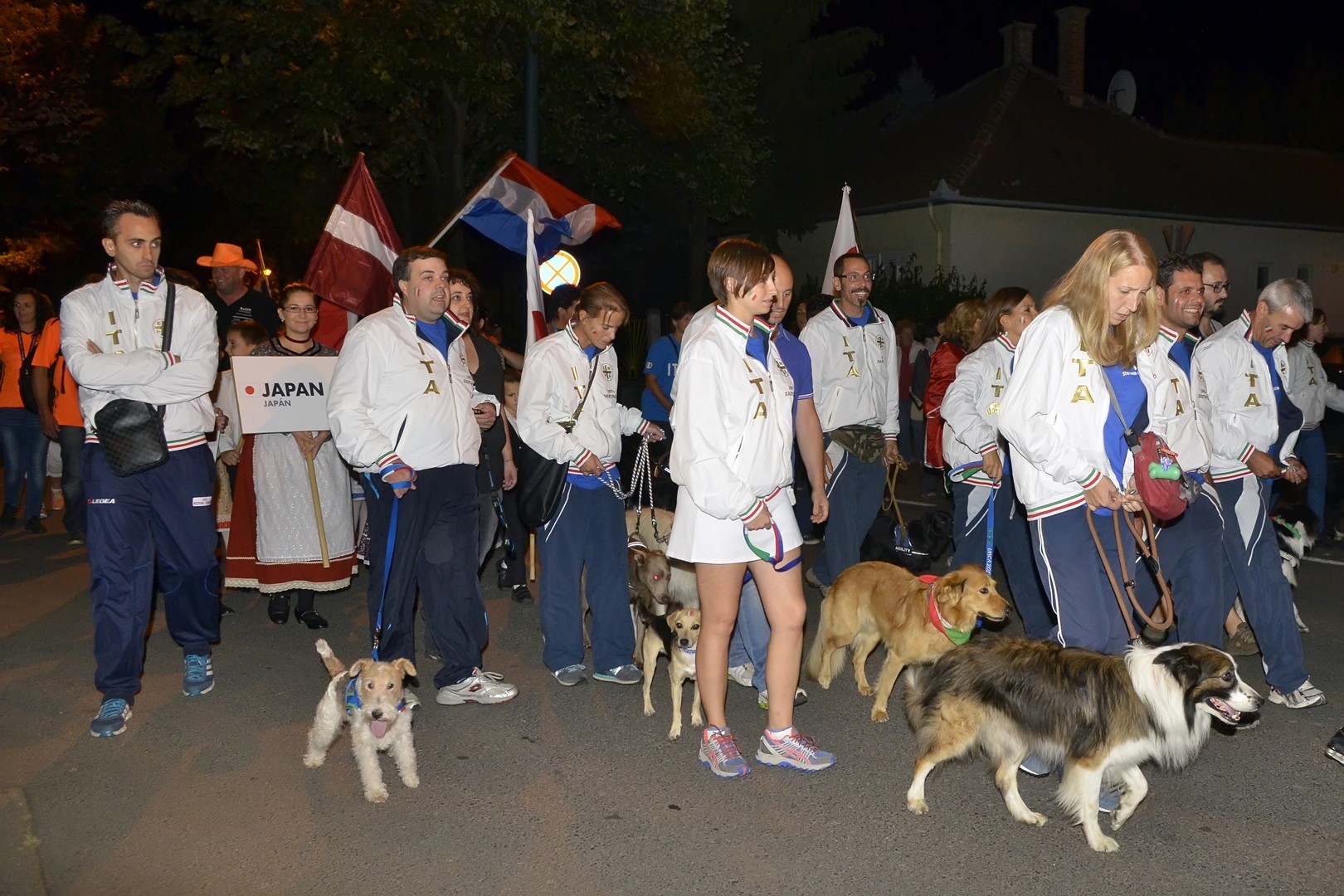 A kutyák és gazdáik az esti órákban vonultak át a vártól a négy napig tartó rendezvény helyszínére, ahol az ünnepi műsor után dr. Görgényi Ernő polgármester mondott köszöntő beszédet. A városvezető, egyben a program házigazdája kiemelte: hatalmas megtiszteltetés, hogy a versenyen személyesen is tiszteletét tette az agility atyjaként számon tartott John Gilbert, aki továbbfolytatva az első kutyás bemutatót megálmodó Peter Meanwell munkáját, Peter Lewisszal karöltve sporttá fejlesztette az agilityt.