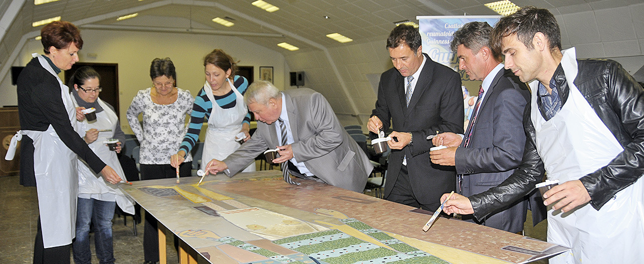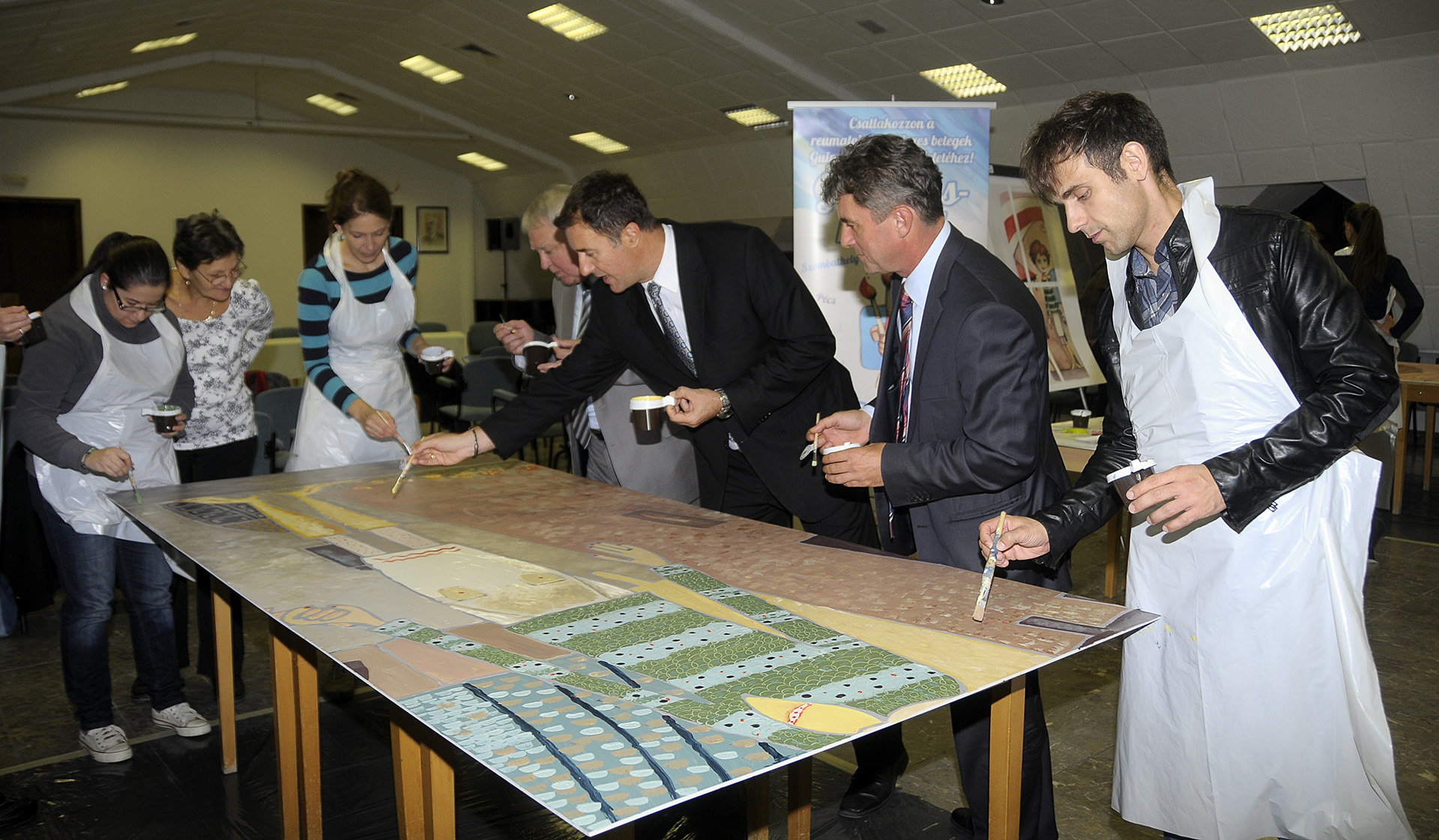 Gyulára is ellátogatott a Magyar Reumabetegek Egyesületének kezdeményezésére elindult RAgadj Ecsetet! című országjáró kampány, amely célja egy Guinness-rekord kísérlet: a világ legnagyobb, 60 négyzetméteres képeslapjának elkészítése. A nyolc részből álló képeslap egyik darabját a gyulai reumatoid artritiszes, vagyis sokízületi gyulladással kezelt betegek, valamint a Pándy Kálmán Megyei Kórház Reumatológiai Osztályának dolgozói festették meg. A közös festésbe bekapcsolódott dr. Ortutay Judit, a Magyar Reumabetegek Egyesületének elnöke, dr. Kovács József főigazgató főorvos, országgyűlési képviselő, dr. Keszthelyi Péter osztályvezető főorvos, dr. Mészáros János TESZK igazgató, valamint Rácz Gergő énekes-zenész is.