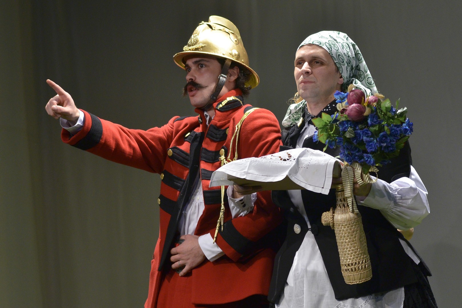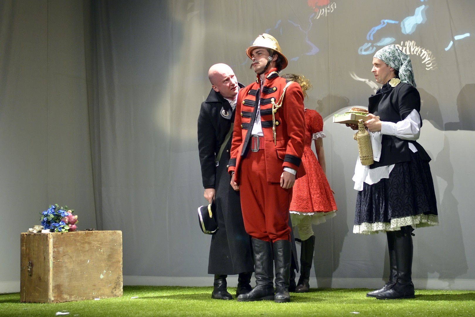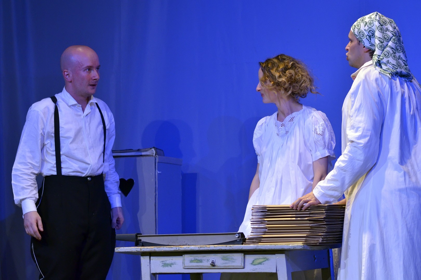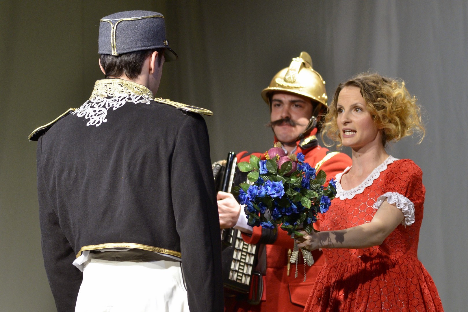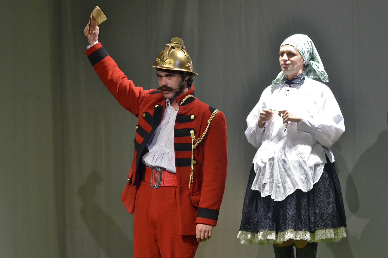 A románul elhangzó mű megértéséhez szinkrontolmács készüléket is kapott a közönség magyar fele, úgyhogy a dél-keleti szomszédjaink anyanyelvét nem értő nézők is jól szórakozhattak. A darabban öt színész, George Costin, Adrian Nicolae, Sorin Miron, Nicoleta Hancu és Alexandru Ion színművészek játékát láthattuk. Különlegesség tette a szereposztást, hogy a kislányt, Ágikát és a könnyűvérű nőt ugyanazon színész játszotta (Nicoleta Hancu), a Gyuluskájáért aggódó anyát, Mariskát pedig egy férfi (Sorin Miron) alakította, ami a komédia felé vitte az alaphangulatot.