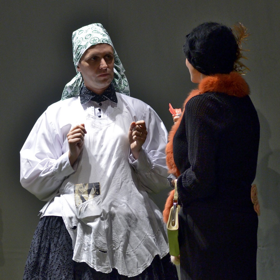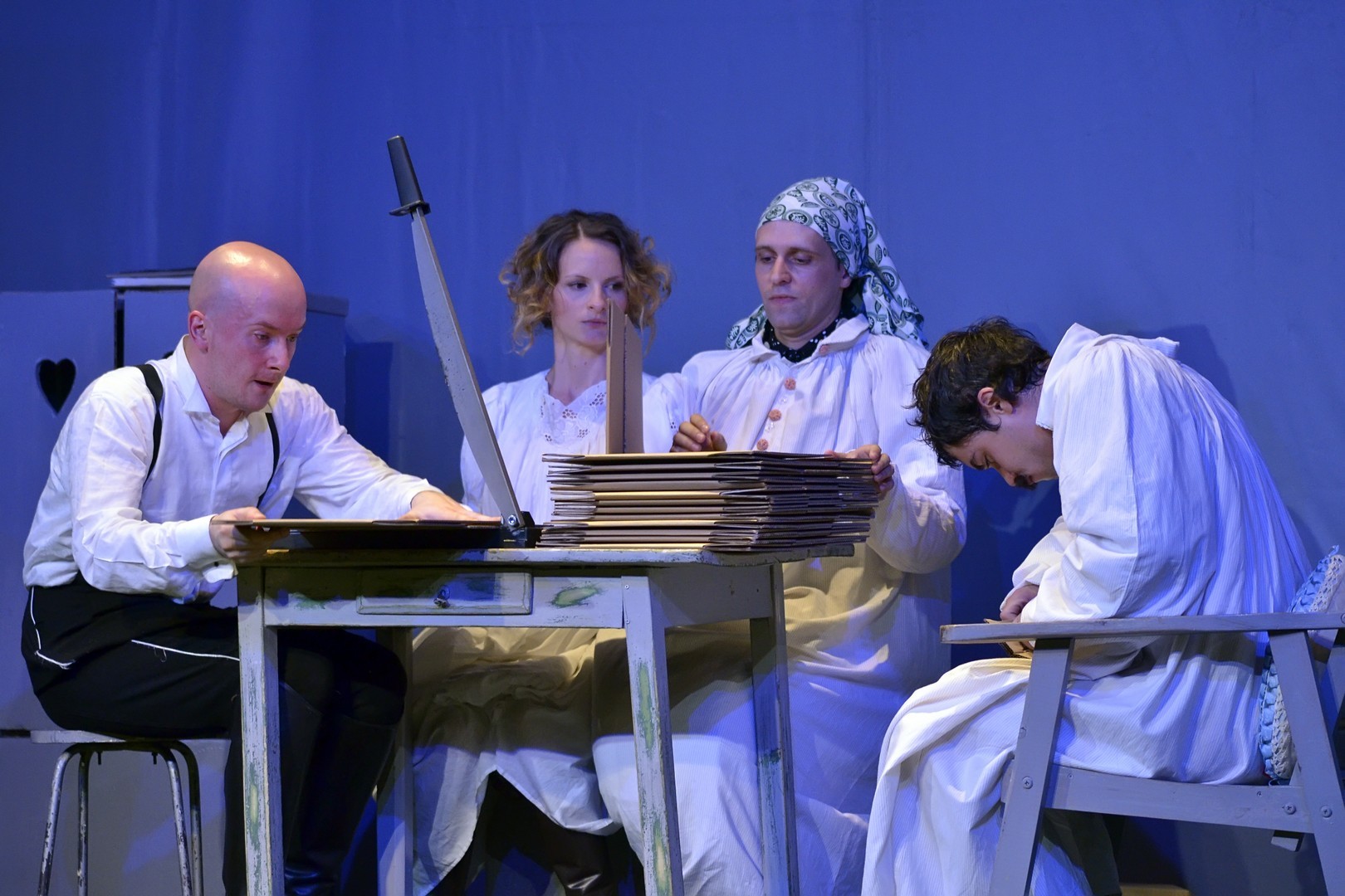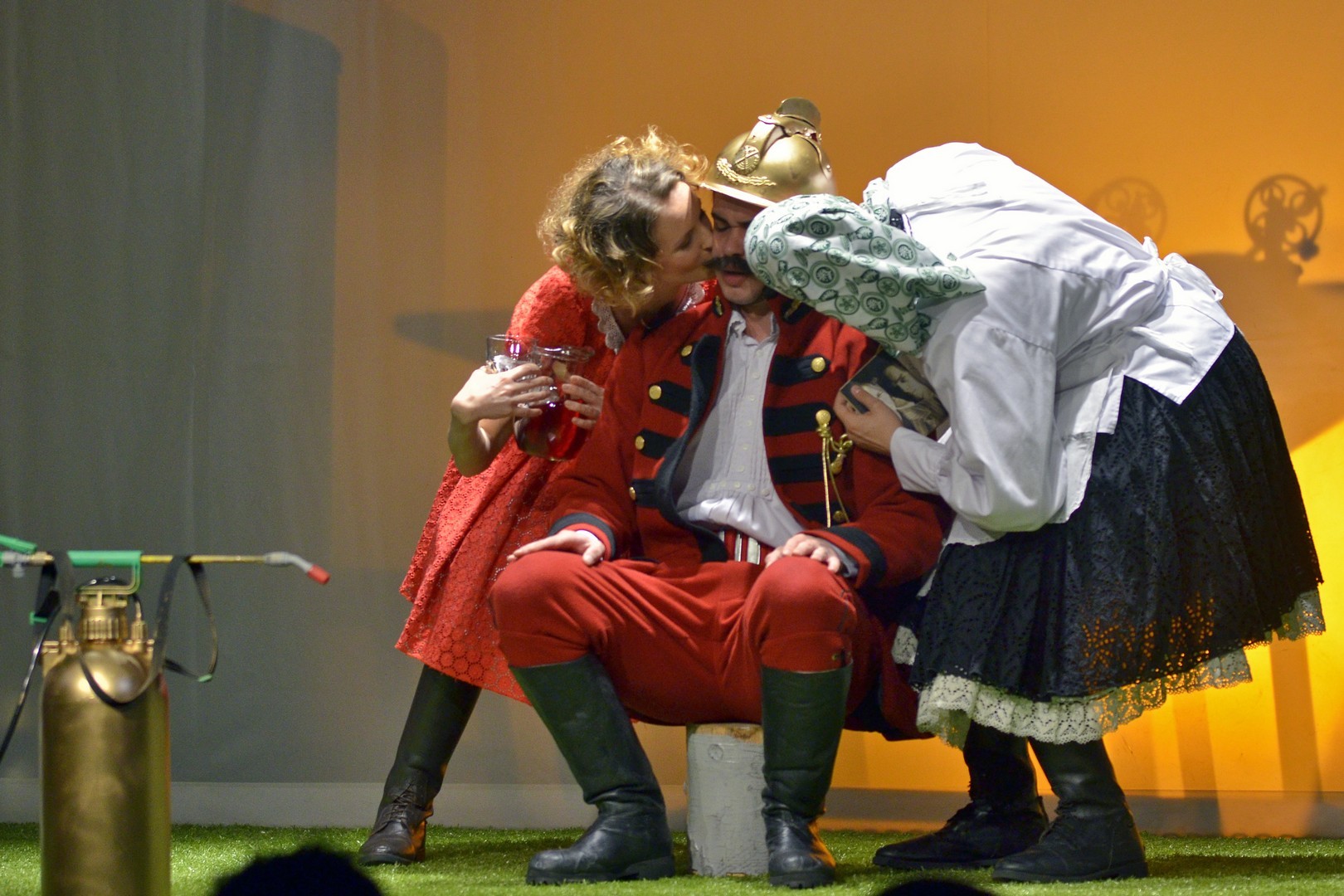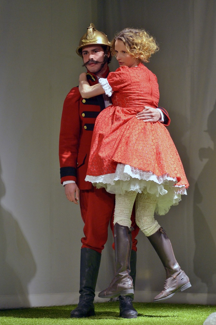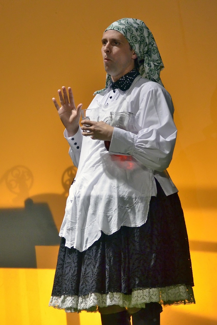 A románul elhangzó mű megértéséhez szinkrontolmács készüléket is kapott a közönség magyar fele, úgyhogy a dél-keleti szomszédjaink anyanyelvét nem értő nézők is jól szórakozhattak. A darabban öt színész, George Costin, Adrian Nicolae, Sorin Miron, Nicoleta Hancu és Alexandru Ion színművészek játékát láthattuk. Különlegesség tette a szereposztást, hogy a kislányt, Ágikát és a könnyűvérű nőt ugyanazon színész játszotta (Nicoleta Hancu), a Gyuluskájáért aggódó anyát, Mariskát pedig egy férfi (Sorin Miron) alakította, ami a komédia felé vitte az alaphangulatot.
