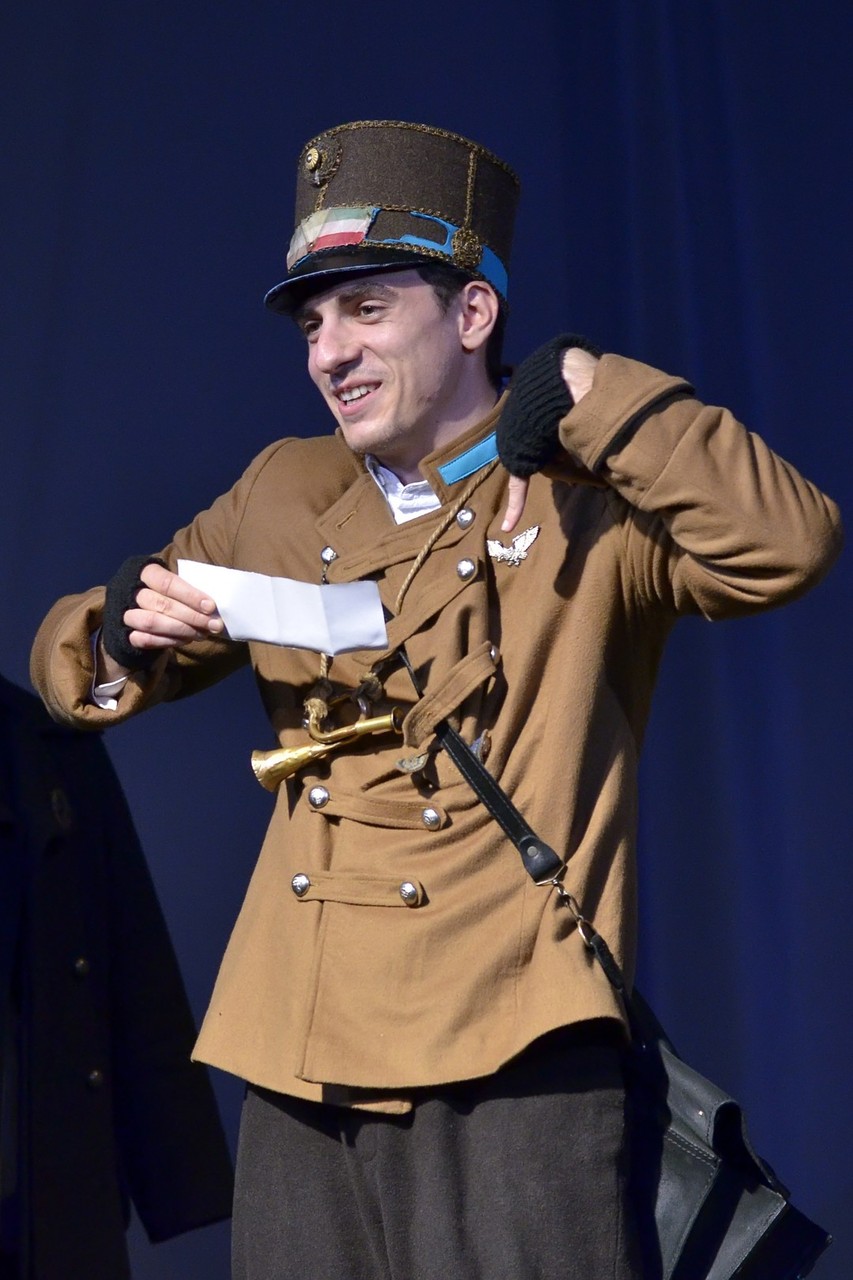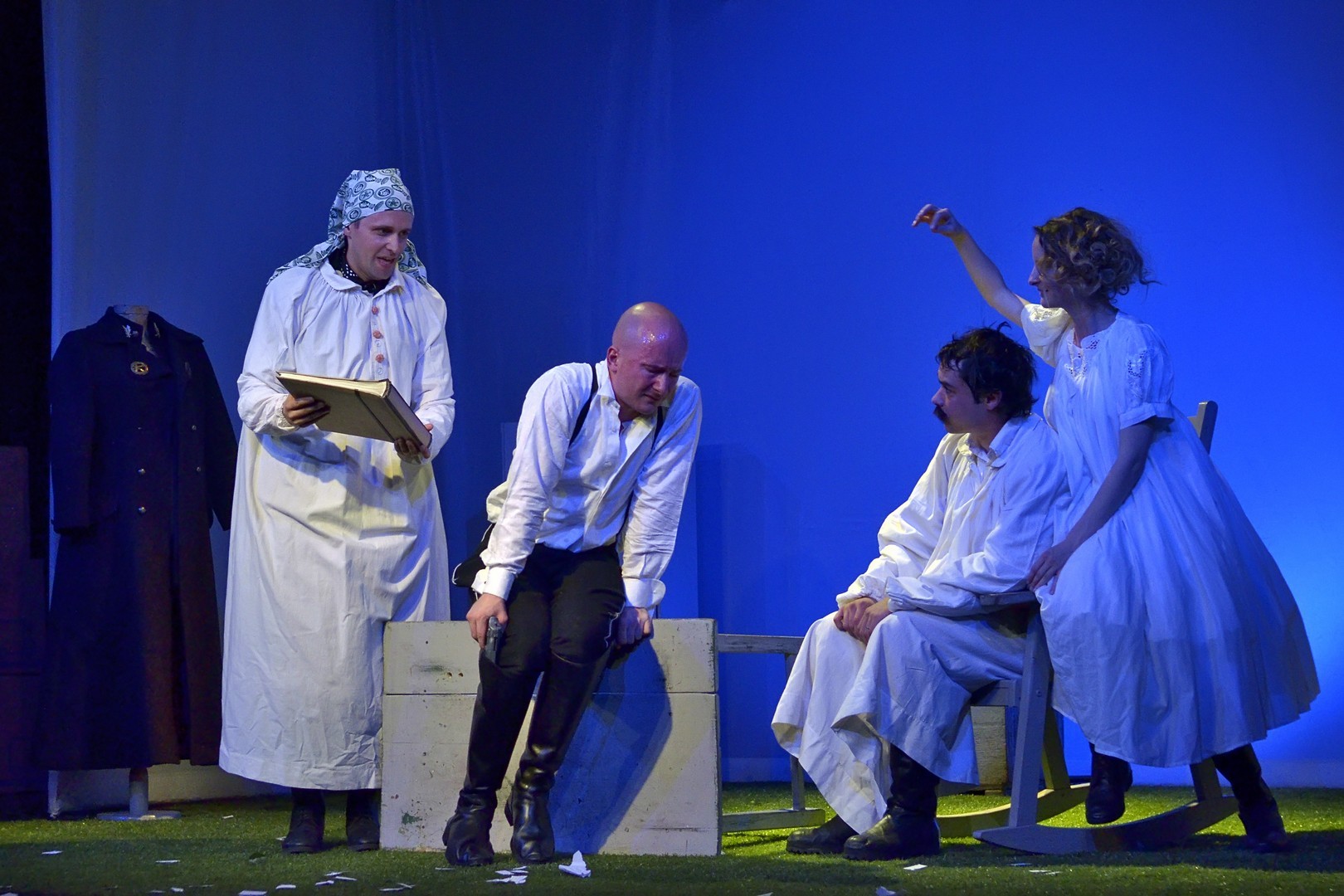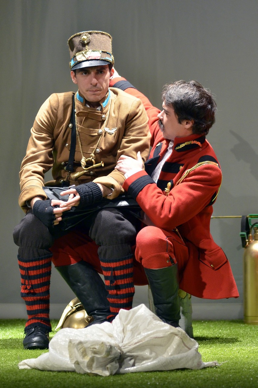 A színházi ajánlóban kiemelték az idegbeteg őrnagyot játszó George Costint, aki alakításáért magkapta a Román Színházi Szövetség Uniter-díját, úgyhogy kíváncsian vártuk az említett művész megjelenését. Addig a pillanatig egy szinte hagyományos komédiát láthattuk jó színészekkel, ám Örkény tollvonásával, illetve George Costin megjelenésével lépett a mű az elismertségükhöz méltó szintre. A színész hátborzongató, s az empatikus közönségre nézve szinte életveszélyes játéka egy szempillantás erejéig sem hagyta a hiteltelenség látszatát kelteni. A hatás nem maradt el, a szánnivaló beteg elme őrült tekintete, pszichotikus görcsei és artikulátlan reakciói vérfagyasztó csendszünetekkel tarkították a hahotákat.