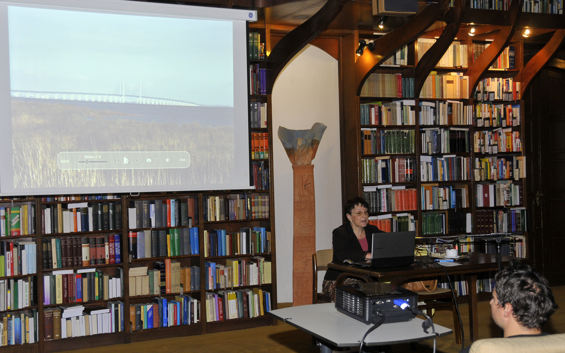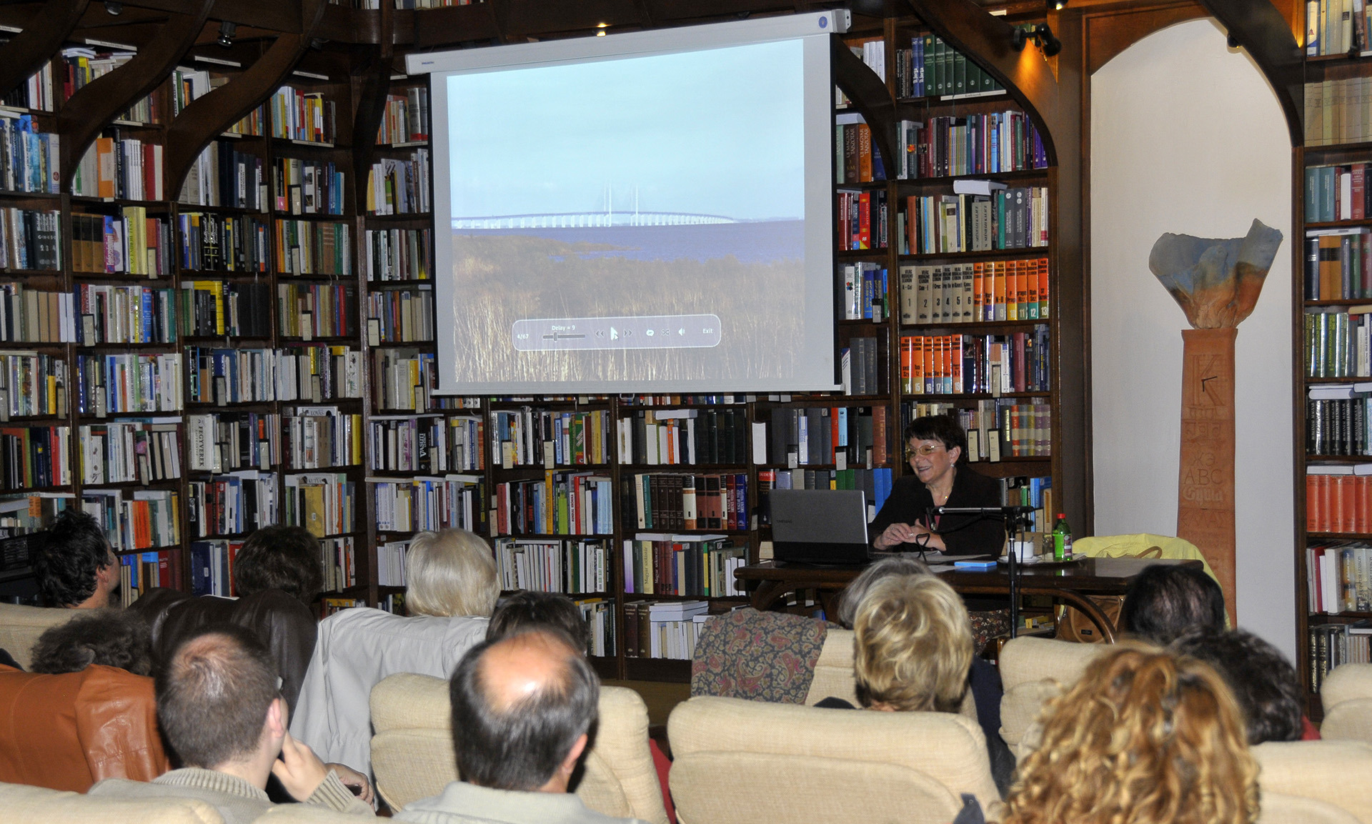 Oltyán Ilona sok éve tagja a Gyulai Székely Aladár Fotóklubnak, úgyhogy nem csoda, hogy élménybeszámolójának gerincét a Dániában készült fényképei adták. Előadása során tíz tételben mutatta be fotóit. A könyvtár vendégei átélhettek zenével aláfestett, meditatív hangulatot árasztó tengerparti összeállítást, és láthatták többek között a Dániát Svédországgal összekötő hidat, a királyi palotát, a hableány szobrát a királyi kikötőben, a tengernyi szélerőművet, évszázados épületeket, és természetesen szőke skandinávokat is.