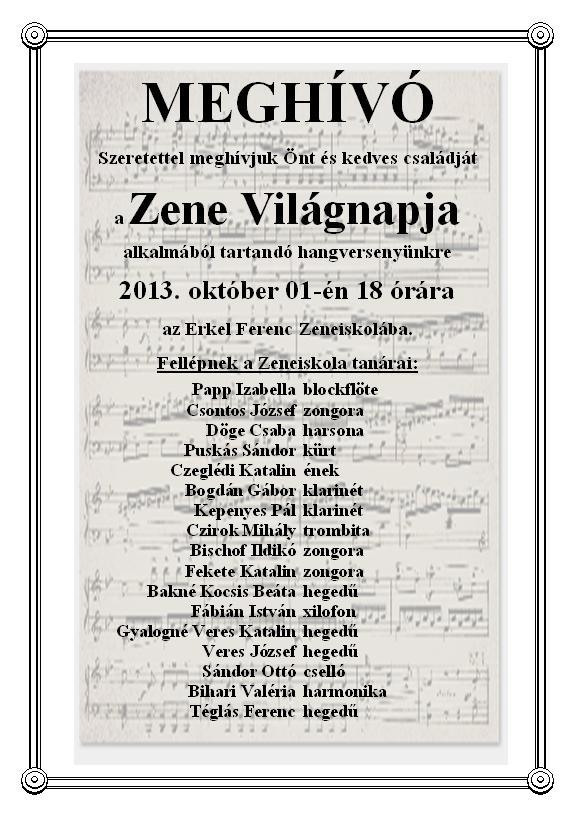 A Zene Világnapja alkalmából ünnepi hangversenyt rendez a GYAKI Erkel Ferenc Alapfokú Művészetoktatási Iskola tagintézménye október 1-én a zeneiskola (Gyula, Bartók Béla u. 3.) nagytermében.