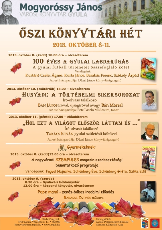 Visszatarthatatlanul megérkezett a rossz idő. Ha máskor nem, ilyenkor juthat igazán ideje a könyvek szerelmeseinek a betűfalásra. A Mogyoróssy János Városi Könyvtár Őszi könyvtári hetet szervez, ahol az alkotókkal személyesen is találkozhatnak az érdeklődők.