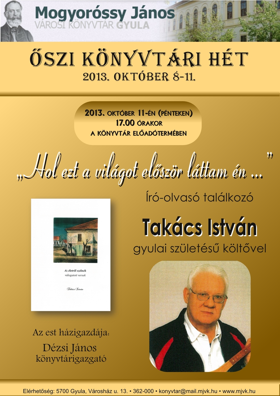 Dr. Takács István gyulai születésű költővel beszélget Dézsi János, a Mogyoróssy János Városi Könyvtár igazgatója október 11-én, pénteken 17 órától a bibliotéka Simonyi-olvasótermében. Az irodalmi estet az Őszi könyvtári hét keretében rendezik meg. Az "Összefogás a könyvtárakért" elnevezésű programsorozathoz kapcsolódó rendezvény ingyenesen látogatható.
