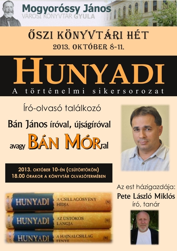 Bán János íróval, újságíróval találkozhatnak az érdeklődők október 10-én, csütörtökön a Mogyoróssy János Városi Könyvtár Simonyi-olvasótermében. A 18 órakor kezdődő író-olvasó találkozón a Bán Mór álnéven alkotó szerzővel Pete László Miklós író, tanár beszélget Hunyadiakról szóló, nagy sikerű könyvsorozatáról.