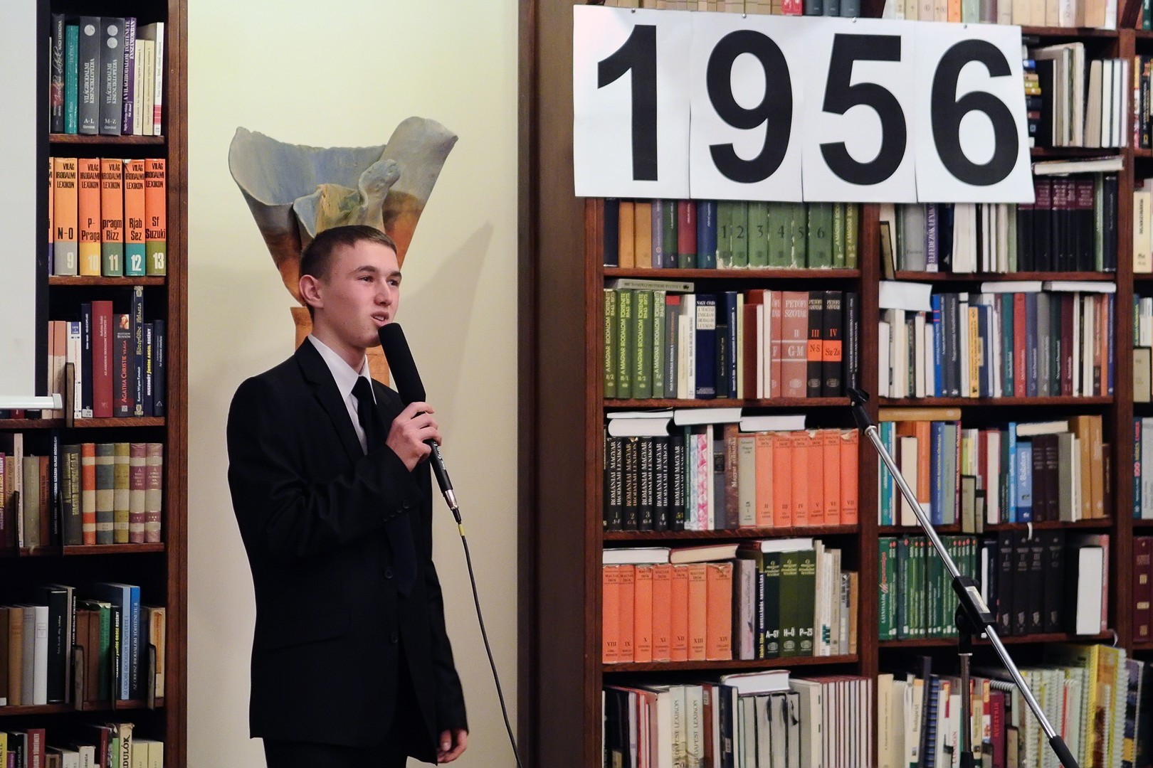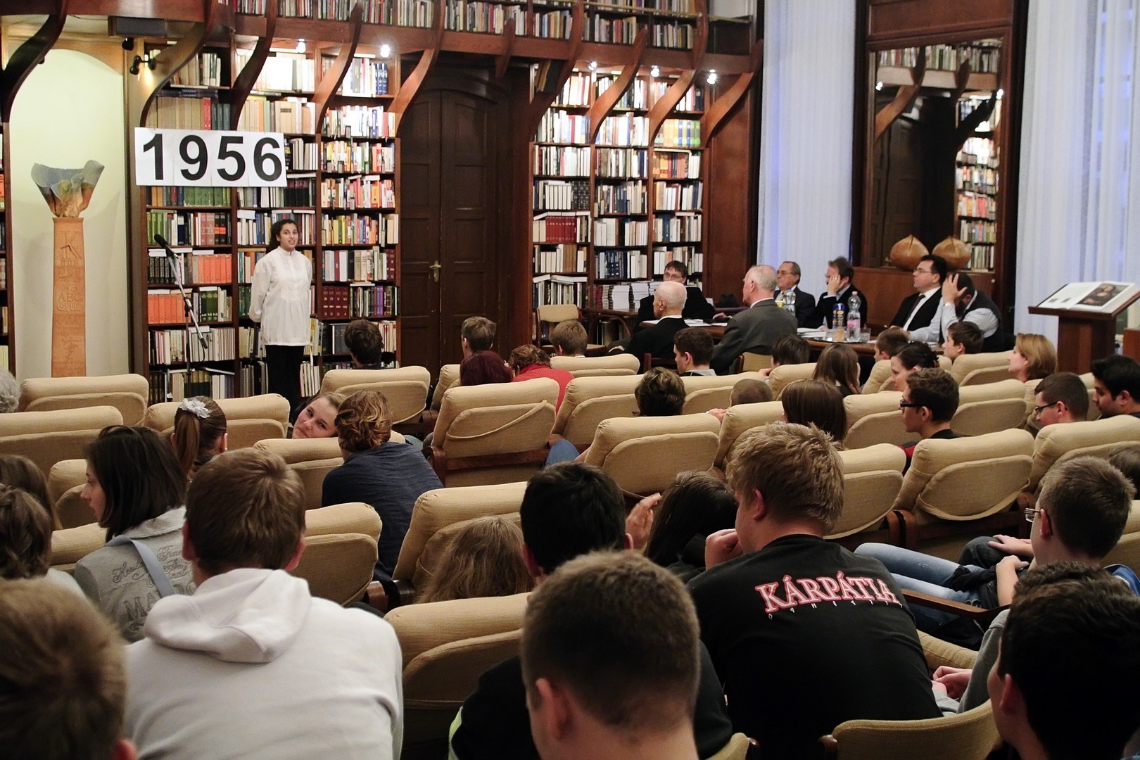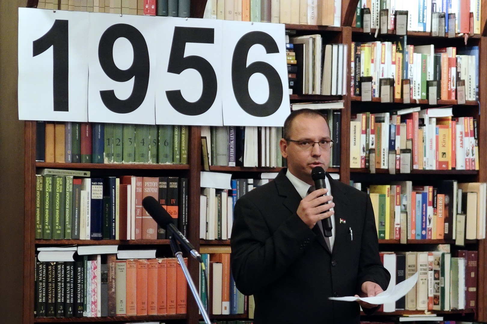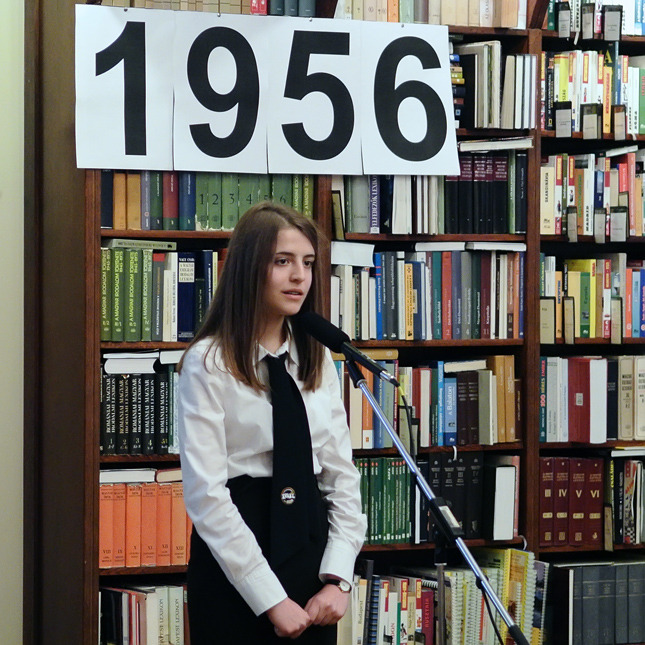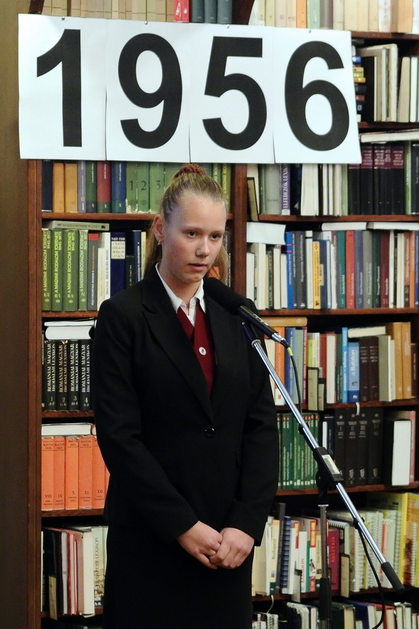 A jelenlévőket a bibliotéka nevében Dézsi János köszöntötte. A könyvtárigazgató diákéveit felidézve arról az időszakról beszélt, amikor a történelemkönyvekben még hamis színben tüntették fel az 1956-os eseményeket. Hozzátette: intézményük néhány éve élénken foglalkozik azzal a gondolattal, hogy rendhagyó történelemórák keretében biztosít lehetőséget a diákoknak ismereteik bővítésére.