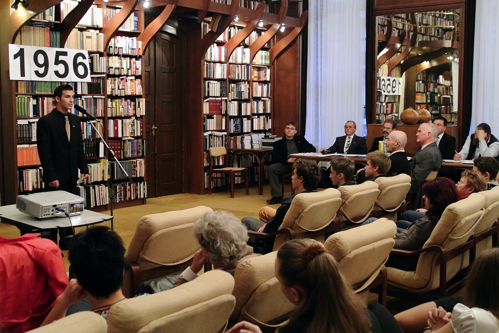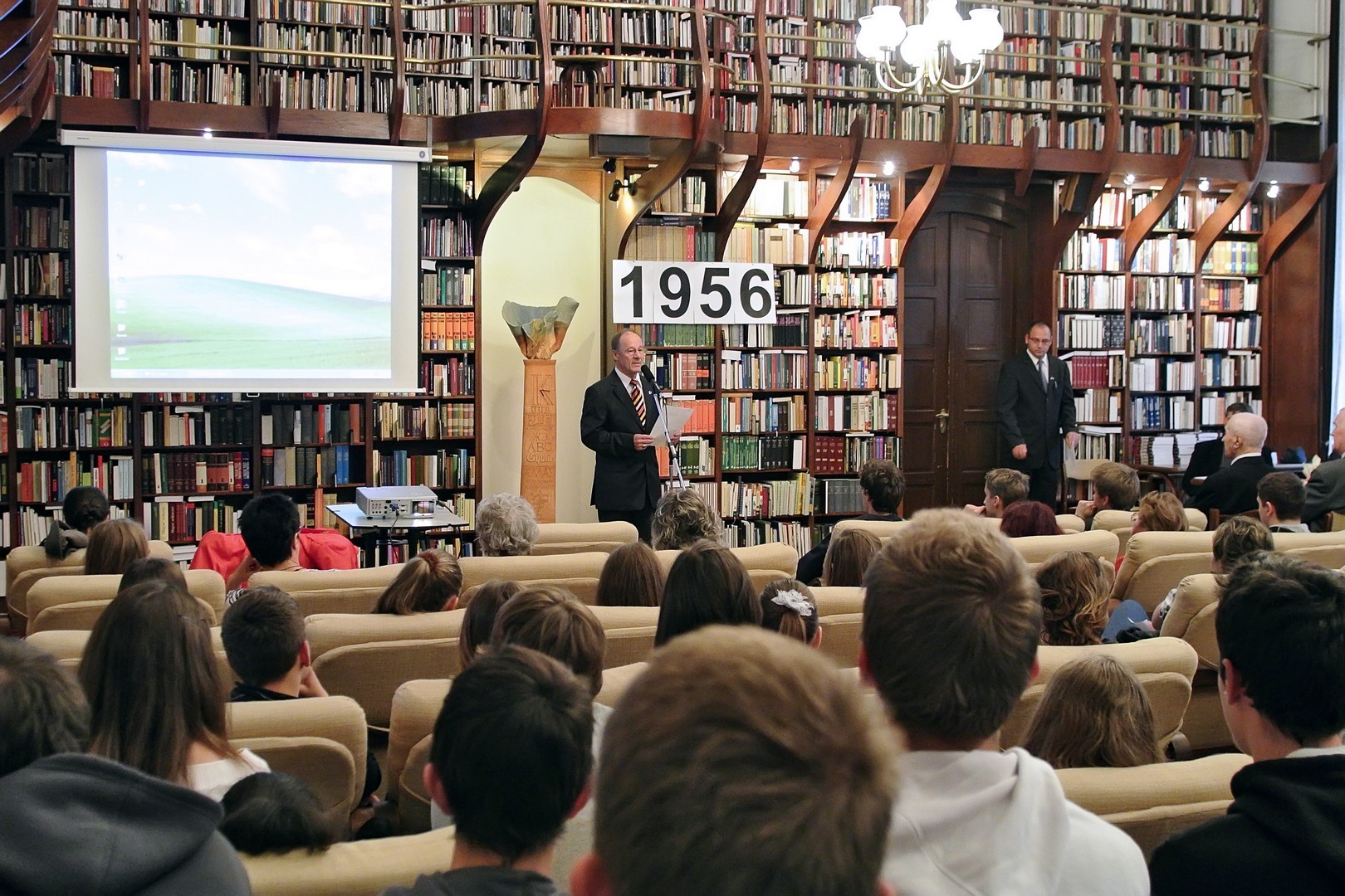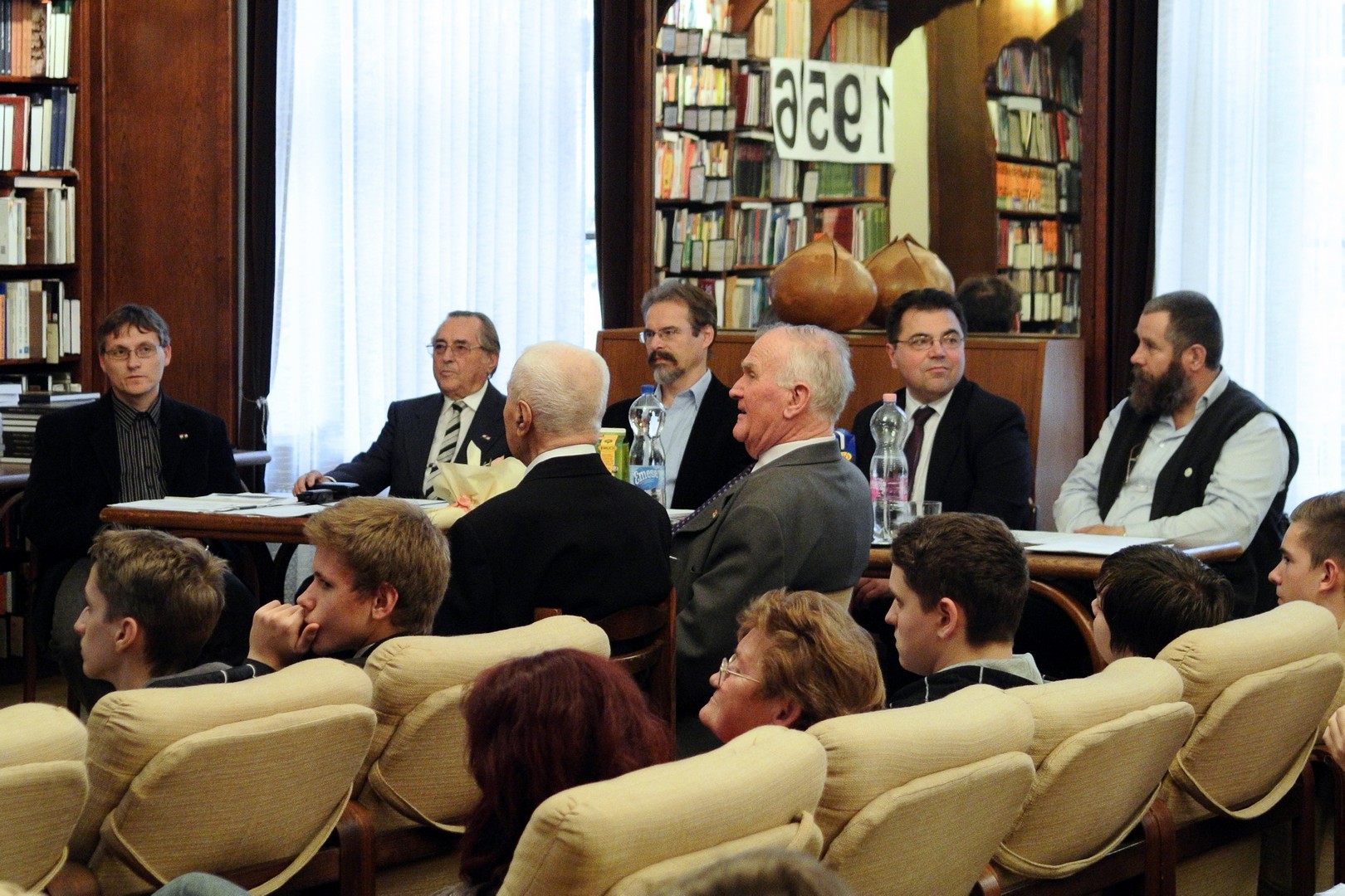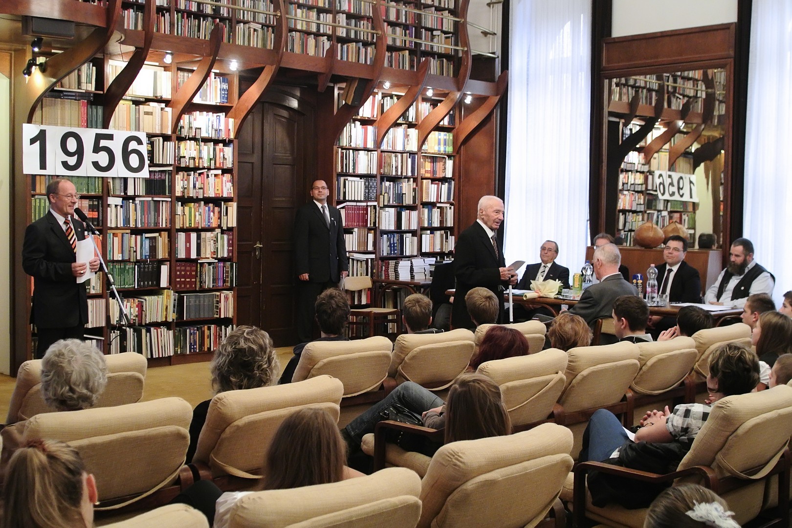 A jelenlévőket a bibliotéka nevében Dézsi János köszöntötte. A könyvtárigazgató diákéveit felidézve arról az időszakról beszélt, amikor a történelemkönyvekben még hamis színben tüntették fel az 1956-os eseményeket. Hozzátette: intézményük néhány éve élénken foglalkozik azzal a gondolattal, hogy rendhagyó történelemórák keretében biztosít lehetőséget a diákoknak ismereteik bővítésére.