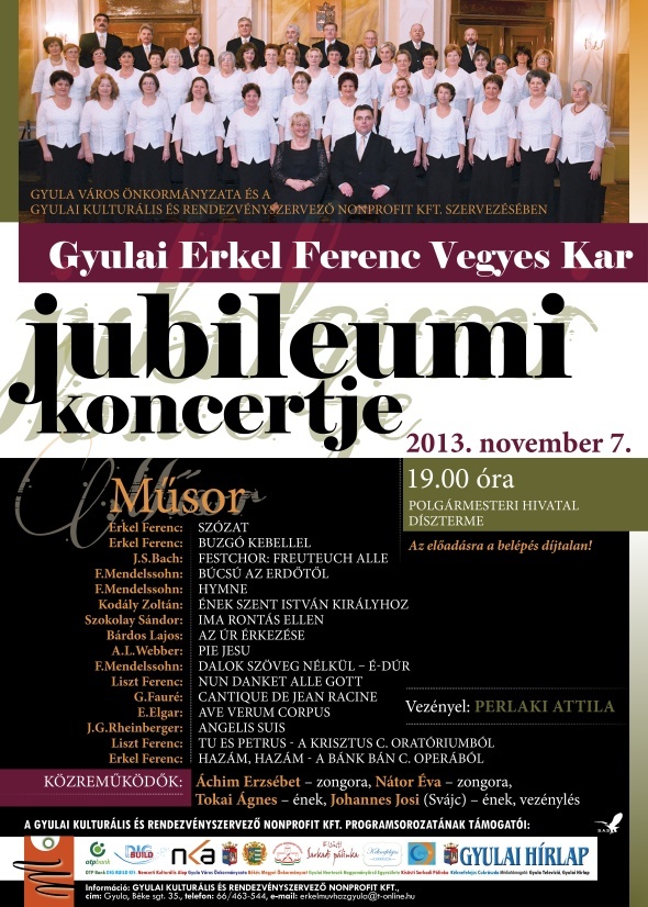 Három évtizede alakult a gyulai Erkel Ferenc Vegyes Kar. Jubileumi koncertjüket stílusosan a névadó zeneszerző születésnapján, november 7-én, csütörtökön 19 órakor tartják a gyulai városháza dísztermében.