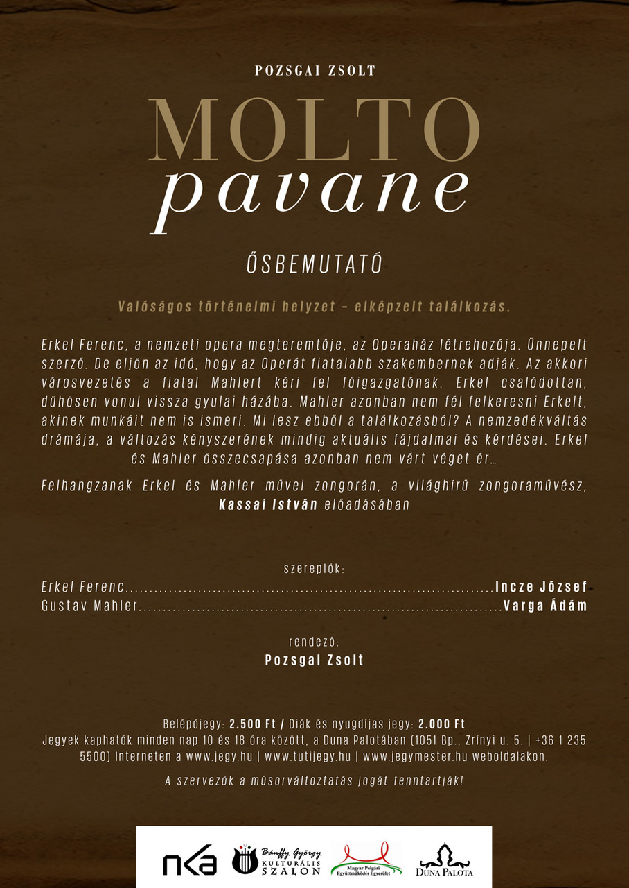 Az ősbemutató egy valóságos történelmi helyzetet, a fiatal Mahler (Varga Ádám) és Erkel (Incze József) elképzelt találkozását mutatja be az idősödő zeneszerző gyulai otthonában. A Pozsgai Zsolt által rendezett Molto Pavane című mű egyik legfontosabb eleme, hogy felhangzanak Erkel és Mahler művei zongorán, a világhírű előadóművész, Kassai István előadásában.