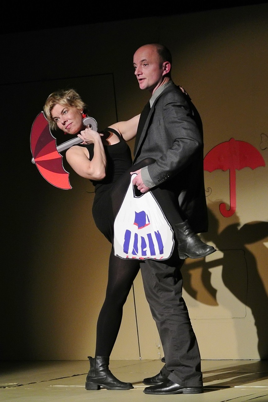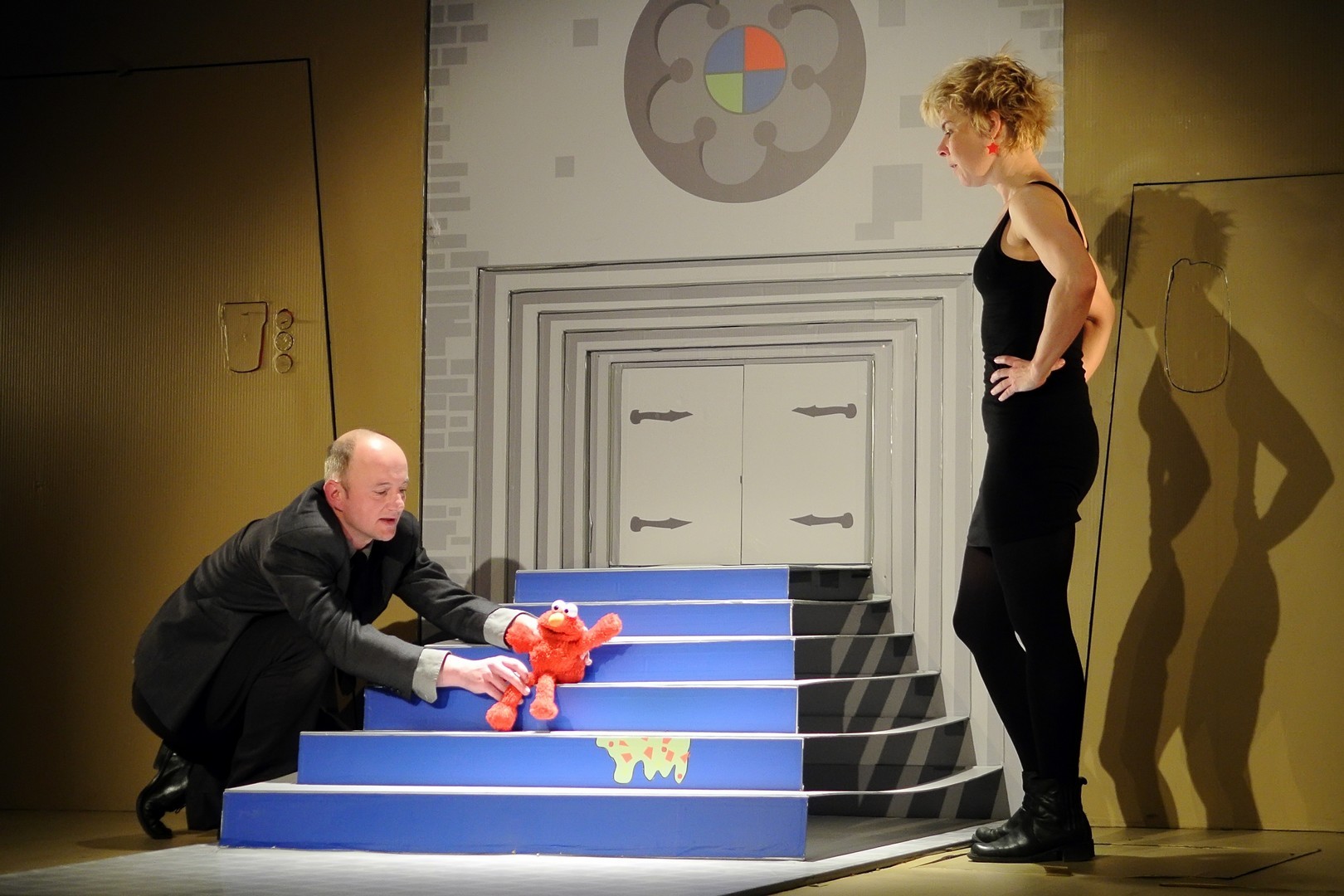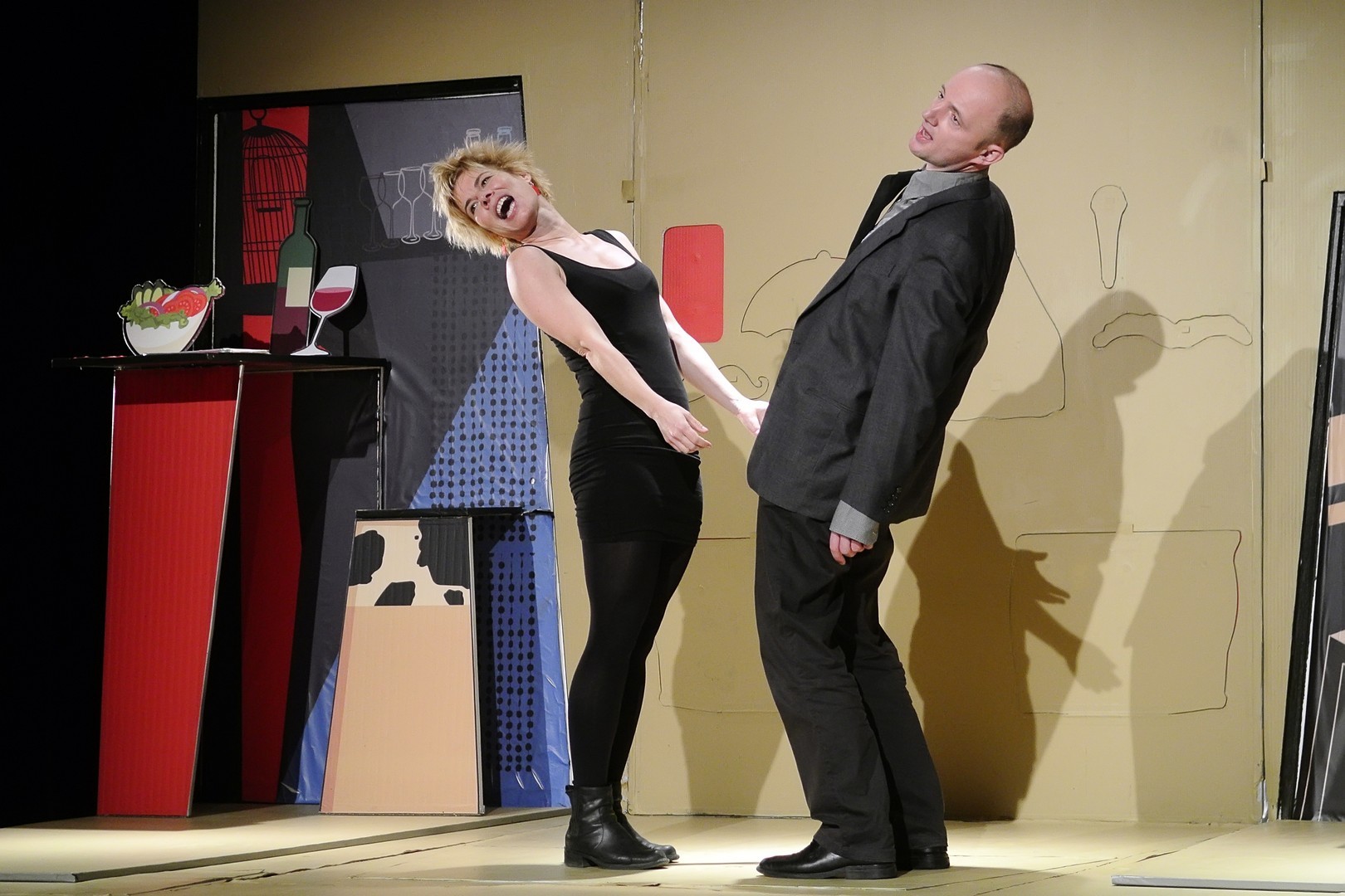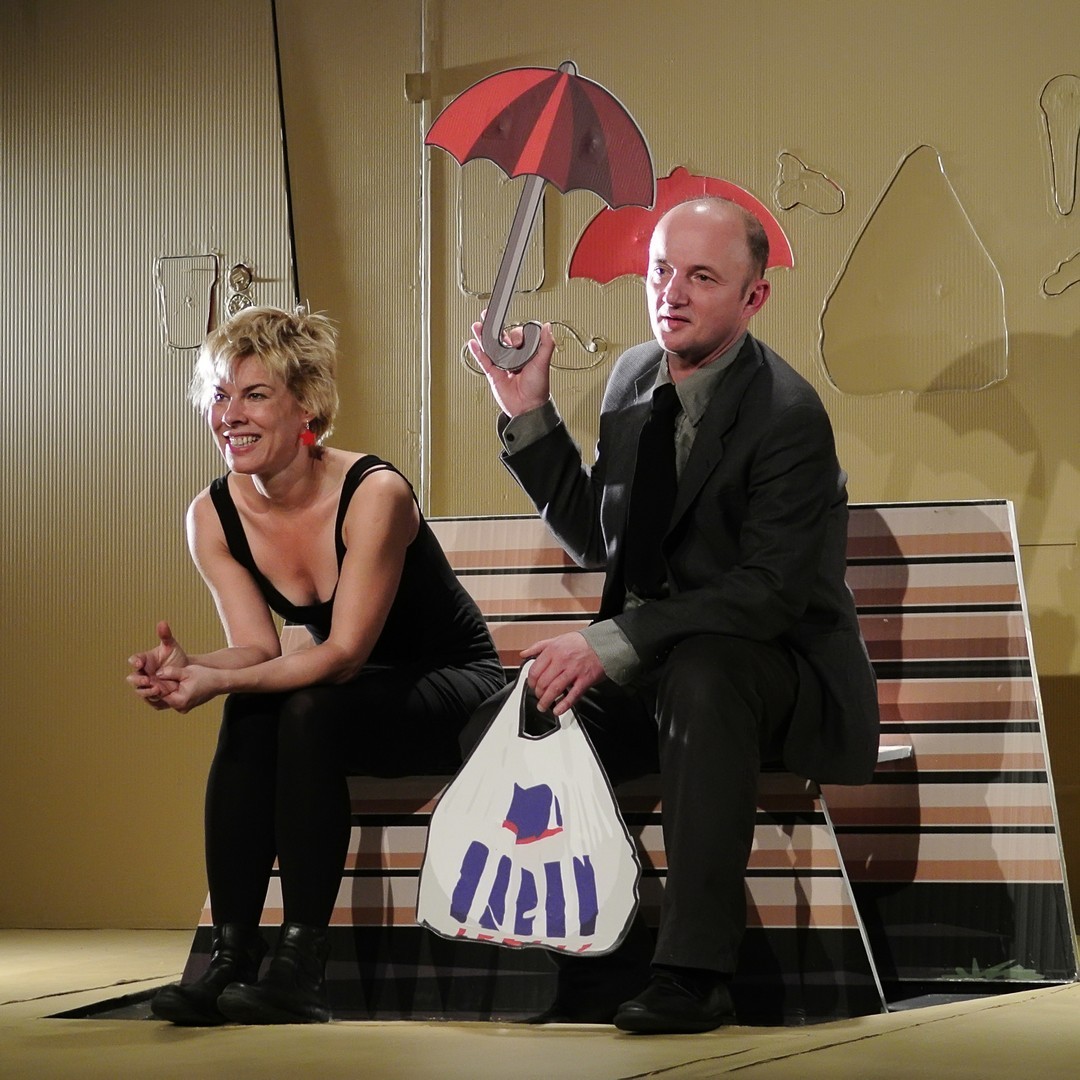 A stilizált térhez jól illeszkedett a színészek sokszor elnagyolt, jelzésszerű, futást vagy verekedést imitáló mozgása. Pelsőczy Réka és Kocsis Gergely tökéletes összhangban működtek együtt, végig gördülékenyen folytak a párbeszédek. A darab igazi humorforrását a történet tolmácsolásának mikéntje adta: a szereplők ugyanis – amellett, hogy gondolataikat is megosztották a nézőkkel – narrátorként és mellékszereplők bőrébe bújva is feltűntek a színpadon, s játékukhoz plüssbábokat, valamint a díszletből kiemelhető papírtárgyakat is felhasználtak. Az előadásba ötletesen beleillesztett kellékekre jó példa a kartonlábakkal eljátszott ágyjelenet, amely a darab egyik leghatásosabb része volt.
