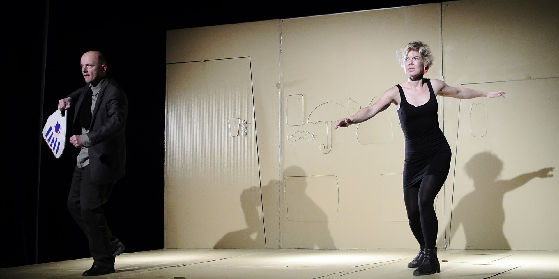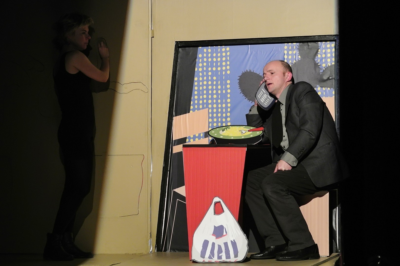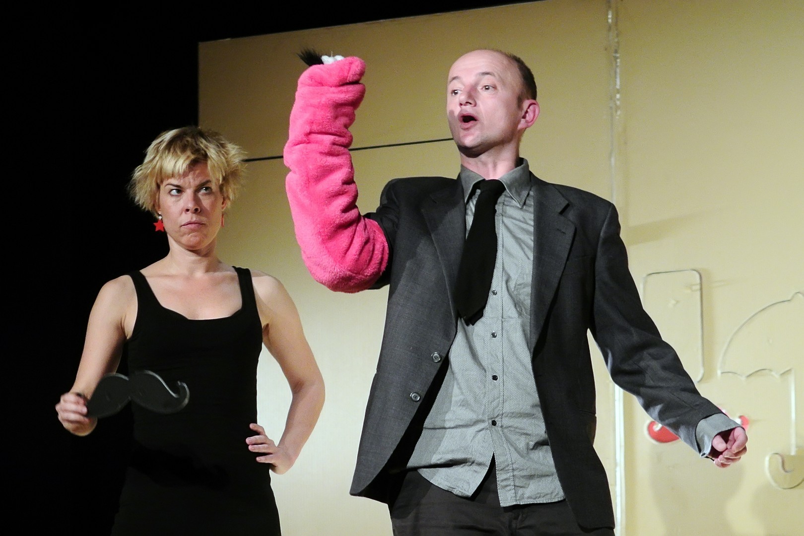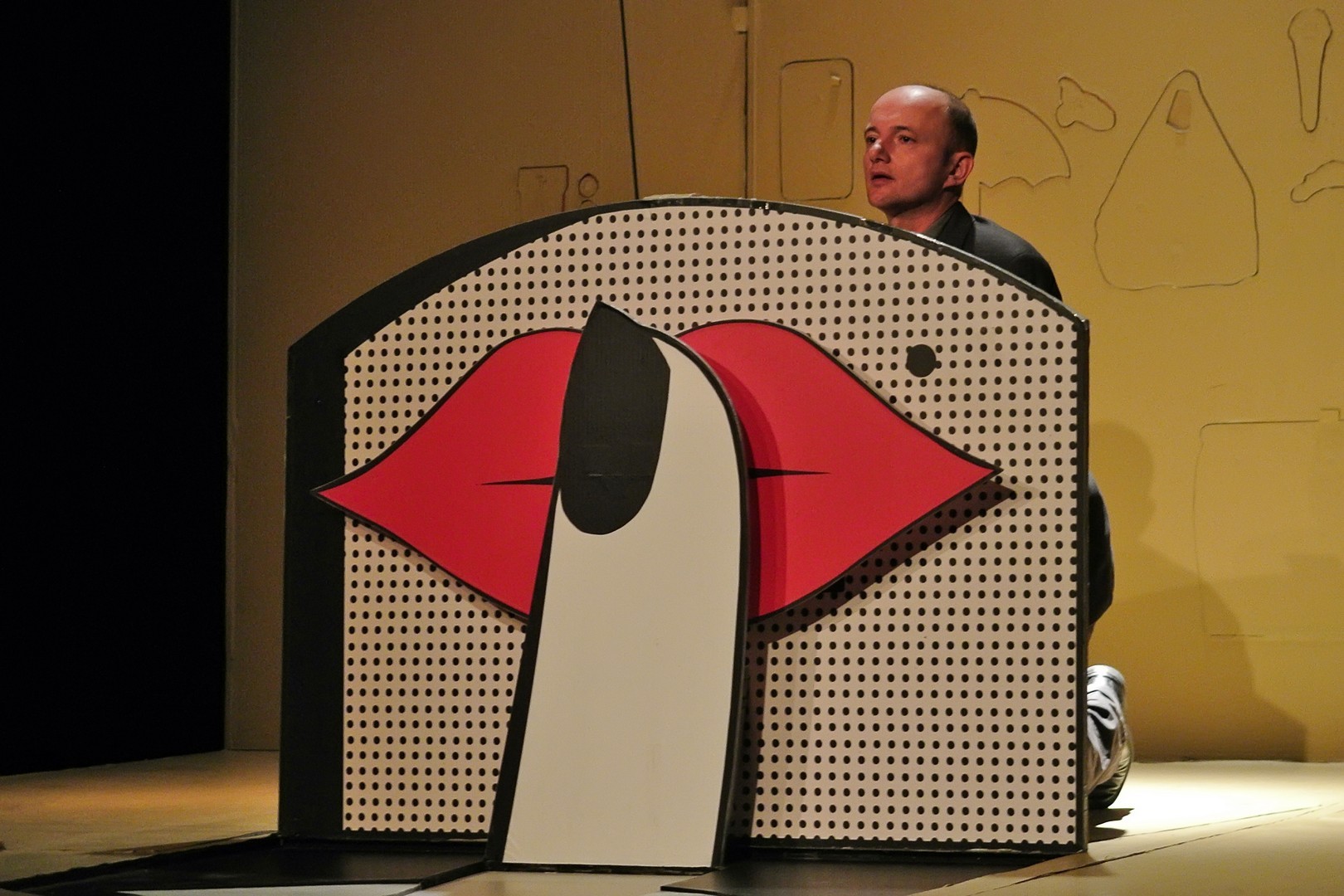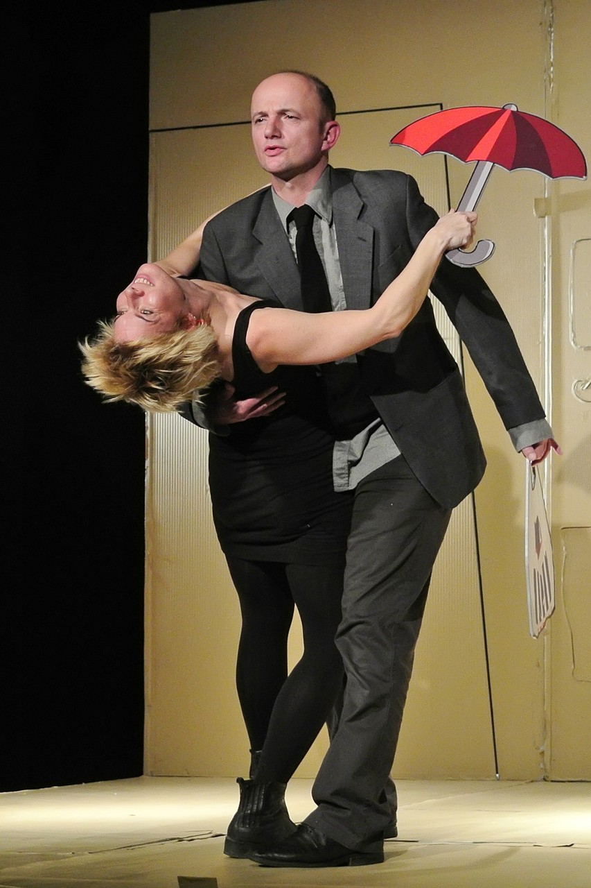A stilizált térhez jól illeszkedett a színészek sokszor elnagyolt, jelzésszerű, futást vagy verekedést imitáló mozgása. Pelsőczy Réka és Kocsis Gergely tökéletes összhangban működtek együtt, végig gördülékenyen folytak a párbeszédek. A darab igazi humorforrását a történet tolmácsolásának mikéntje adta: a szereplők ugyanis – amellett, hogy gondolataikat is megosztották a nézőkkel – narrátorként és mellékszereplők bőrébe bújva is feltűntek a színpadon, s játékukhoz plüssbábokat, valamint a díszletből kiemelhető papírtárgyakat is felhasználtak. Az előadásba ötletesen beleillesztett kellékekre jó példa a kartonlábakkal eljátszott ágyjelenet, amely a darab egyik leghatásosabb része volt.
