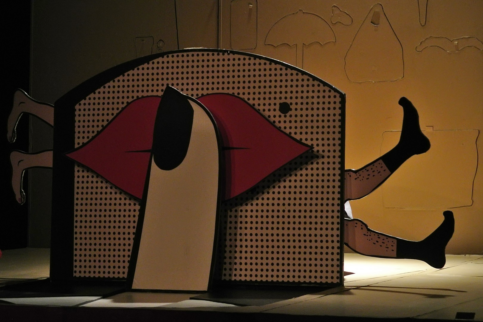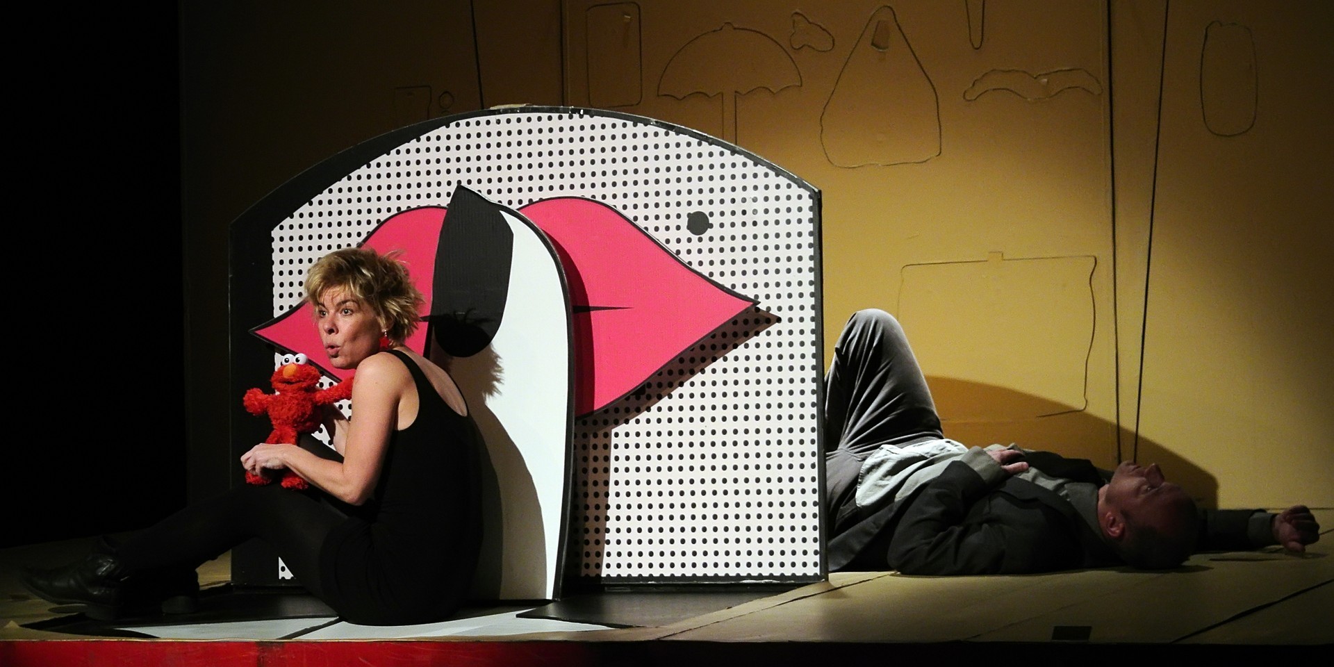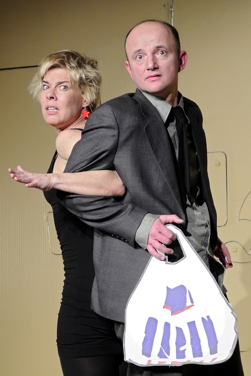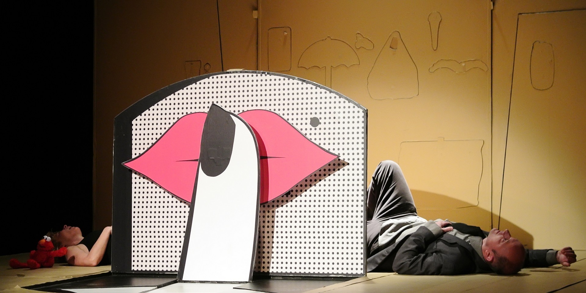 A stilizált térhez jól illeszkedett a színészek sokszor elnagyolt, jelzésszerű, futást vagy verekedést imitáló mozgása. Pelsőczy Réka és Kocsis Gergely tökéletes összhangban működtek együtt, végig gördülékenyen folytak a párbeszédek. A darab igazi humorforrását a történet tolmácsolásának mikéntje adta: a szereplők ugyanis – amellett, hogy gondolataikat is megosztották a nézőkkel – narrátorként és mellékszereplők bőrébe bújva is feltűntek a színpadon, s játékukhoz plüssbábokat, valamint a díszletből kiemelhető papírtárgyakat is felhasználtak. Az előadásba ötletesen beleillesztett kellékekre jó példa a kartonlábakkal eljátszott ágyjelenet, amely a darab egyik leghatásosabb része volt.