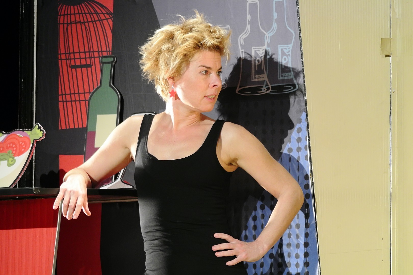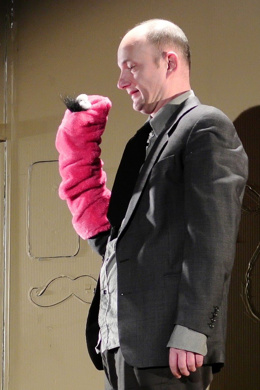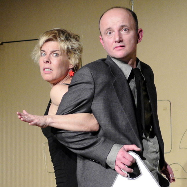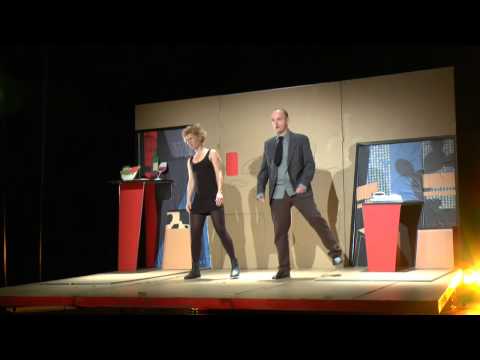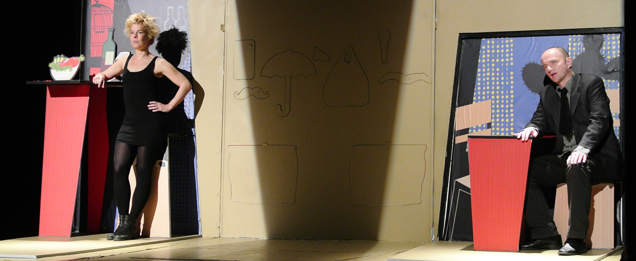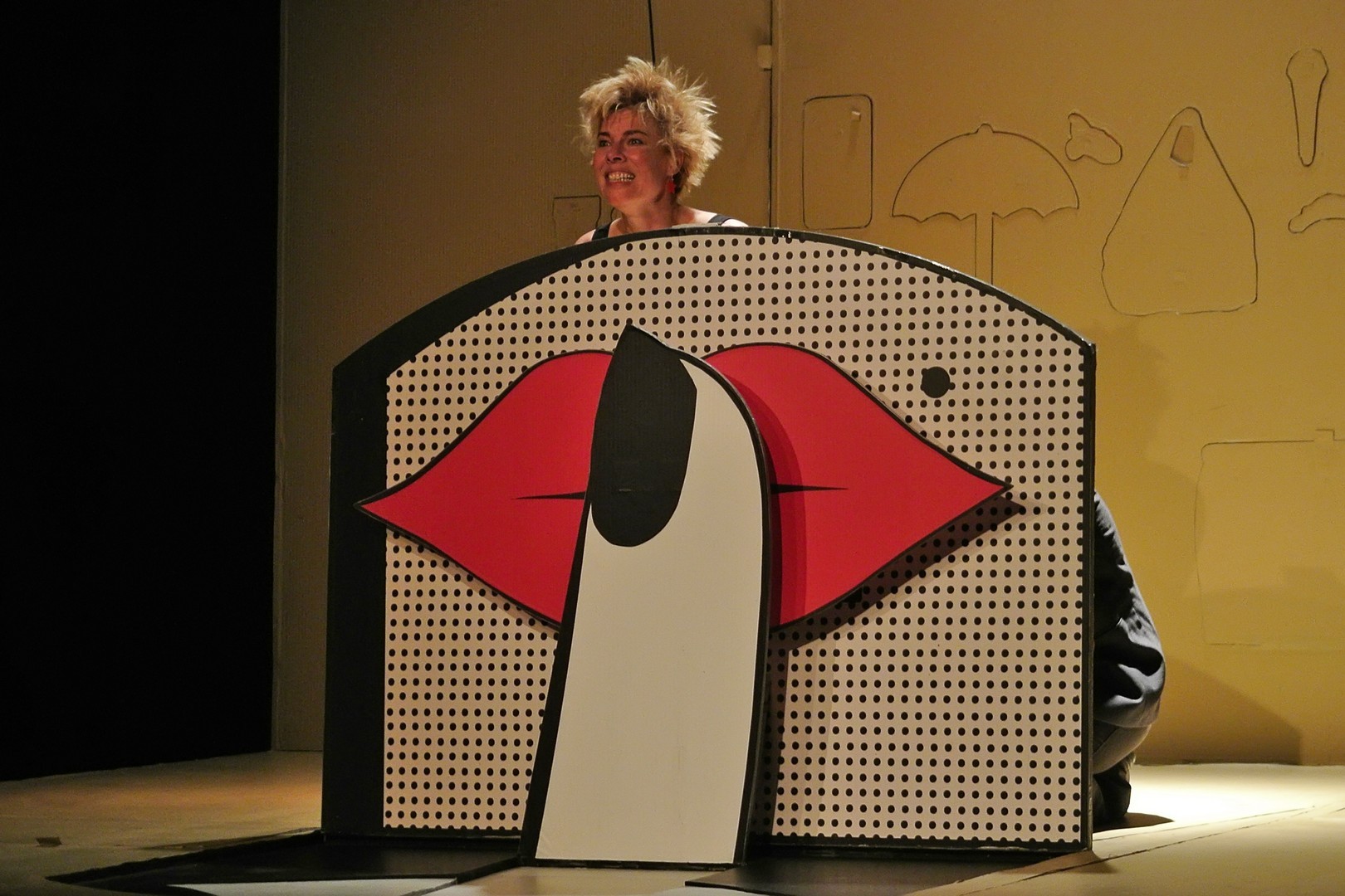 A stilizált térhez jól illeszkedett a színészek sokszor elnagyolt, jelzésszerű, futást vagy verekedést imitáló mozgása. Pelsőczy Réka és Kocsis Gergely tökéletes összhangban működtek együtt, végig gördülékenyen folytak a párbeszédek. A darab igazi humorforrását a történet tolmácsolásának mikéntje adta: a szereplők ugyanis – amellett, hogy gondolataikat is megosztották a nézőkkel – narrátorként és mellékszereplők bőrébe bújva is feltűntek a színpadon, s játékukhoz plüssbábokat, valamint a díszletből kiemelhető papírtárgyakat is felhasználtak. Az előadásba ötletesen beleillesztett kellékekre jó példa a kartonlábakkal eljátszott ágyjelenet, amely a darab egyik leghatásosabb része volt.