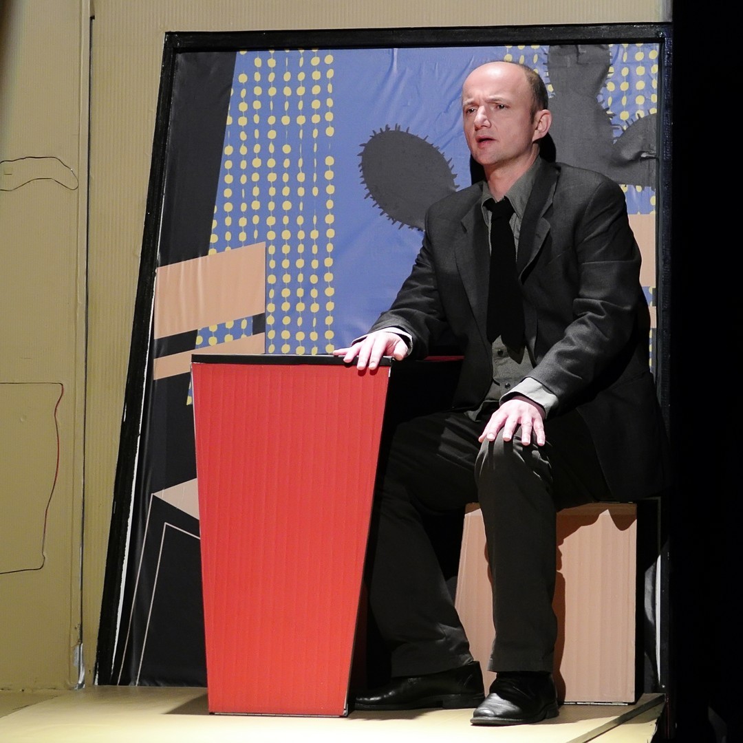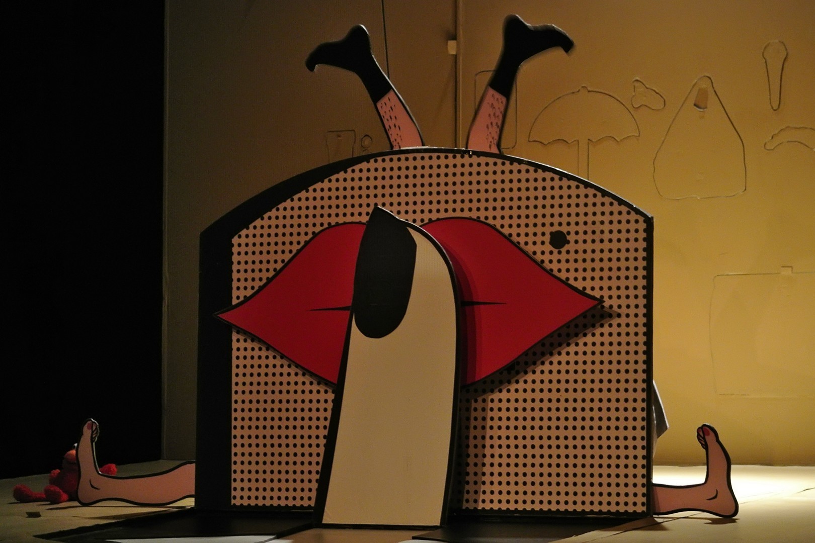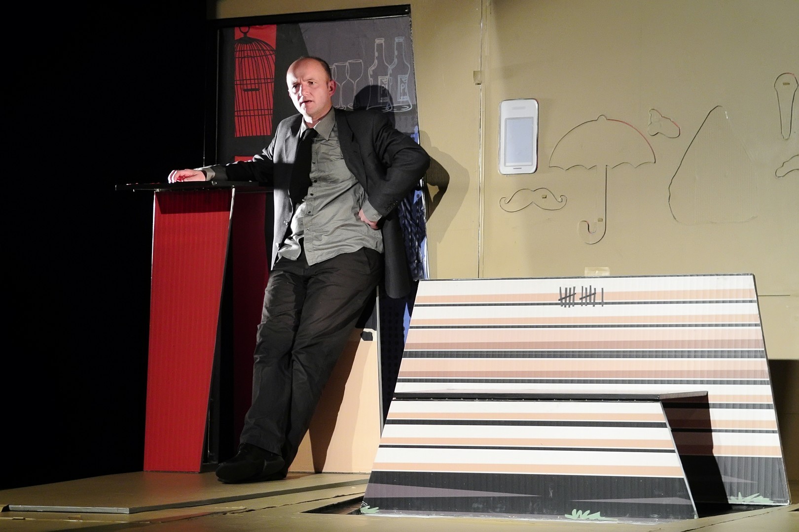 Az előadás stilizált térben zajlott. A kartonépítménybe rejtett, kiemelhető papírbútorok és papírtárgyak között képregényhősként jelent meg a két harmincas éveiben járó főhős. Nem meglepő, hogy Taksás Mihály ötletes díszlettervét a Vidor Fesztiválon a legjobbnak választották, a szokatlan, egyedi játéktérben ugyanis nehézség nélkül lehetett megoldani a helyszínváltásokat.