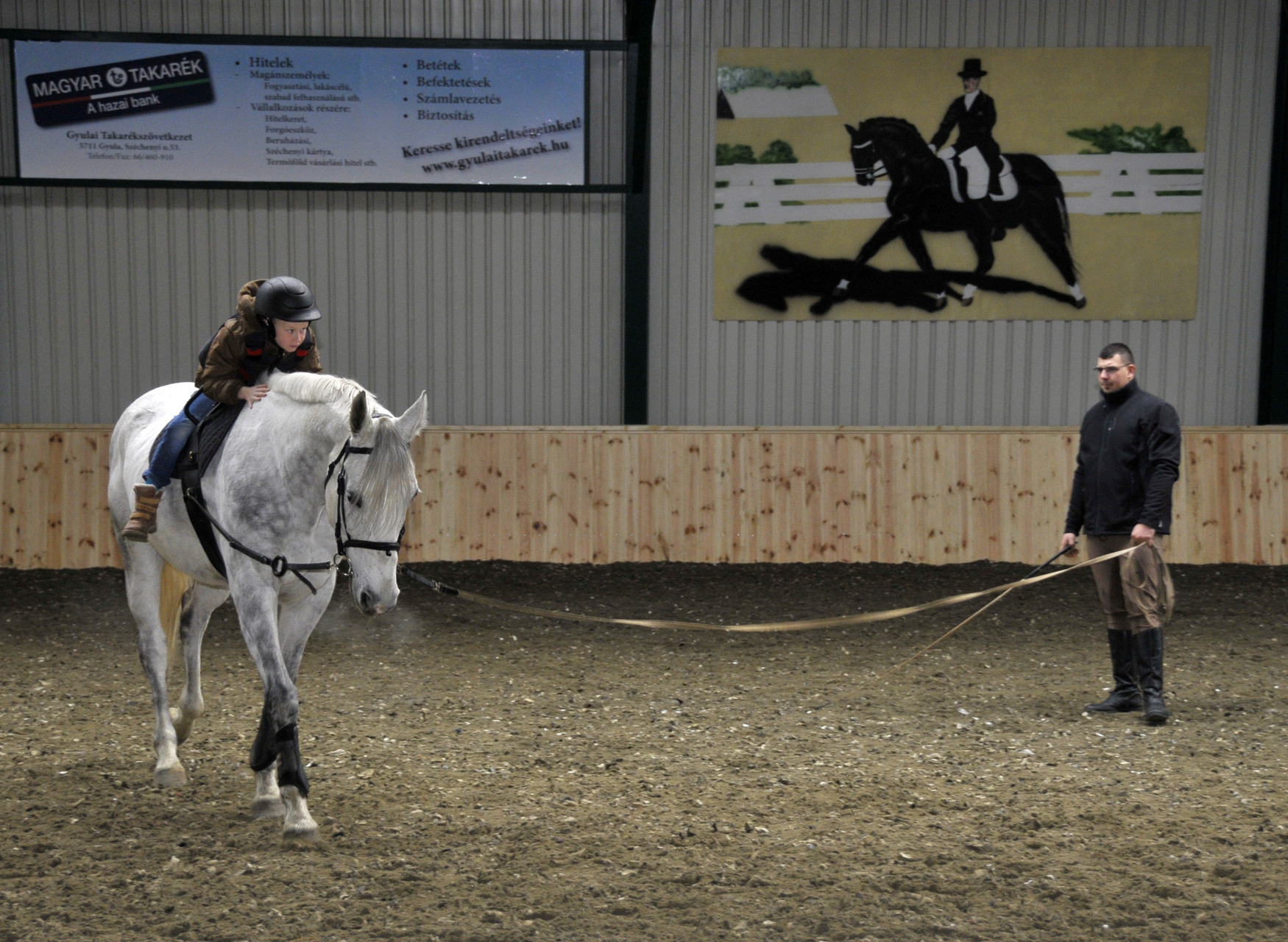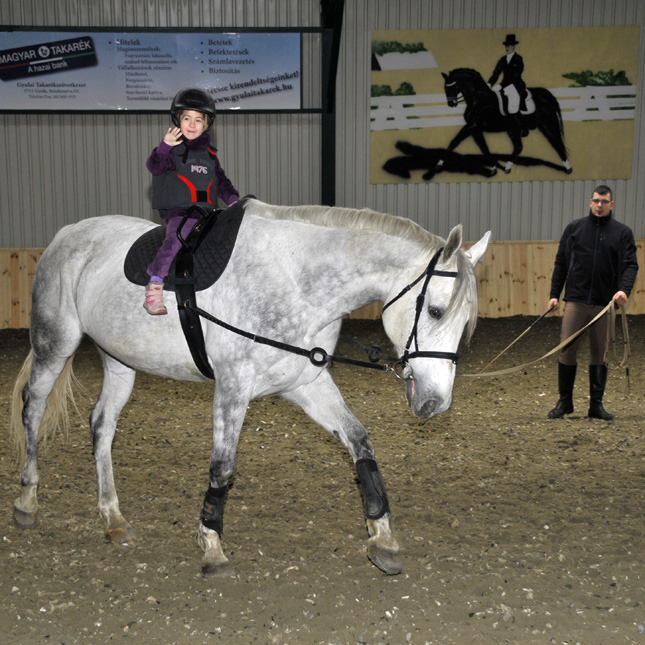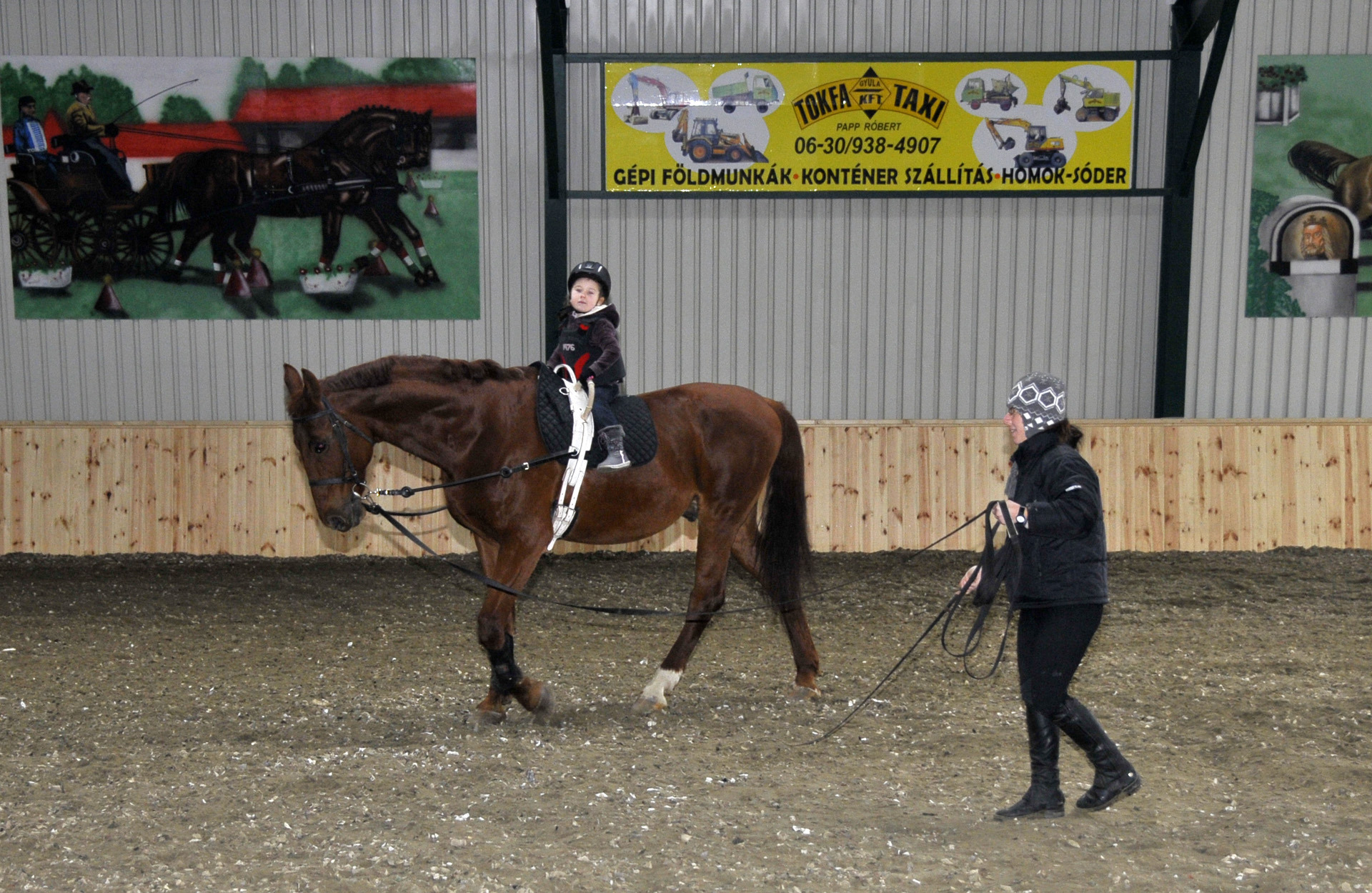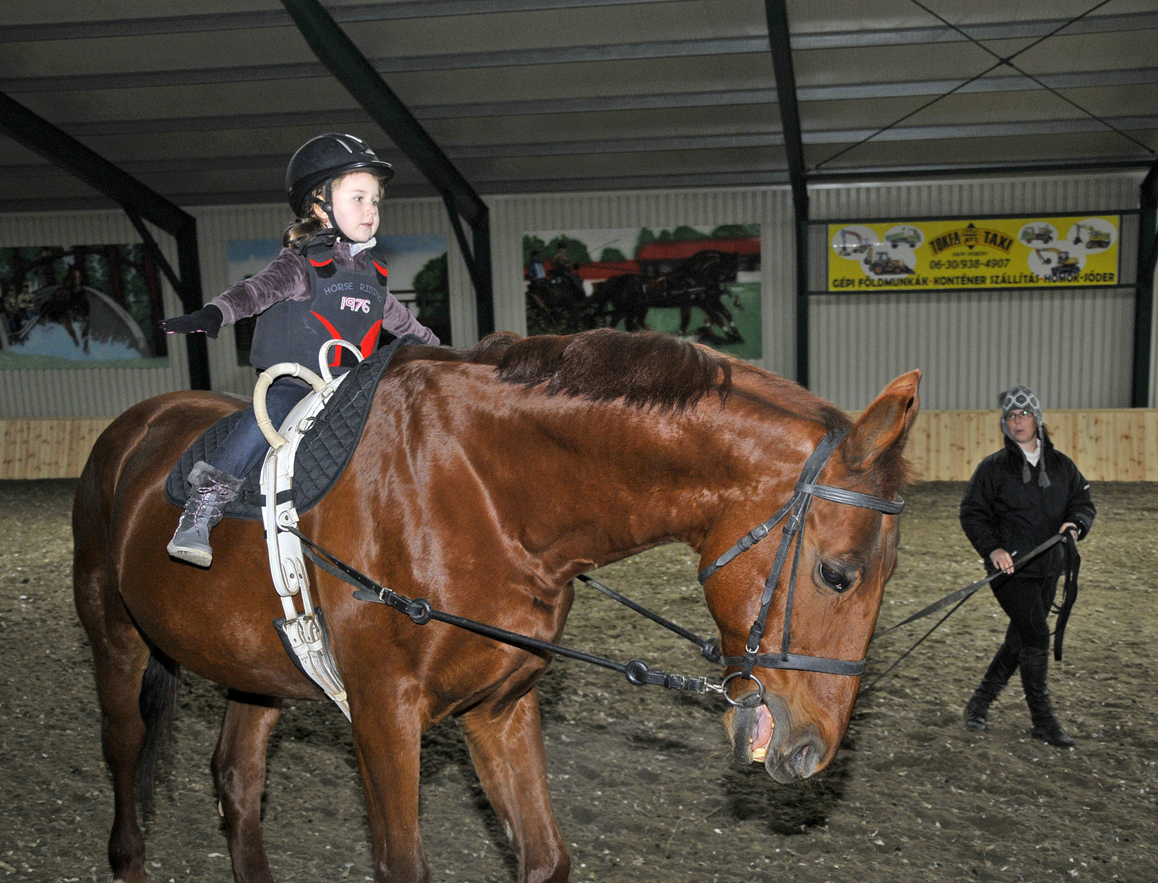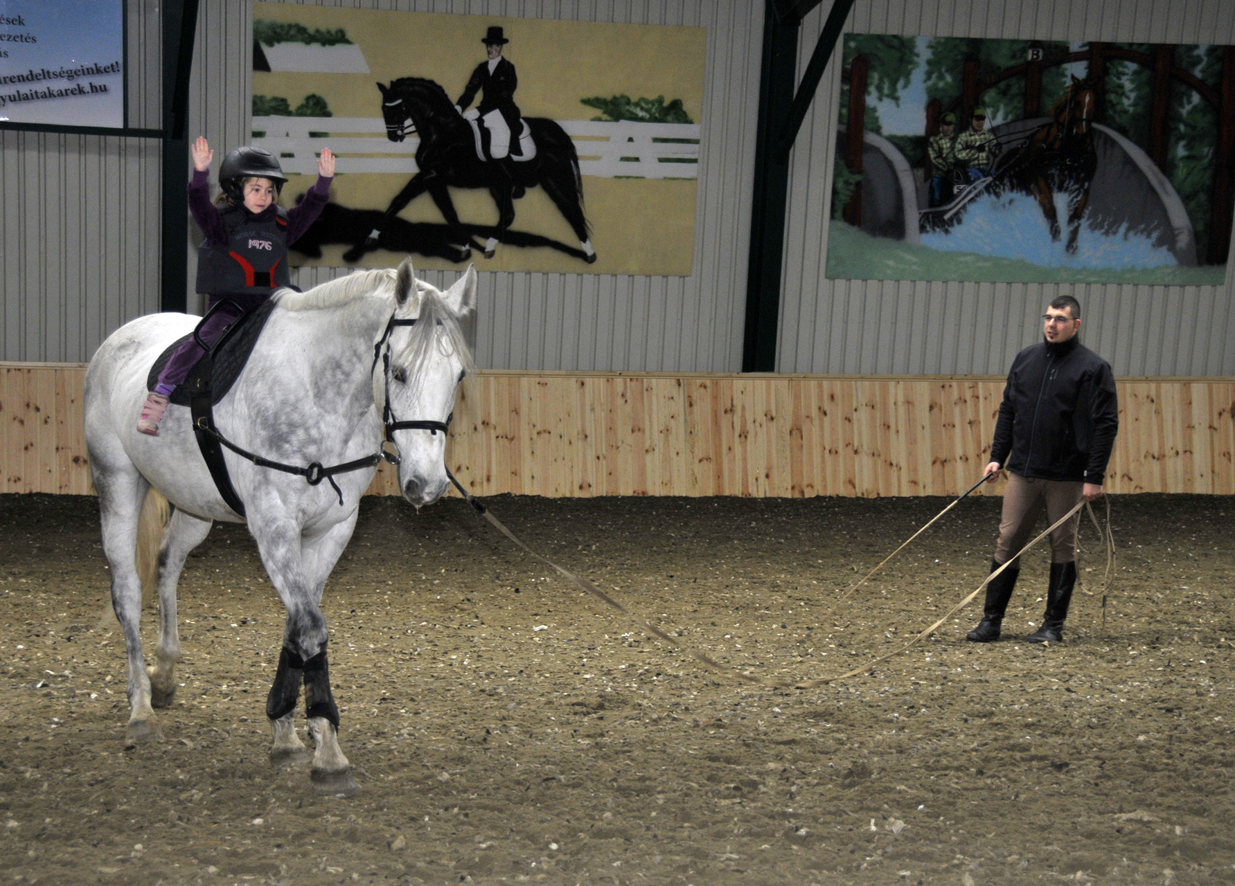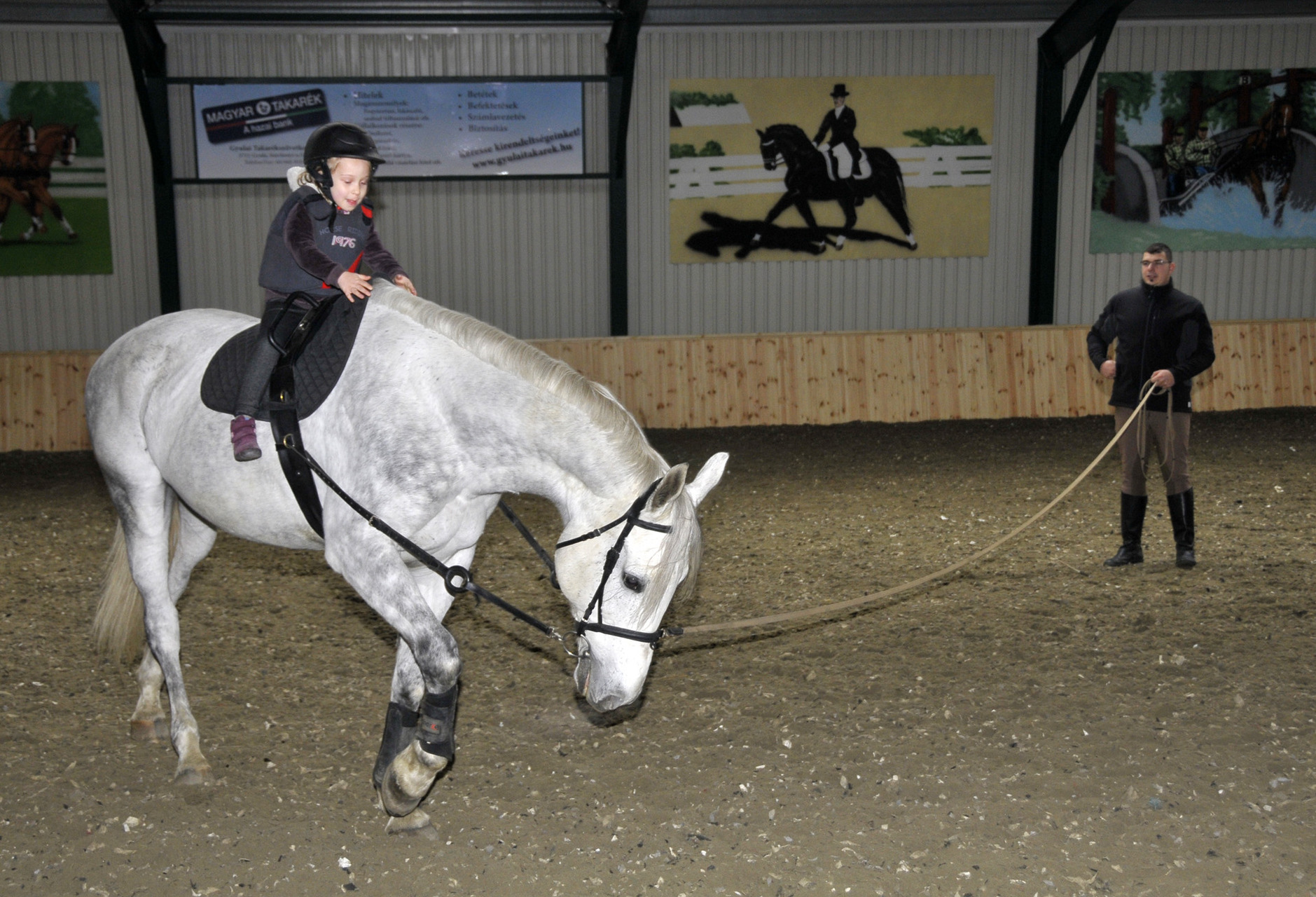 – Öt- és nyolcéves kor között a gyerekek mozgása összerendezett, megértik a feladatokat. Mozgáskultúrájuk és egyensúlyérzékük ebben a korban fejleszthető leginkább – magyarázta a tulajdonos, hogy miért érdemes már óvodáskorban elkezdeni az oktatást. A biztonsági mellénnyel és kobakkal felszerelt csemeték egyebek mellett nyújtógyakorlatokat végeztek a futószáron vezetett lovon, a csutakolást és a ló megkötözését pedig egy pónin gyakorolhatták.