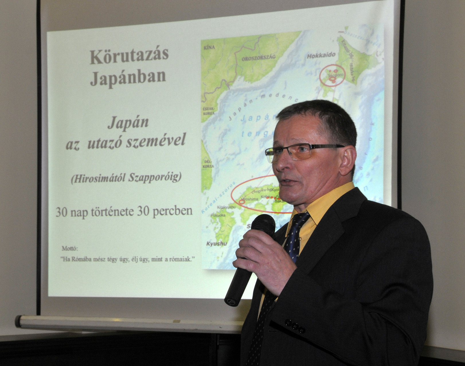 Hankó Ferenc, a Gyulai Magyar-Japán Kulturális Egyesület (MAPON) alelnöke egy képes ismeretterjesztő előadással indította a beszámolók sorát a 128 milliós lélekszámú, 6852 szigetből álló országról. Hankó Ferenc az egzotikus országban tett körutazása alkalmával rengeteg ismeretre és tapasztalatra tett szert, így átfogó bemutatójában az ország földrajzán, történelmén, vallásán és gasztronómiáján kívül számos szokatlan és érdekes hagyomány, illem is előkerült. Európai embernek szokatlanok a „hátulról” kezdődő könyvek, a kézfogás helyetti meghajlás, csakúgy mint az, hogy az ajtónál a nők engedik előre a férfiakat, vagy hogy szürcsöléssel kell jelezni, hogy ízlik az étel, vagy az, hogy nyilvánosan nem fújhatjuk ki orrunkat.