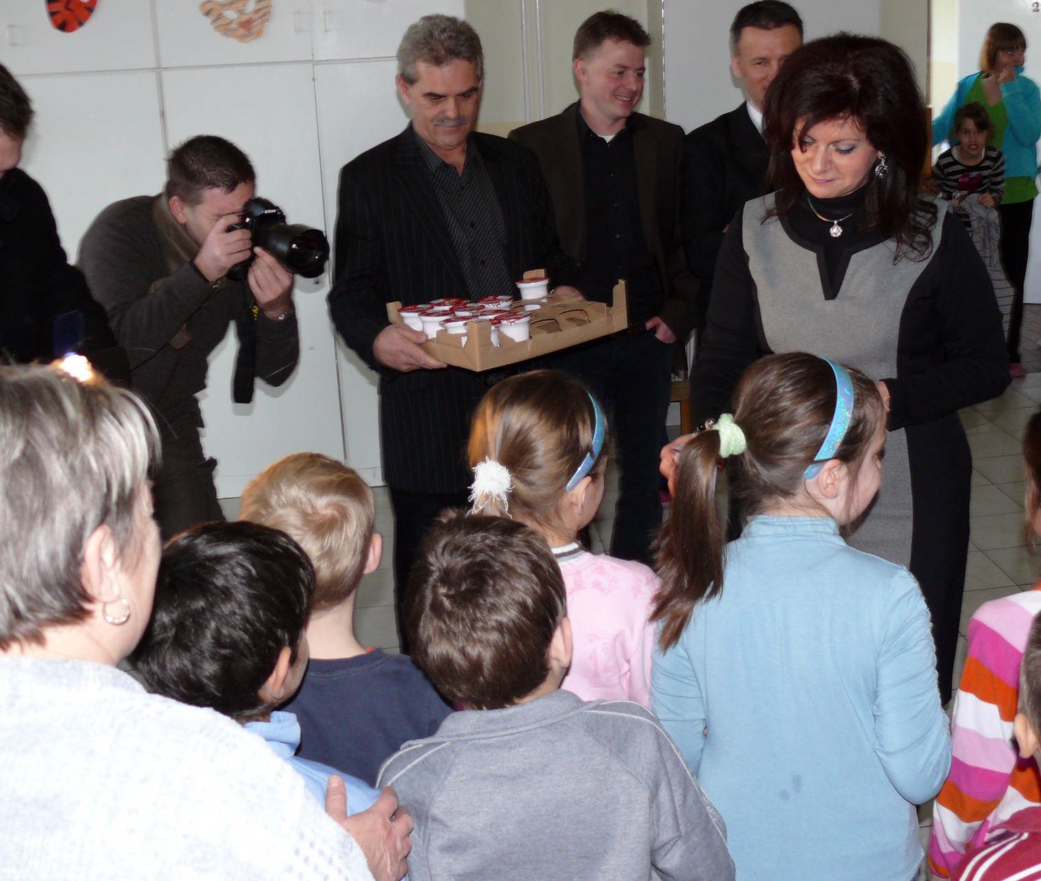 A joghurt kiosztása előtt dr. Görgényi Ernő elmondta, hogy Gyula város Képviselő-testülete tavaly márciusban határozott arról, hogy a közoktatási intézményekbe iskolatejet szállíttat és szerződést írt alá a Happy Tejtermék Kft-vel. Idén a szerződést megújították, a szállító továbbra is hétfőn, szerdán és pénteken eljuttatja a GYAKI általános iskoláiba – 5. Sz. Általános Iskola, Implom iskola, Dürer iskola és BAy iskola – a tejtermékeket.