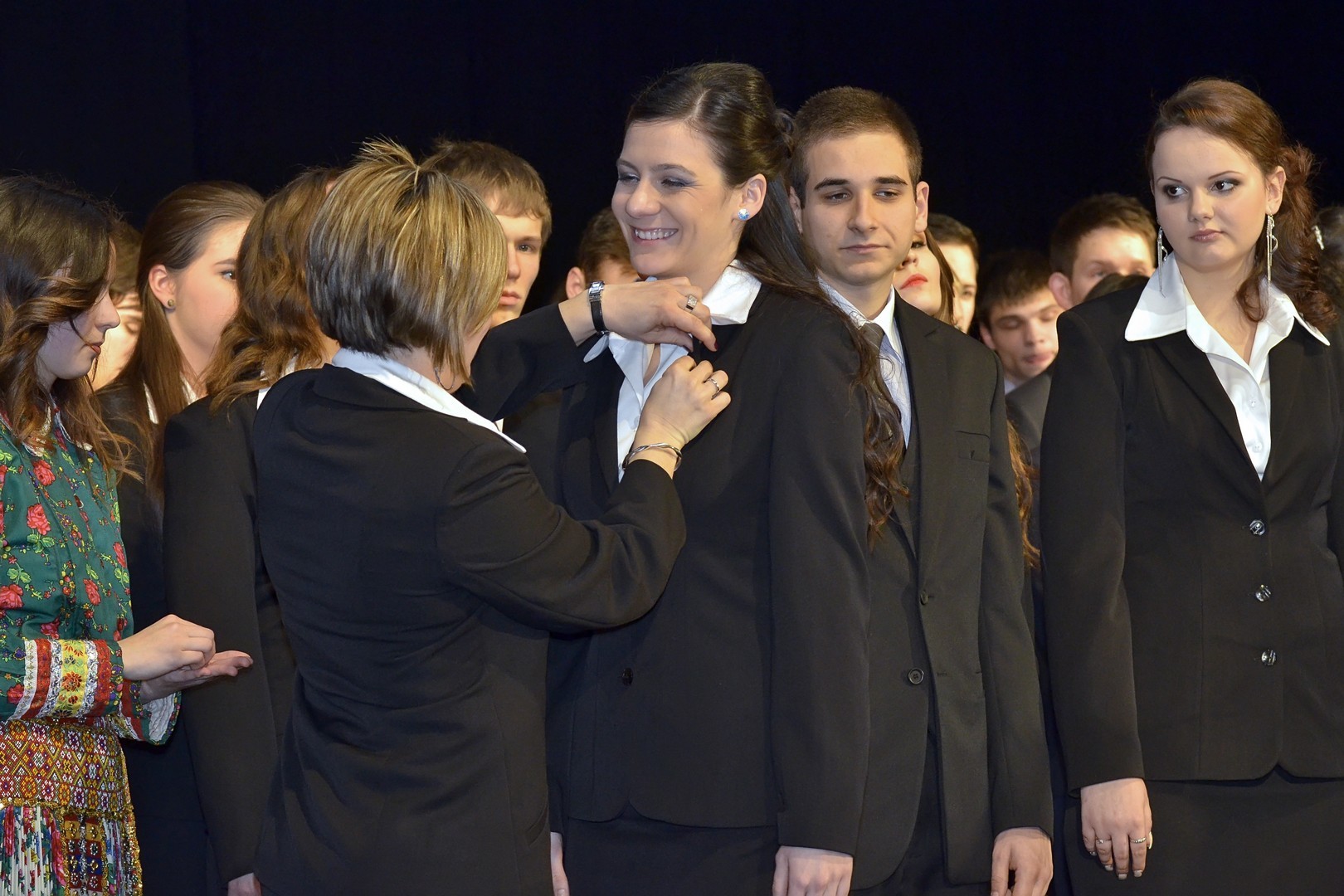 – A szalag hagyományosan kék és fehér színű, s a régi időkben egy zöld gomb fogta ezt össze. Aki egy kicsit is foglalkozott a színek szimbolikus jelentésével, az tudja, hogy a fehér szín a tisztaság, az ártatlanság jelentésével kapcsolódik össze, a kék a hűségével, a zöld pedig egy kicsit az édent előlegezi meg. Amikor az ember élete egyik fordulópontjának közelébe ér, akkor ebből a szimbólumvilágból igyekszik a rá leginkább vonatkozót megválasztani, és életcélt tűzni maga elé – hangzott el a színházteremben.