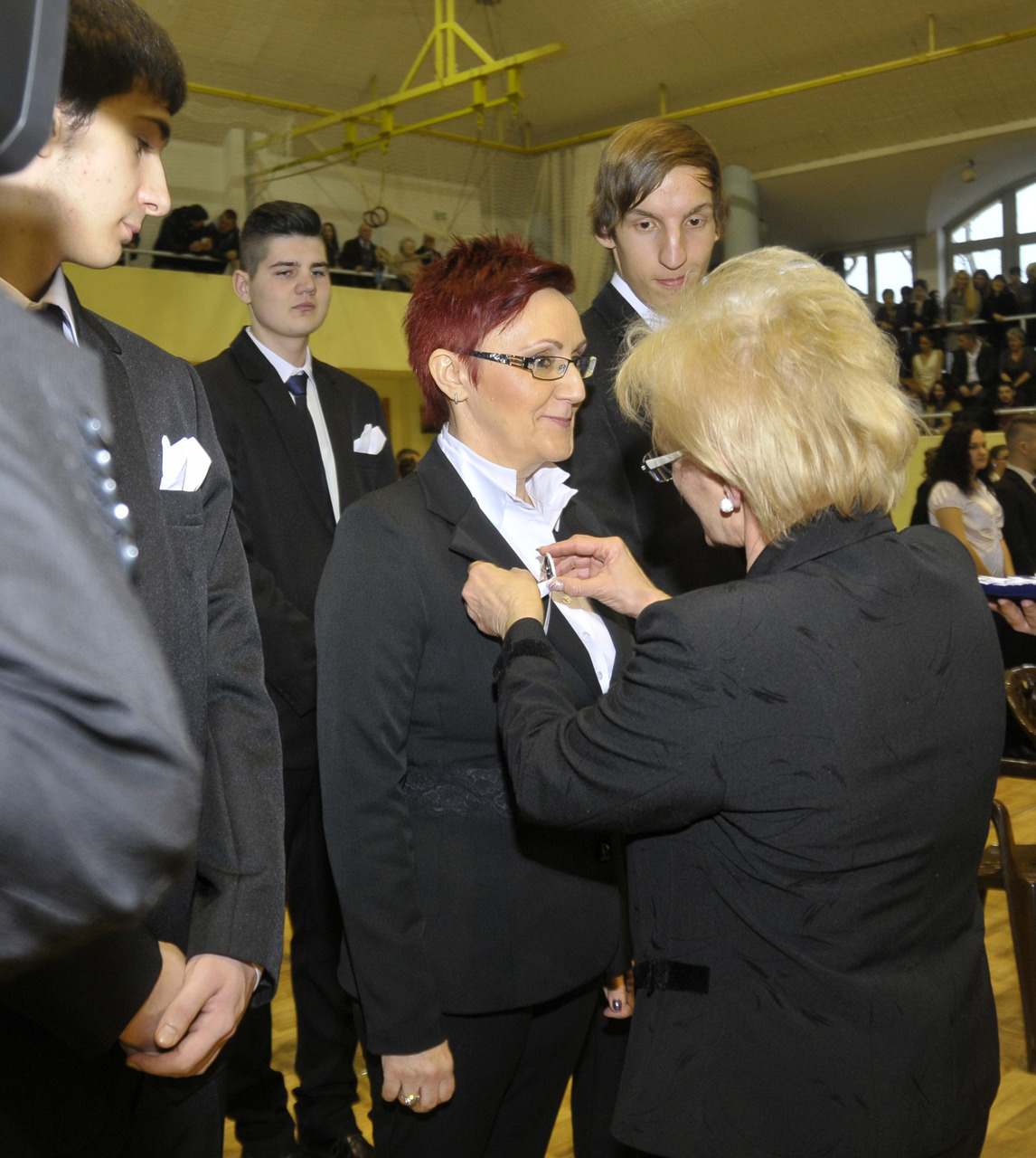 - Feltűzzük ruhátokra a szalagot, ami mától a tiétek, és ami nagyon sok mindent jelent. Jelenti azt, hogy a mai naptól maturandusok, vizsgára készülő diákok és diáklányok vagytok. Izgalmas korszakot éltetek át, próbákat álltatok ki, de éreznetek kellett, hogy tanáraitok, társaitok ott álltak mellettetek, ami segített benneteket abban, hogy tovább haladjatok. A szalag azt is jelzi, hogy most fogtok nekifutni az utolsó akadályoknak, a vizsgáknak, amelyek után újabb és újabb küzdelmek várnak majd rátok. A mai este a ti ünnepetek, de ebben az ünnepi pillanatban se feledkezzetek meg azokról, akik segítettek nektek, tiszteljétek tanáraitokat, tiszteljétek szüleiteket és köszönjétek meg fáradozásaikat, támogatásukat – mondta ünnepi beszédében Kovács Zsuzsanna.