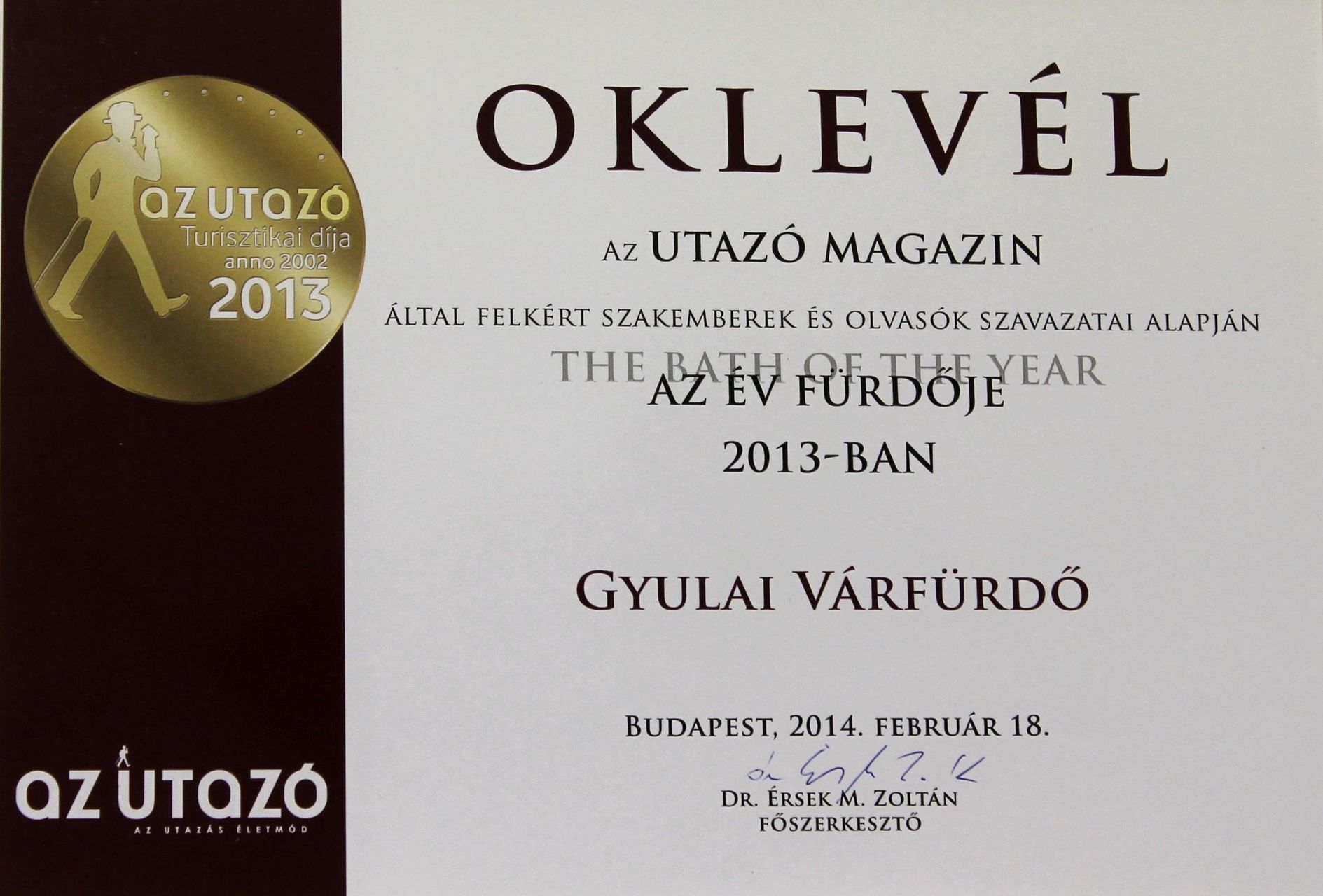 Az Utazó turisztikai díjának elnyerése elismerésként szolgál, és megerősíti a Gyulai Várfürdőt abban, hogy szolgáltatásainak színvonala megfelel a kor igényeinek és vendégei elvárásának – áll a várfürdő közleményében.
